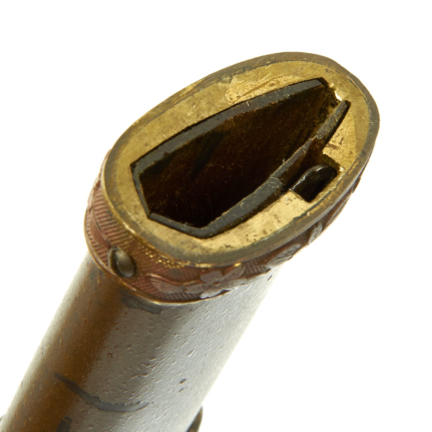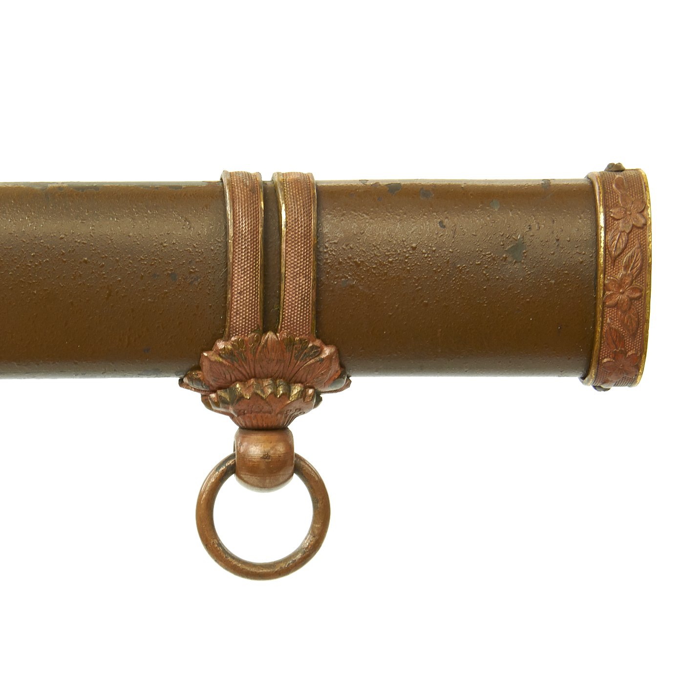 The blade mountings are the classic later WWII era Type 98 Army Shin-Gunto style, brass with gilt accents. Rounded tsuba (cross guard) with brass Imperial Army cherry blossom menuki (grip decoration), and a nice Kabuto-Gane (Pommel Cap). The cross guard and pommel cap have matching cherry blossom motifs, which are also found on the scabbard fittings, and the fuchi (grip collar). There are 4 Seppa (spacers) around the cross guard to keep the fit tight, and all are inleted for the scabbard lock. The lock itself unfortunately has lost the "hook" on the end, so it can no longer lock into the scabbard. The blade collar (habaki) looks to be brass alloy, maybe with some gilding.