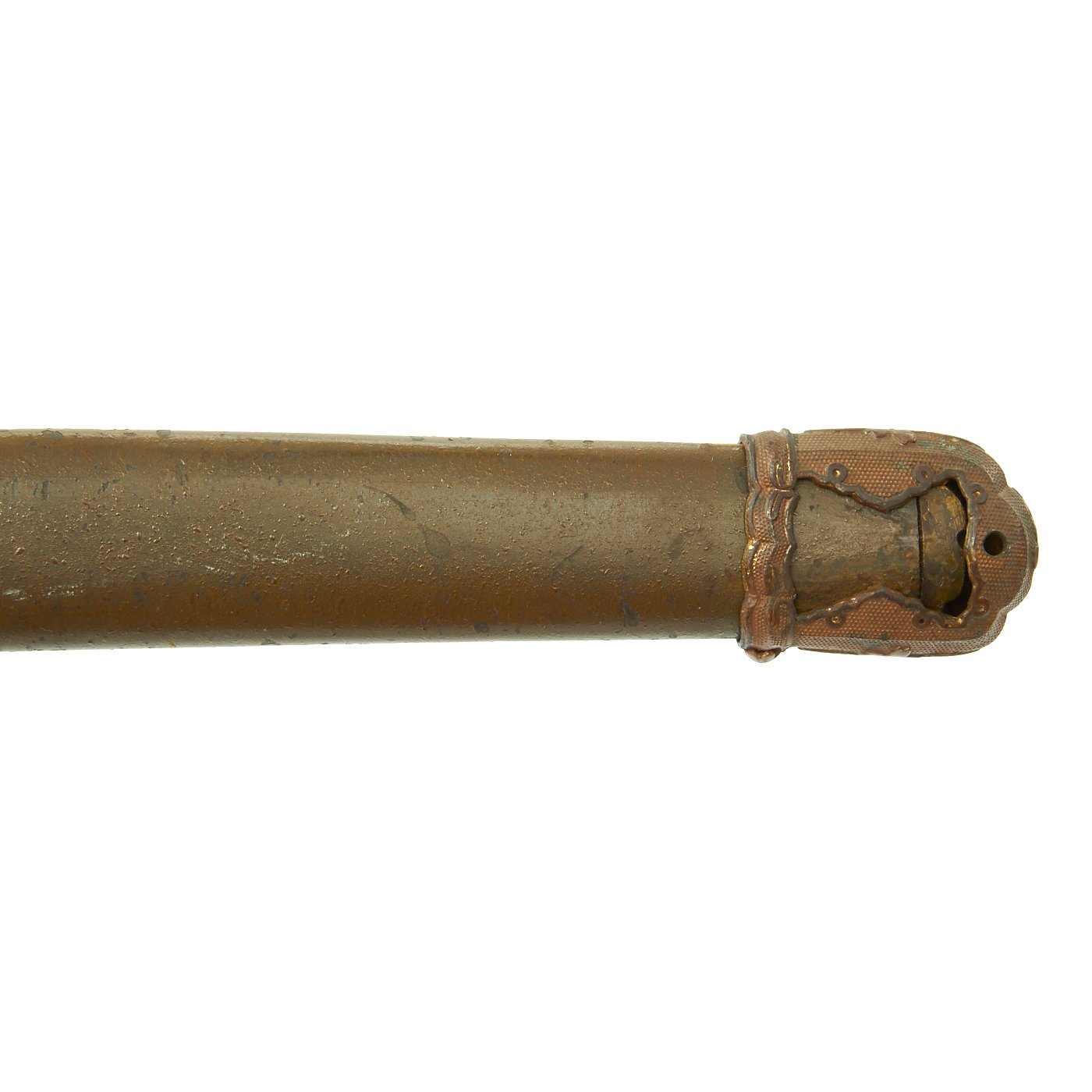 The handle (tsuka) has an nice faux stingray skin (Sa-Me) grip, which has unfortunately cracked a bit.. It has a complete Ito (cloth binding), which shows some just a bit of wear. The single bamboo securing peg is still present, and looks to be original. The Scabbard (saya) is steel and in very nice condition,with much of the original paint intact. It seems to be pretty much dent free, and has the correct single hanger loop of the Type 98 style. The top fitting is inleted for the scabbard lock on the hilt.