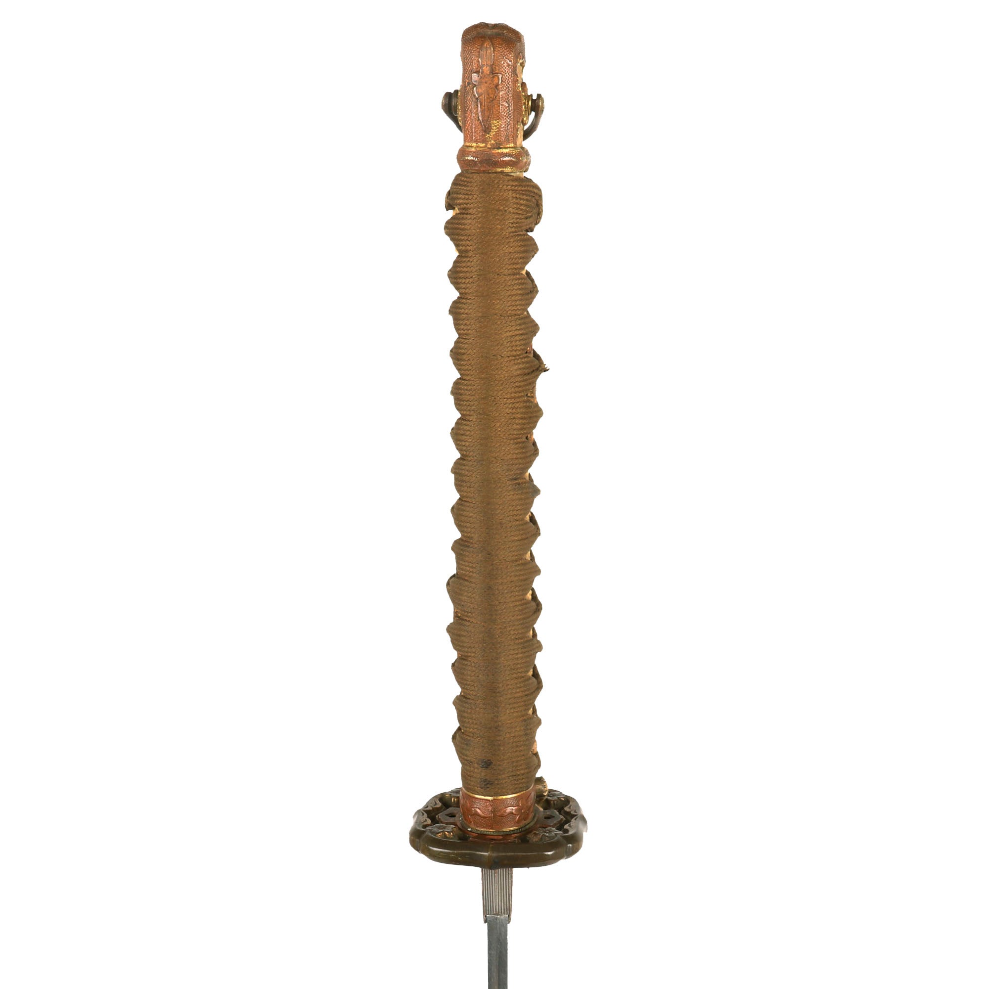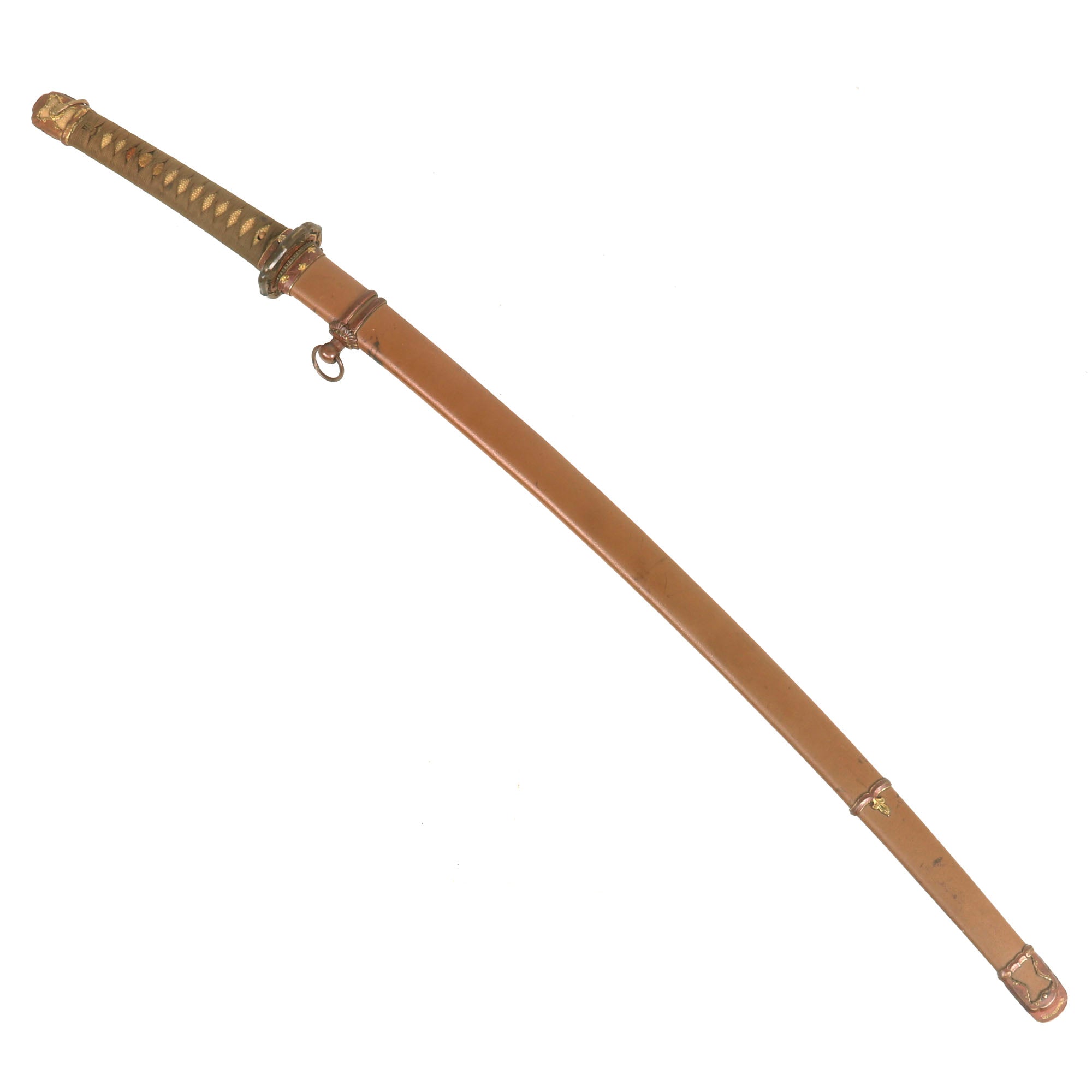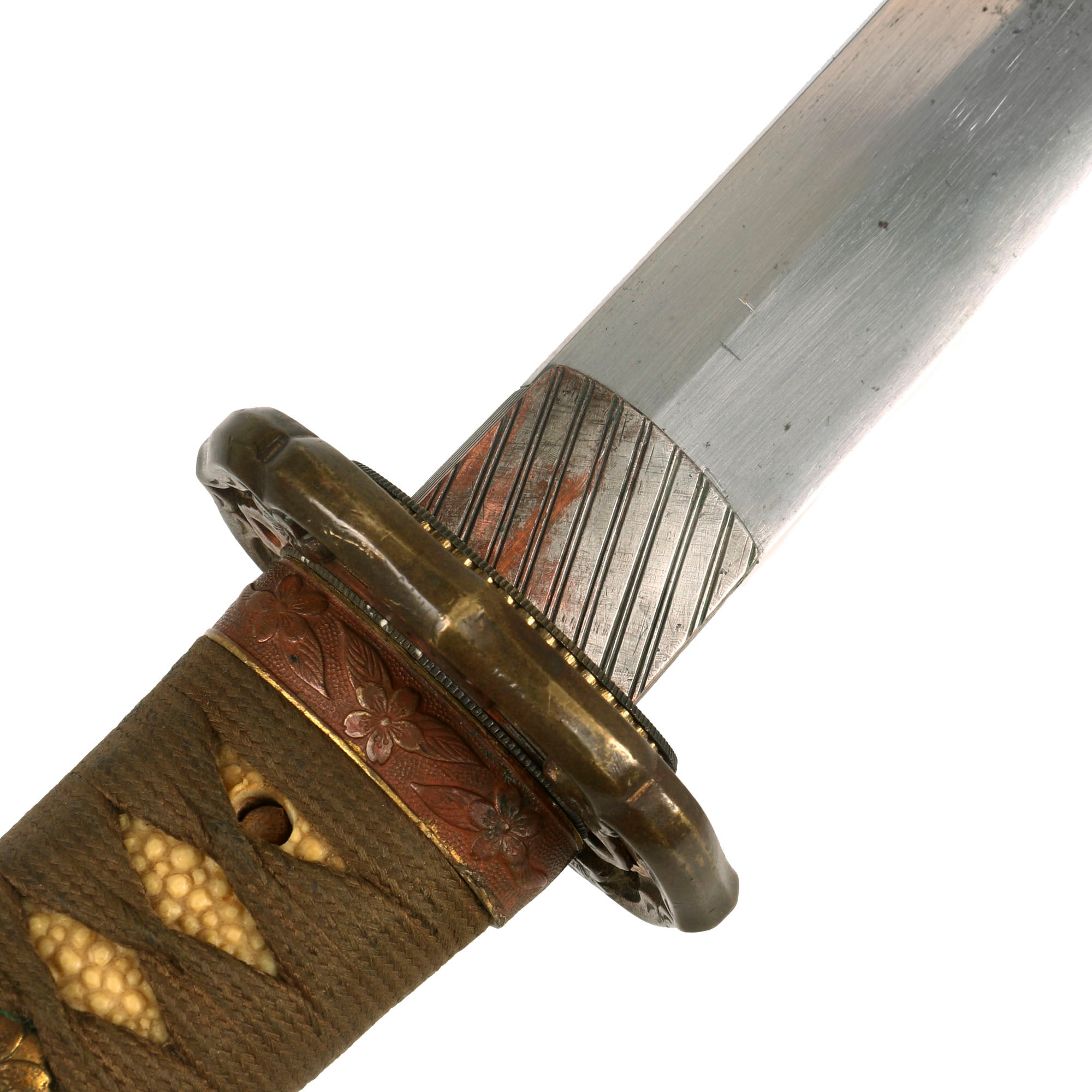 There are six metal seppa (spacers) around the tsuba to keep the fit tight. All are inlet for the scabbard lock, which is fully functional. The blade collar (habaki) looks to be plated copper, and definitely is not the typical WWII type, so it is probably from an earlier set of fittings, or possibly the original set. The handle (tsuka) has an great Sa-Me (Stingray Skin) grip, which is fully intact. It has a complete golden brown Ito (cloth binding), which shows only light staining and wear. There is a single wooden securing peg (mekugi) still present, which is definitely a display replacement.