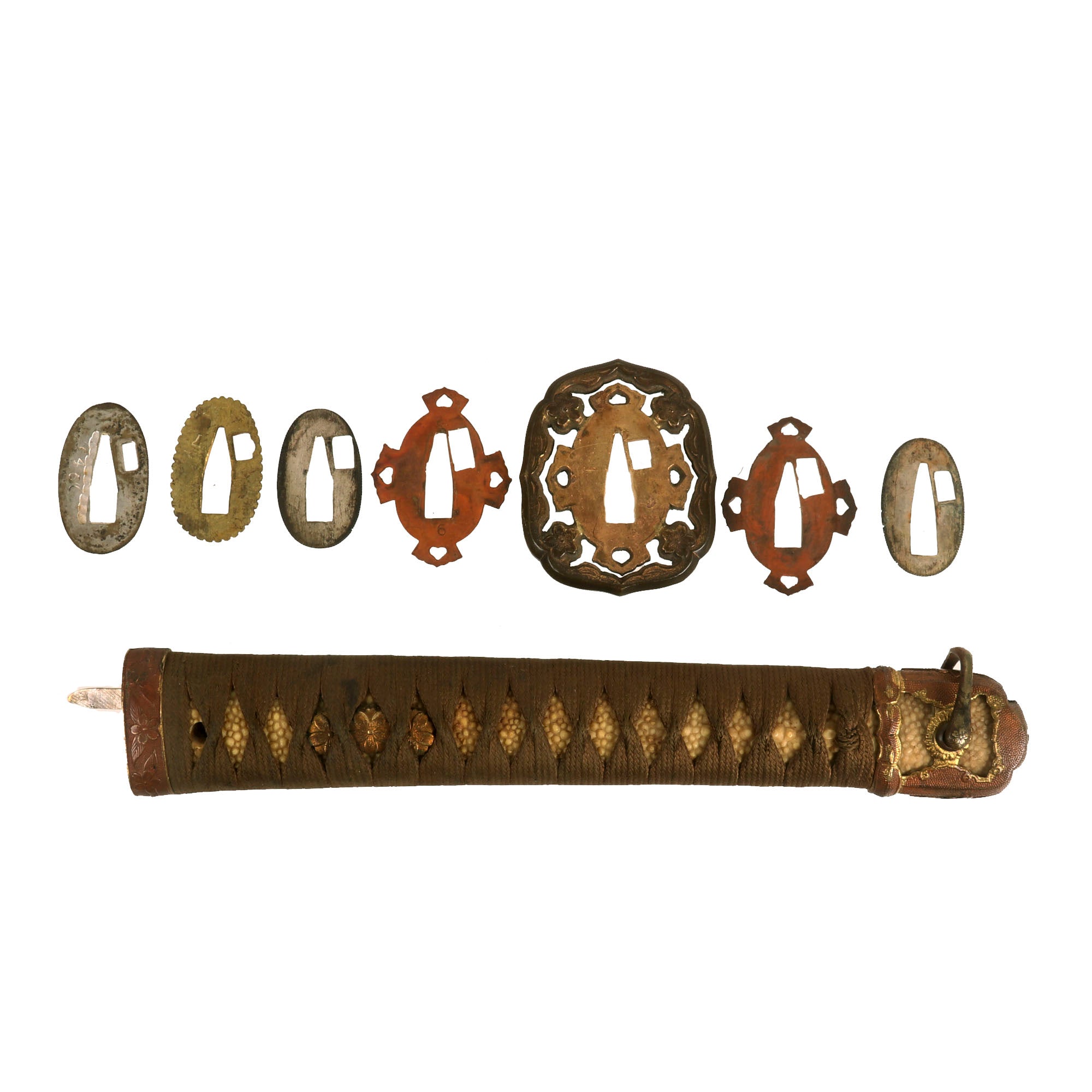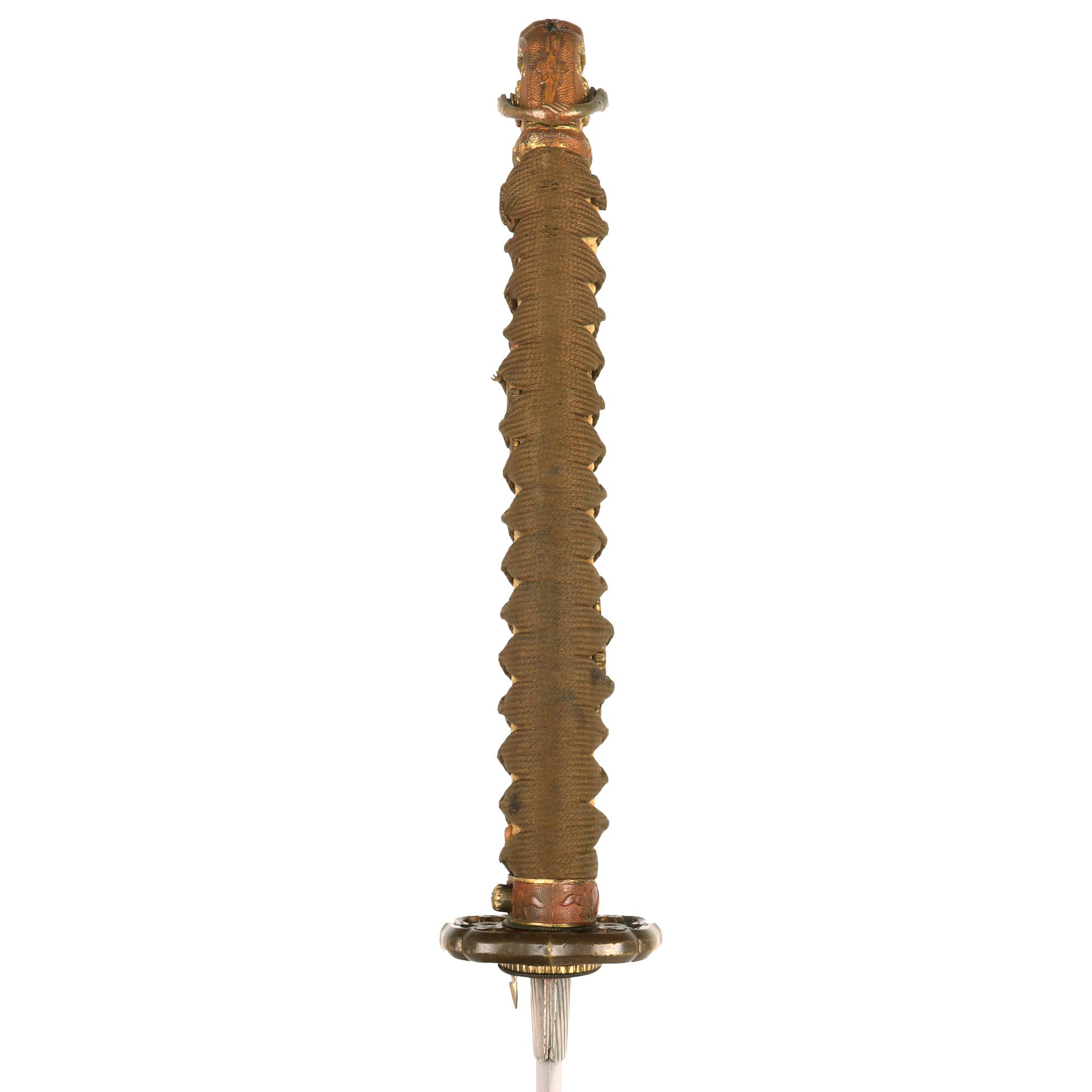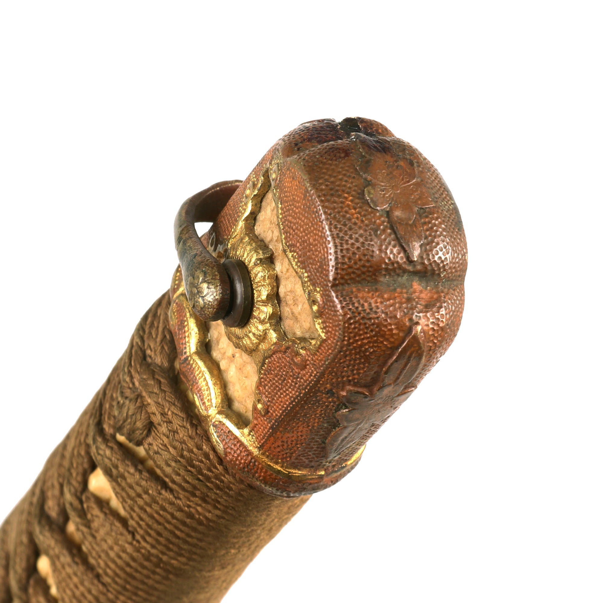 There are six metal seppa (spacers) around the tsuba to keep the fit tight. All are inlet for the scabbard lock, which is fully functional. The blade collar (habaki) looks to be plated copper, and definitely is not the typical WWII type, so it is probably from an earlier set of fittings, or possibly the original set. The handle (tsuka) has an great Sa-Me (Stingray Skin) grip, which is fully intact. It has a complete golden brown Ito (cloth binding), which shows only light staining and wear. There is a single wooden securing peg (mekugi) still present, which is definitely a display replacement.