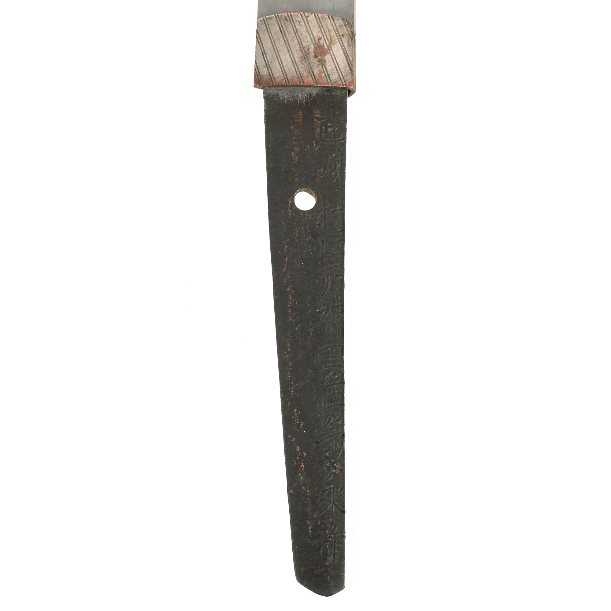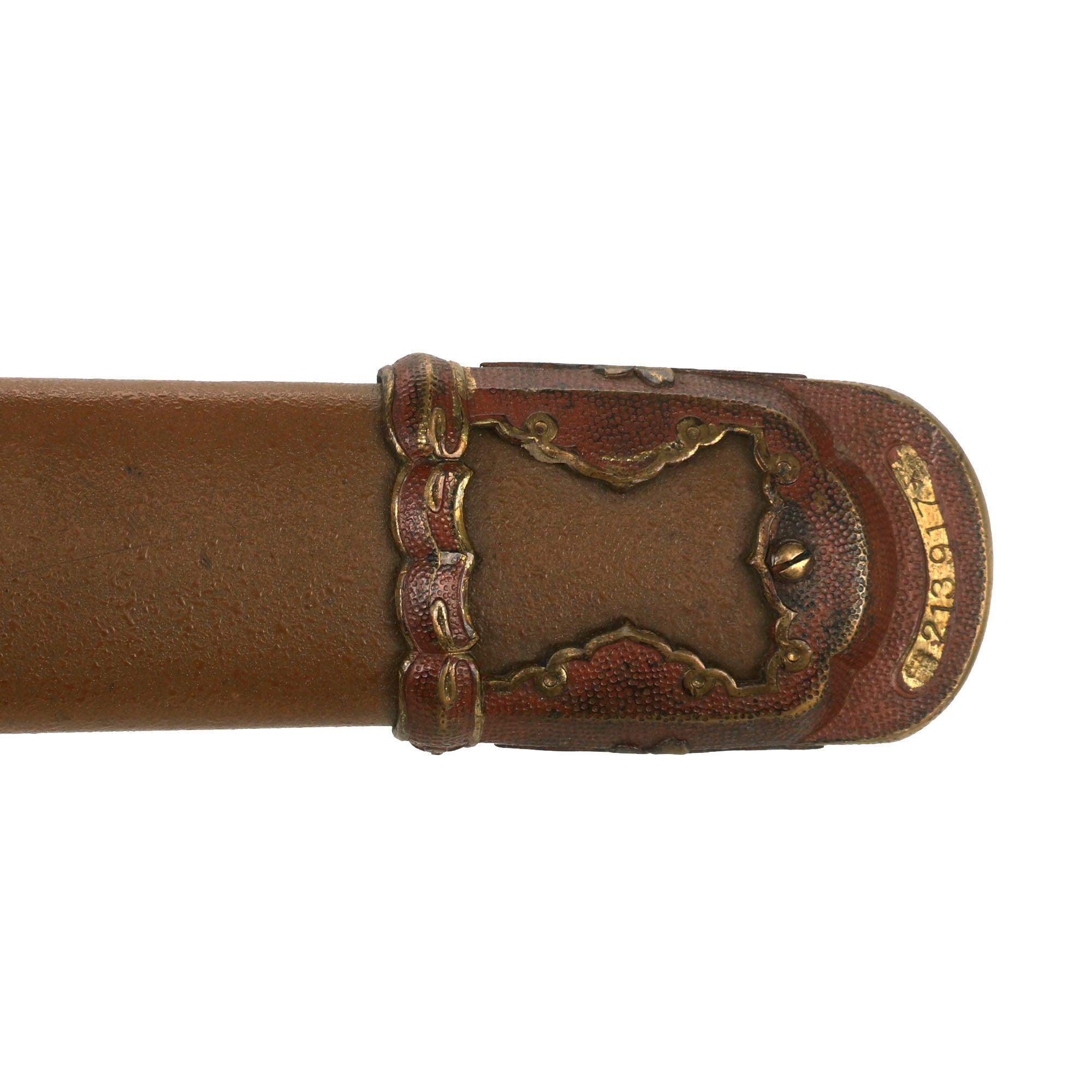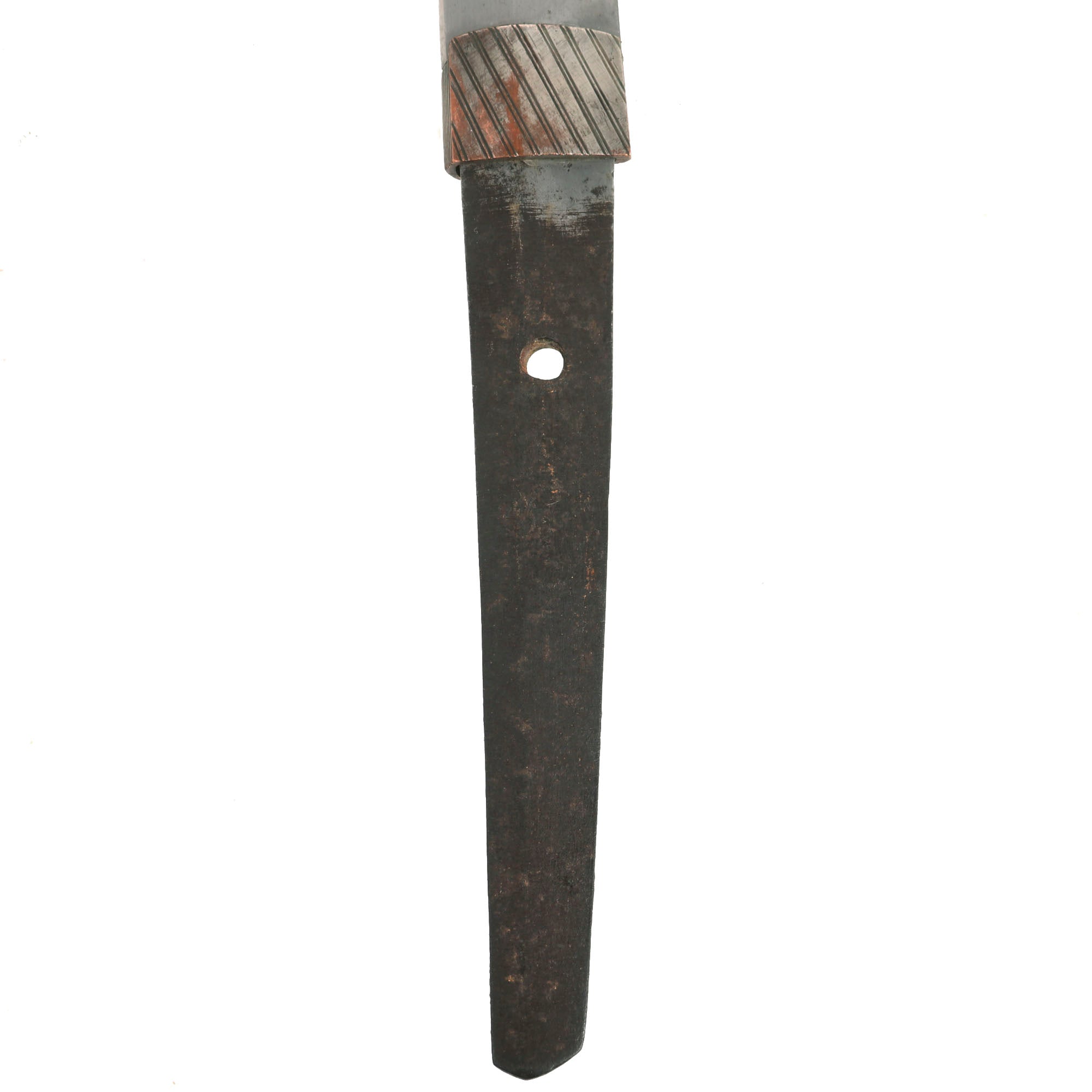 The Scabbard (saya) is steel over wood, and in very good condition, with almost all of the original textured paint intact. It has only a few small scrapes, though there is a dent on the left side just above the semegane scabbard ring, though this does not interfere with sheathing the blade at all. The scabbard has the correct single hanger loop of the Type 98 style. The top fitting is inlet for the scabbard lock on the hilt, and the lock works correctly. Interestingly, there is a "keel" on the bottom of the sayajiri scabbard tip, something we have not seen before.