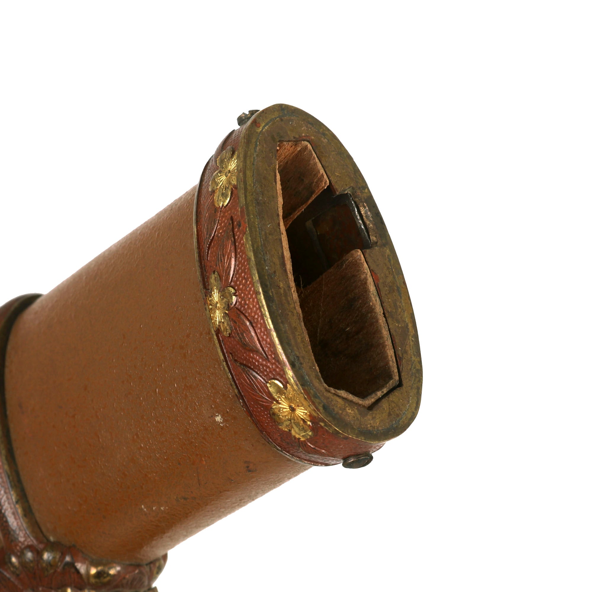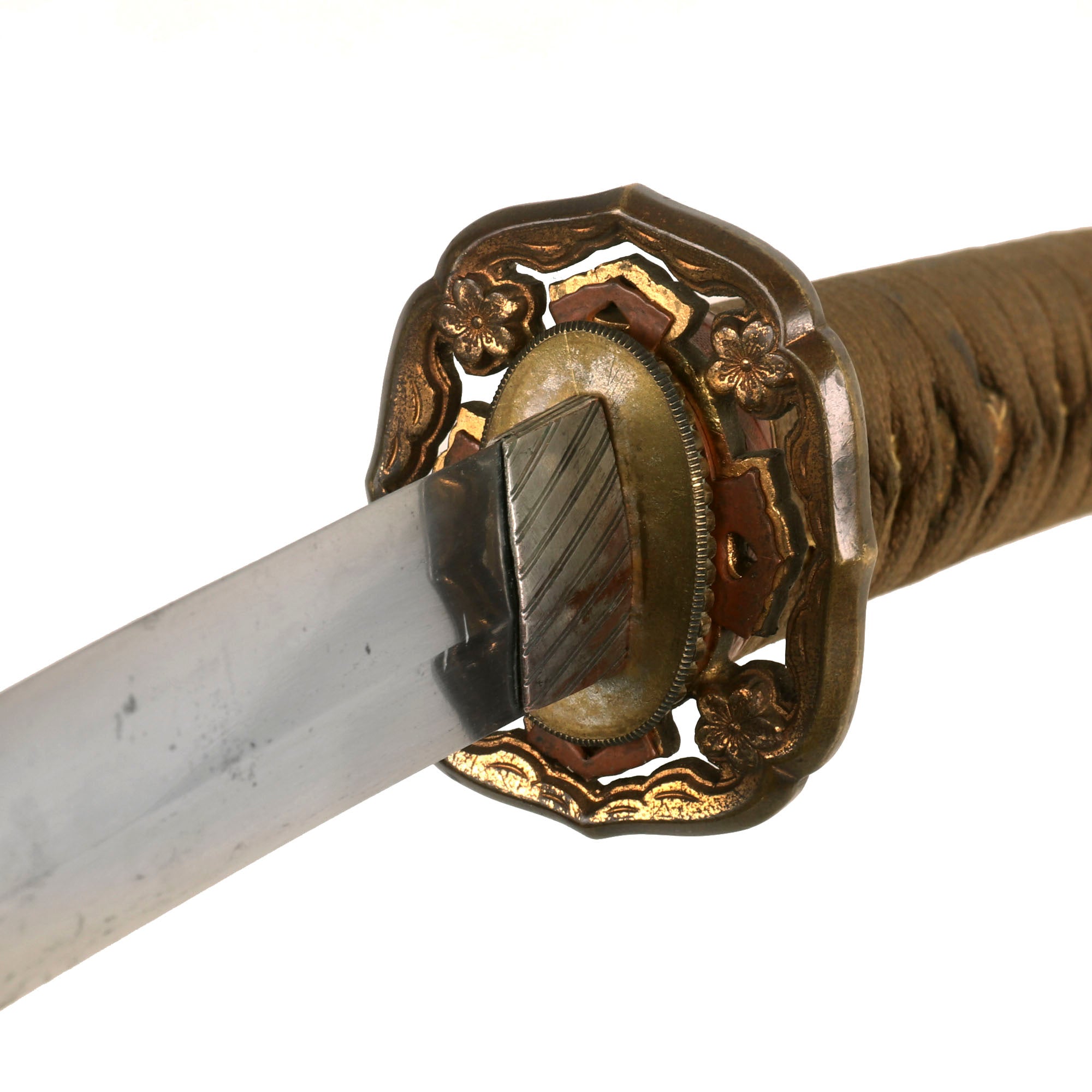 The blade mountings are the classic WWII era "high grade" Type 98 Army Shin-Gunto style, brass with gilt accents, which are actually still retained in many areas! It has the typical rounded "quince" (mokko gata) shaped tsuba (cross guard), which is a high grade "perforated" style. The handle features brass Imperial Army cherry blossom menuki (grip decoration), and a nice Kabuto-Gane (Pommel Cap) with a brass end loop. The cross guard and pommel cap have matching cherry blossom motifs, which are also found on the scabbard fittings, and the fuchi (grip collar).