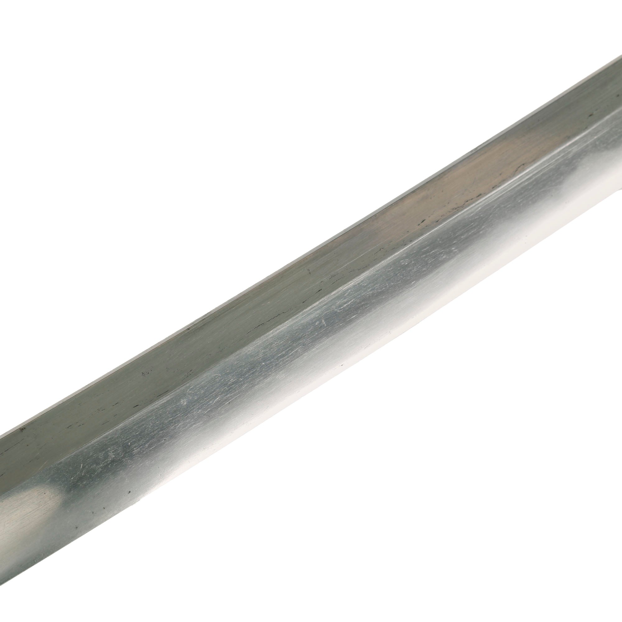Offered in very good condition, the blade is still quite sharp in many areas, so it should be handled with care. There are no nicks on the edge that we can see, just some wear from the scabbard in areas, though there is an area on the edge where it is somewhat blunt, possibly from removal of some dents. The polish is in very good condition with some scuffing and staining scattered overall. Aspects of the blade are relatively easy to see in the light, though it does look like it was cleaned with uchiko powder since last polishing. Blade length is approximately 28 ⅛ inches and overall length 38 ⅞ inches. The katana has a handmade blade with a Futsu 普通 (regular) Nakago (tang) with Haagari (asymmetrical rounded) nakago-jiri (tang tip.