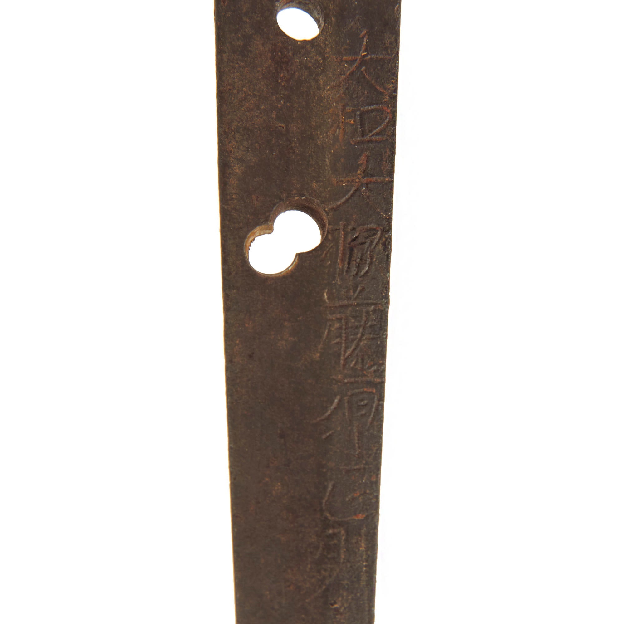 The blade on this example was hand forged in the traditional manner, and the tang of the blade is signed (Mei) with the characters 大 和 大 掾 藤 原 正 則 - YAMATO DAIJŌ FUJIWARA MASANORI. There were two smiths who used this particularly signature, which is mostly honorifics referring to their skill. Both were based in Echizen province (越前国, Echizen-no-kuni), and had a Master and Pupil relationship, and it was very common for the name to be passed down. The earlier Masanori was active in the early 17th Century, and is rated 50 by Hawley, while the second is rated 25 by Hawley, and at ¥5.5M by Toko Taikan. These are both quite highly rated smiths, making this a very desirable blade.