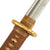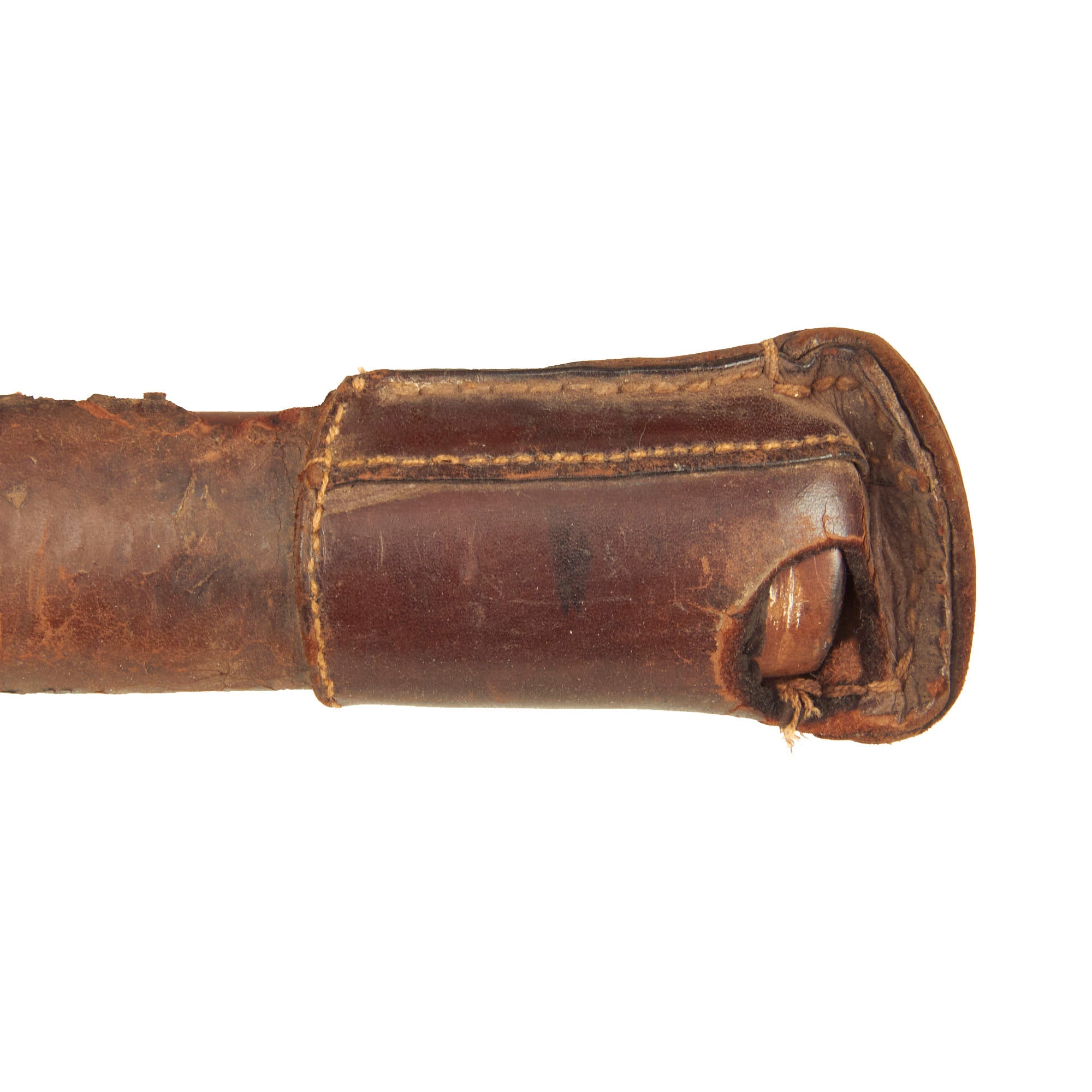 The Scabbard (saya) on this example is wood, covered with a brown finished leather field cover, often seen on swords refit later in the war, as they required far less materials and production time. The cover is however in relatively poor condition, with the stitching split along almost the entire length, and the upper 4 inches or so missing. It has been secured with electrical tape, apparently long ago, as the adhesive is failing. There is also a brass hanger loop on a fitting, which is no longer attached firmly to the scabbard.