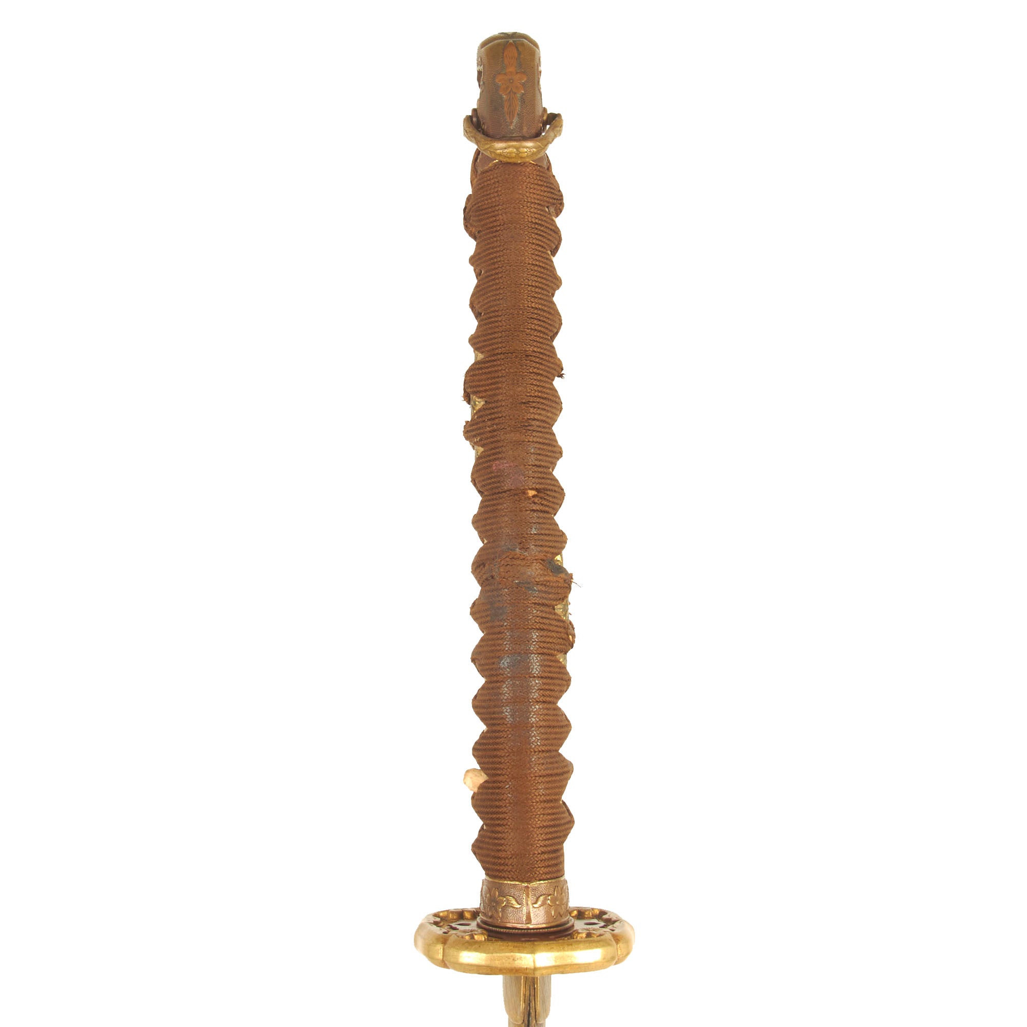 The handle (tsuka) has a great stingray skin (Sa-Me) grip, with the correct golden brown Ito (cloth binding). There is some staining on the wrapping from sweat and oil, with a bit of fraying on the more raised portions. There is also a glued repair over one of the menuki. The embossed brass end loop of the tsuka is still present, and the single mekugi (peg) looks to be original.