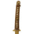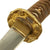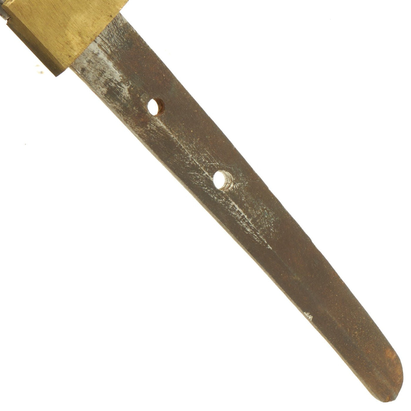 The blade mountings are the classic later WWII era Type 98 Army Shin-Gunto style, brass with gilt accents. Rounded "quince" shaped tsuba (cross guard) with brass Imperial Army cherry blossom menuki (grip decoration), and a nice Kabuto-Gane (Pommel Cap). The cross guard and pommel cap have matching cherry blossom motifs, which are also found on the scabbard fittings, and the fuchi (grip collar). There are 2 Seppa (spacers) around the cross guard to keep the fit tight. The tsuba and seppa are cut for a leather scabbard strap, but there is not one present. is The blade collar (habaki) looks to be the standard brass alloy.
