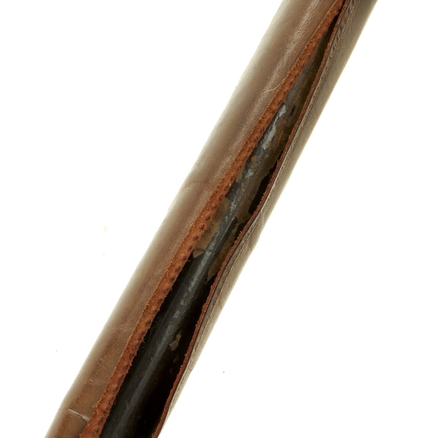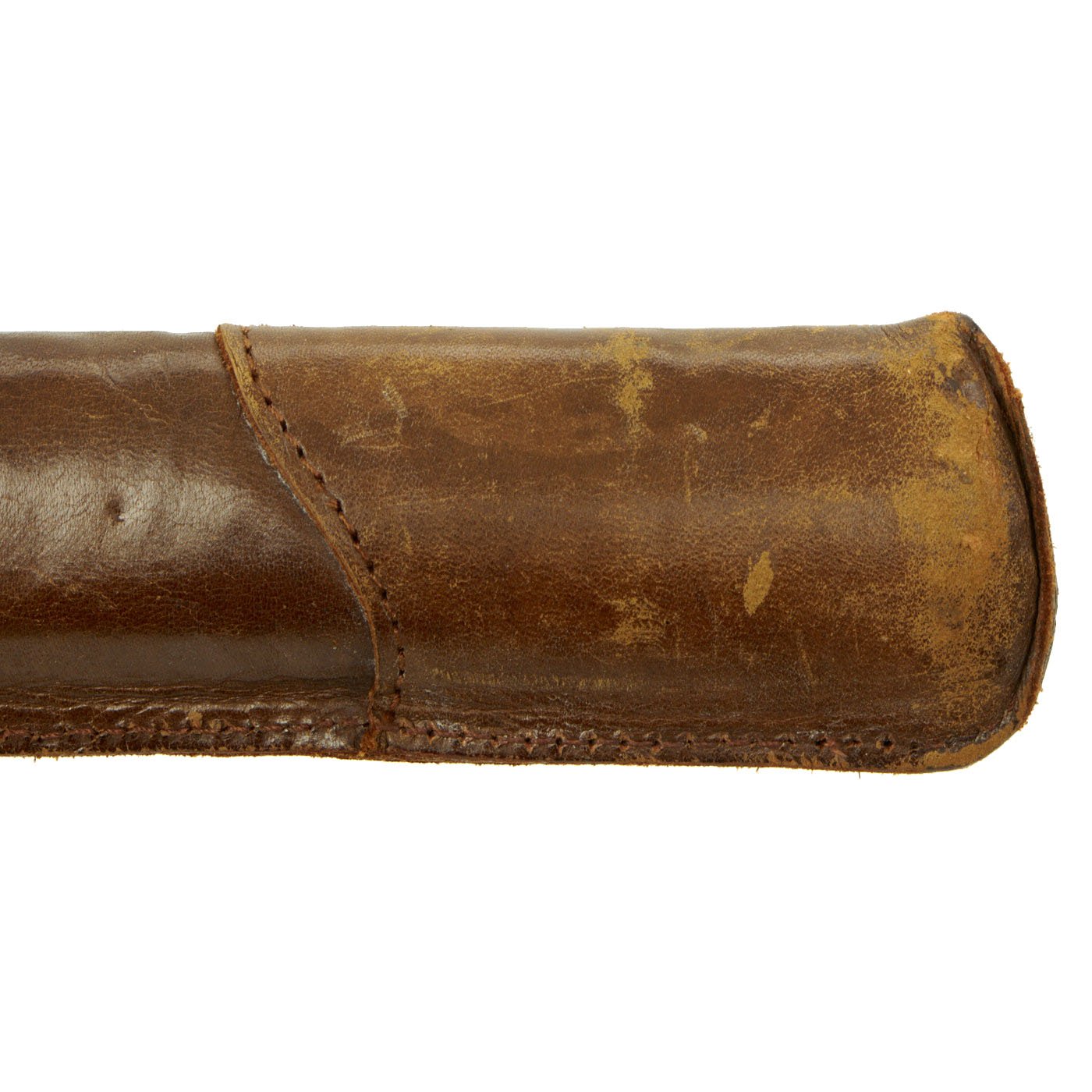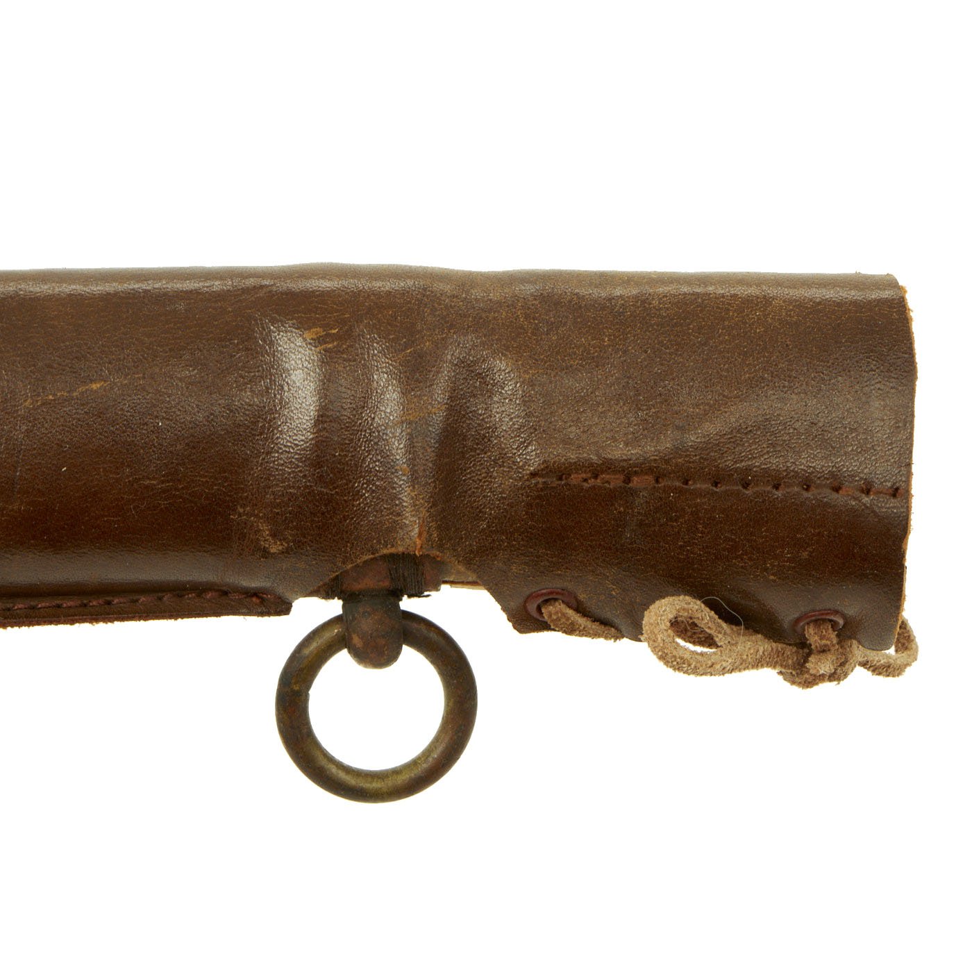 The handle (tsuka) has an nice stingray skin (Sa-Me) grip, which is fully intact. It has a complete Ito (cloth binding), which shows light use and staining. There is a single wooden securing peg (mekugi) still present, which looks to be original. The Scabbard (saya) is a standard black lacquered wood type, covered with a leather field cover. It has a single metal hanger ring. The leather cover is in good shape, showing only light wear to the leather itself. The stitching on the cover however has not held up as well, and the seam is split for a good portion of the length of the scabbard.