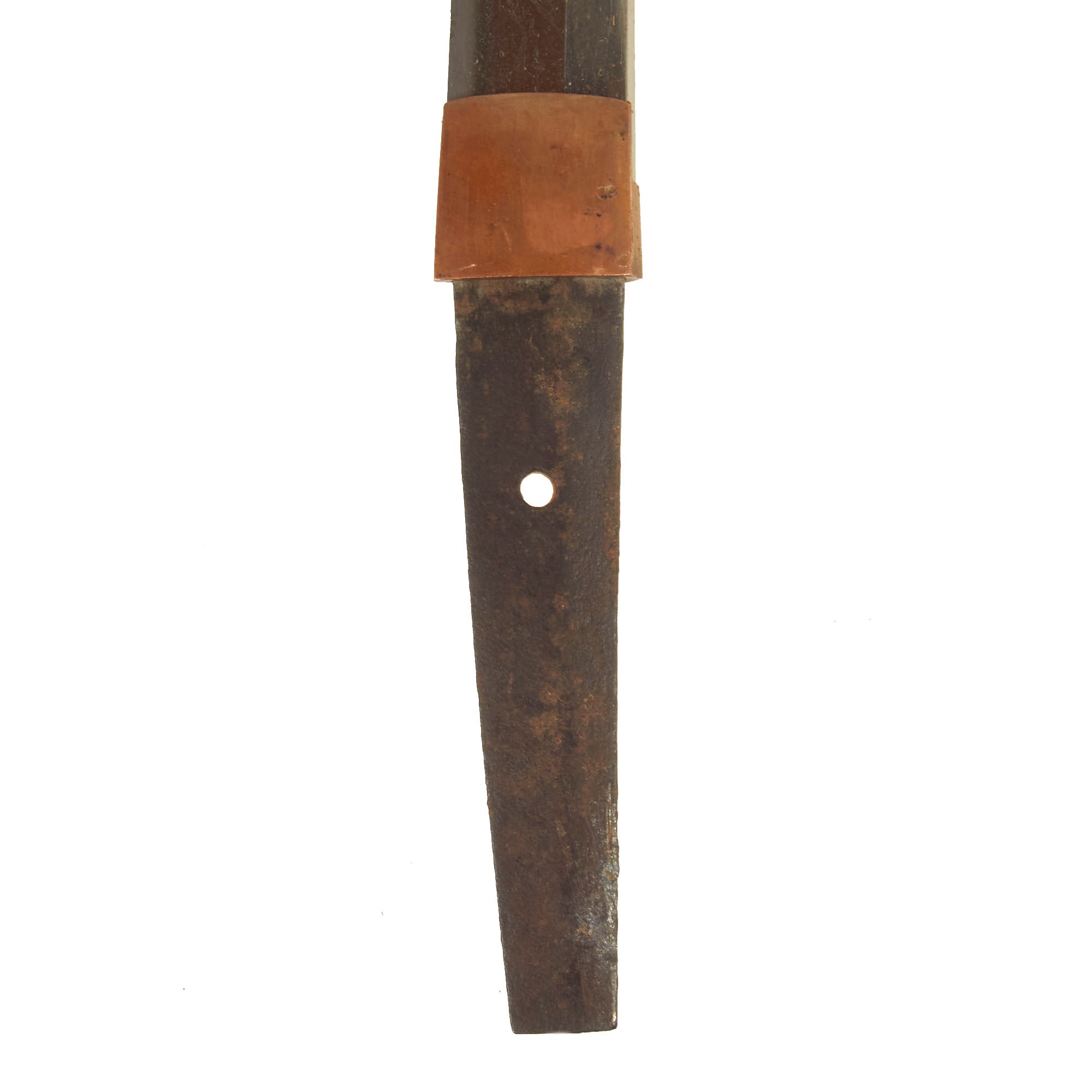 - Punched (not drilled) hole in tang, which shows great age, having been shortened into the original body of the blade.
