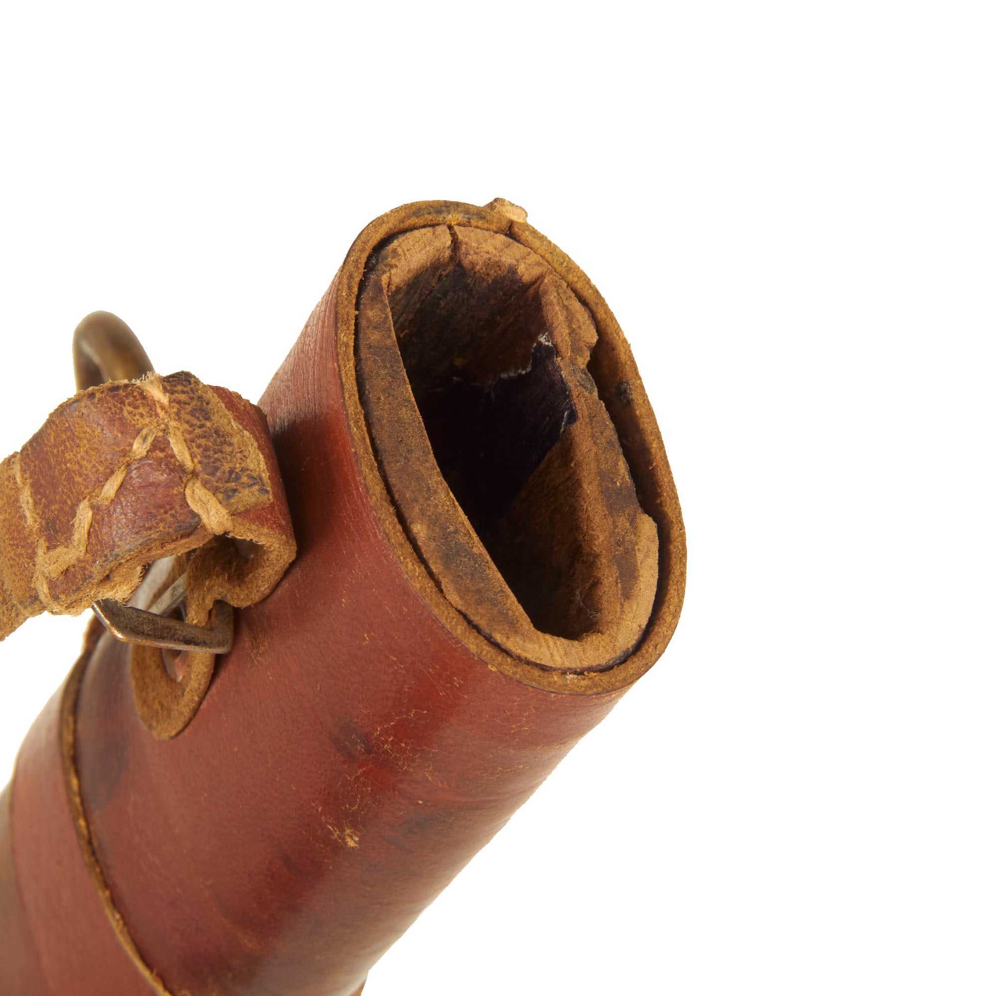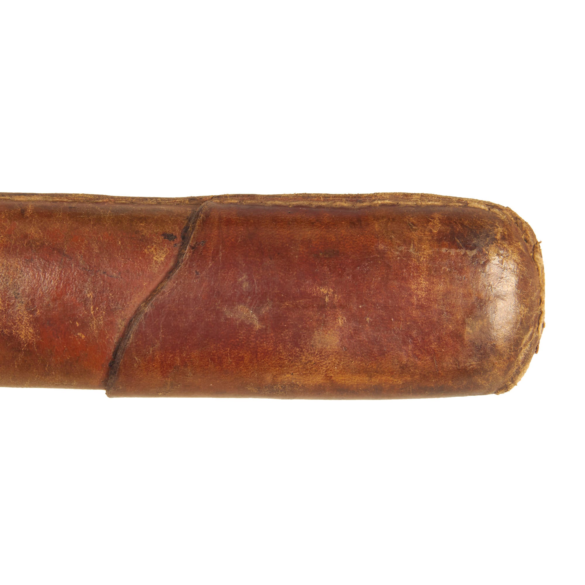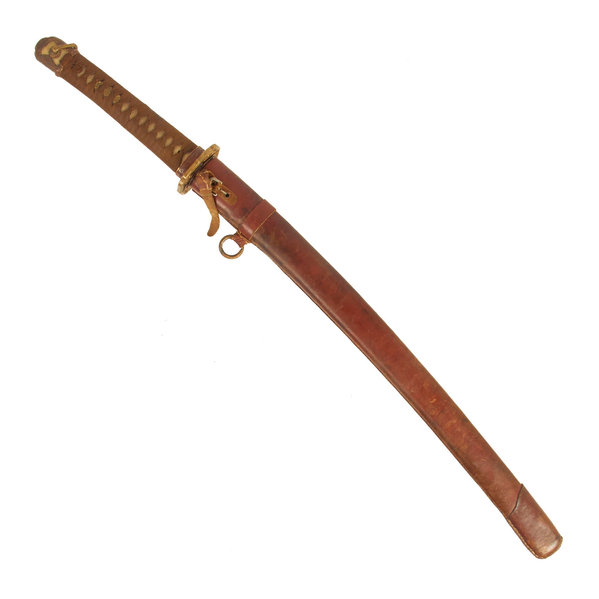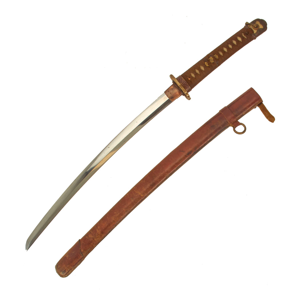 The Scabbard (saya) on this example is wood, covered with a brown leather field cover, often seen on swords refit later in the war, as they required far less materials and production time. We can see that the scabbard has a slot for a kogatana accessory knife, so it was probably the one that came with the wakizashi. This type of cover was sewn directly around the scabbard, and has a leather securing loop for the brass hanging loop. There is also a leather strap with a buckle on it, which can be used to secure the scabbard to a hole in the tsuba.