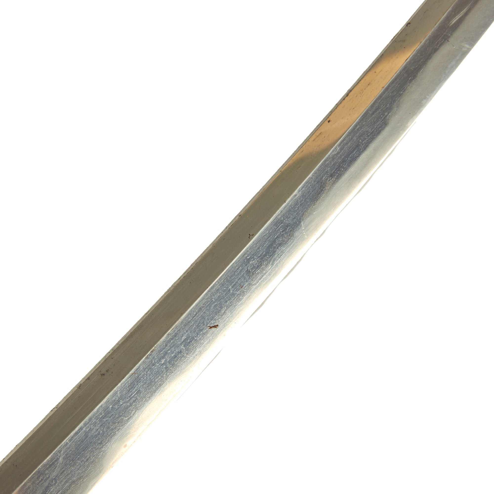 Blade length is approximately 18 5/8 inches and overall length 28 3/4 inches. This classifies the sword as a long wakizashi (Japanese: 脇差, "side inserted [sword]"), which is a shorter version of the Katana, with a blade length between 12 and 24 in. Katanas must be longer than 2 shaku (Japanese: 尺), which is approximately 12 inches in length. We have seen a few wakizashi before in Shin-Gunto fittings, most likely family blades. As the length is on the longer side, and the blade is the "Shinogi-Zukuri" shape, some would term this an "O-Wakizashi".