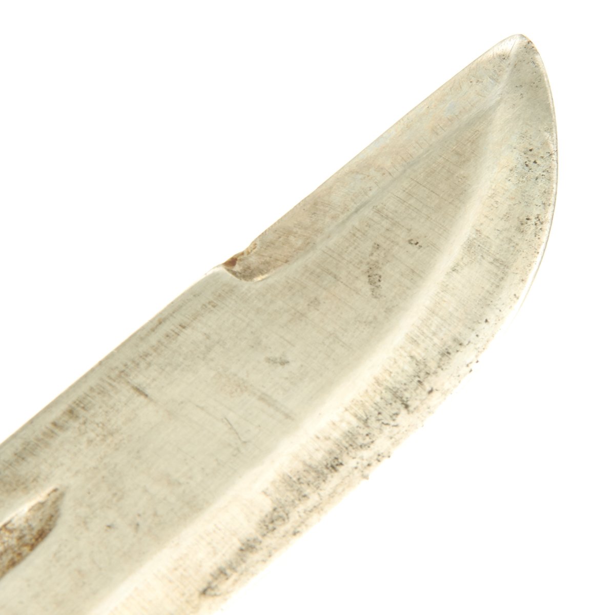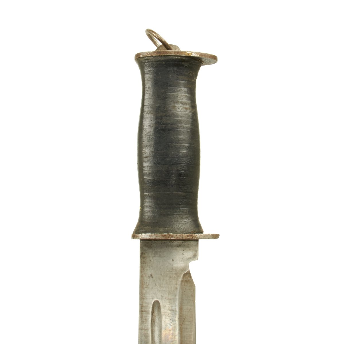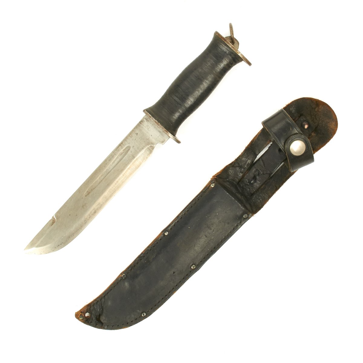 This knife appears to be only slightly used. The blade is rust-free; the tip is intact though slightly worn. Stacked leather washer handle with steel guard and pommel; all washers are tight; pommel also tight which is rare for this large variation.