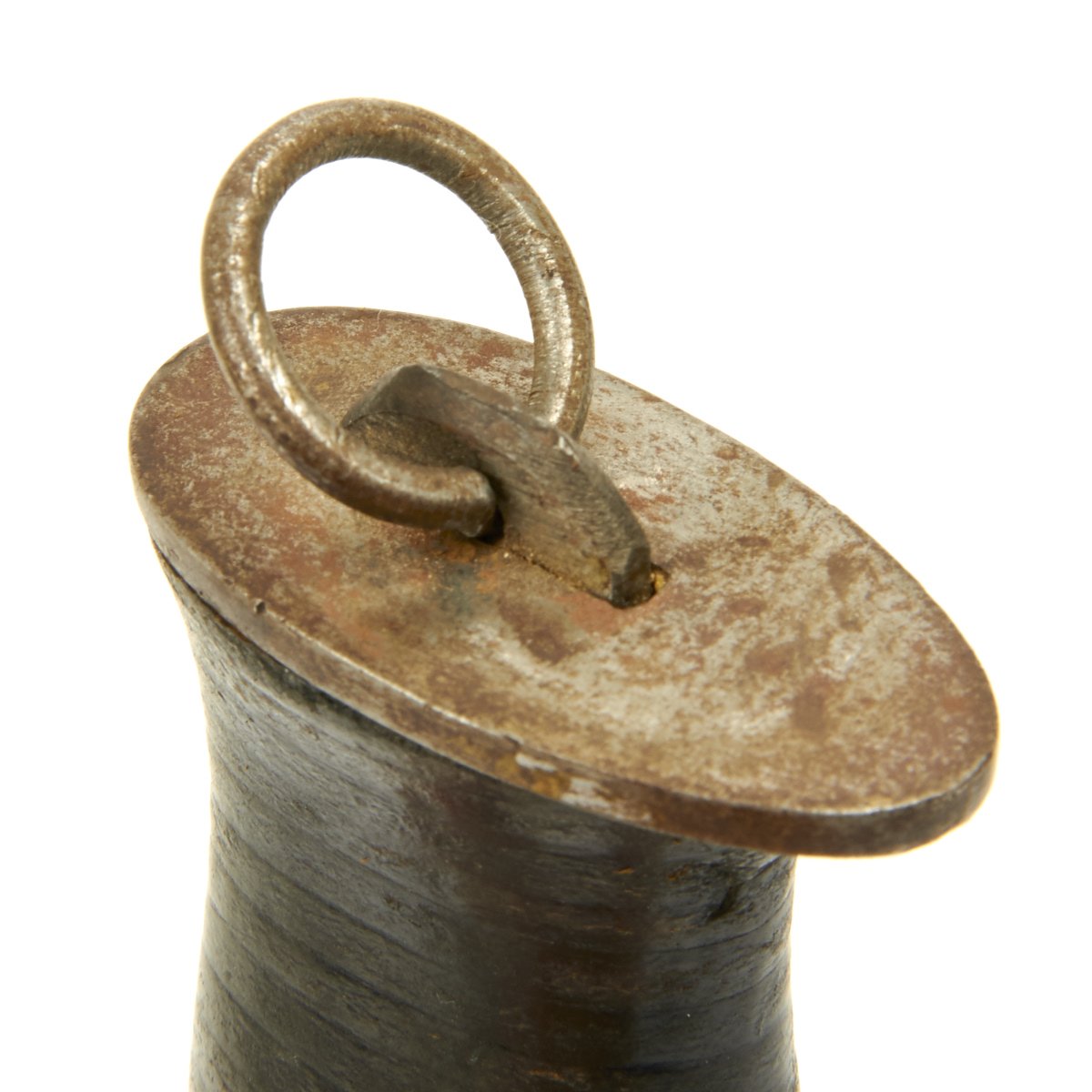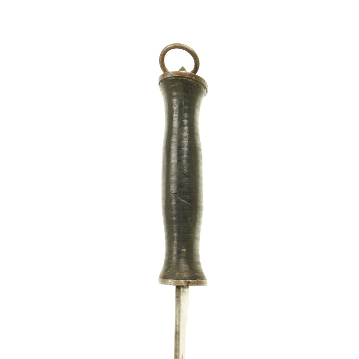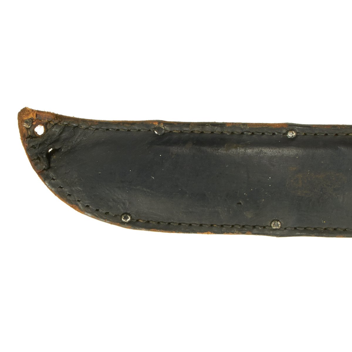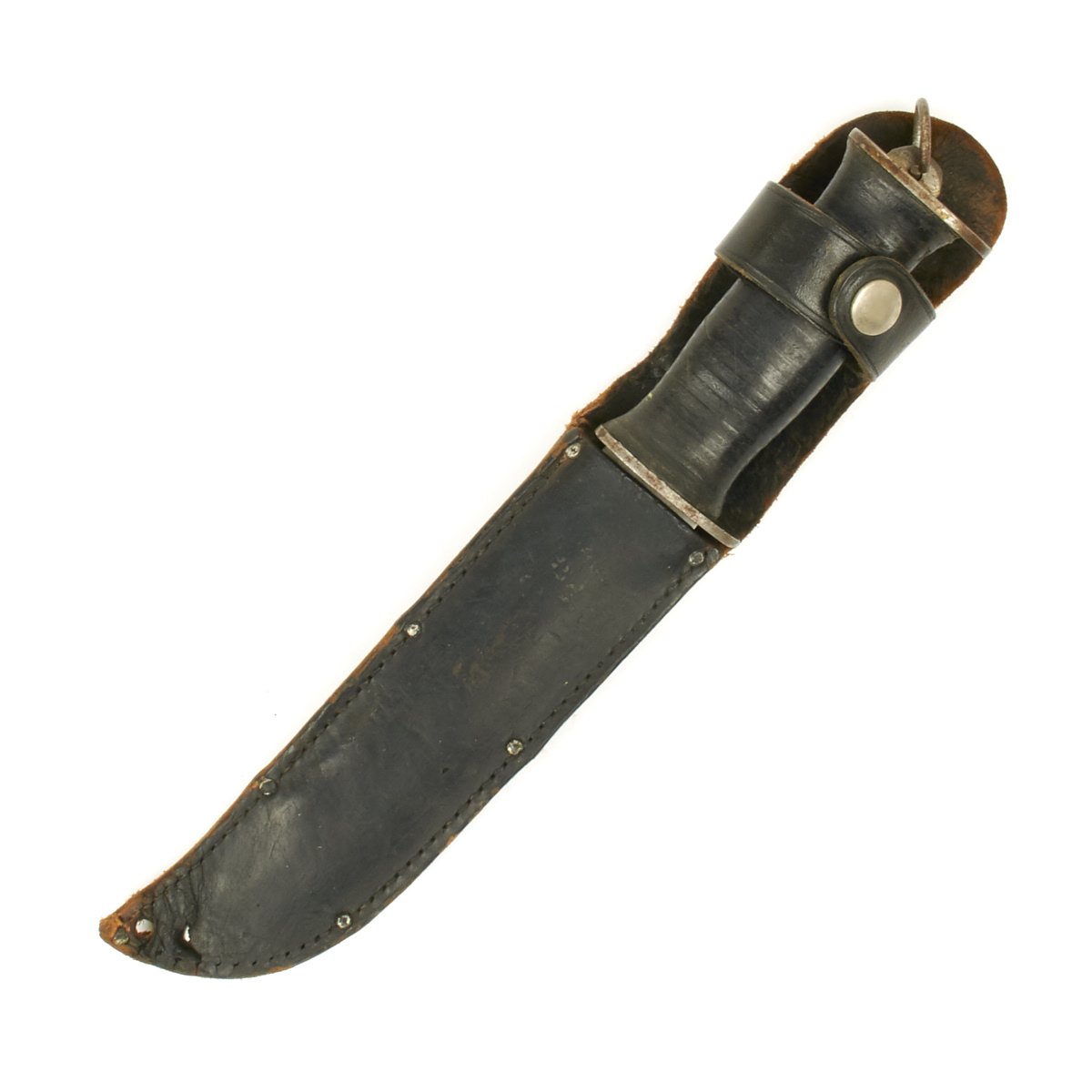 This knife appears to be only slightly used. The blade is rust-free; the tip is intact though slightly worn. Stacked leather washer handle with steel guard and pommel; all washers are tight; pommel also tight which is rare for this large variation.