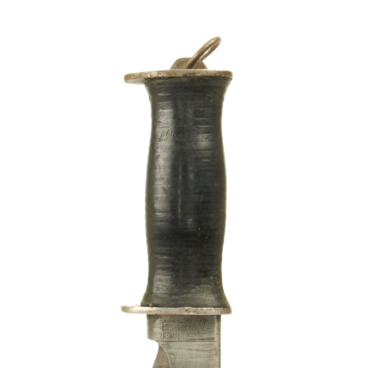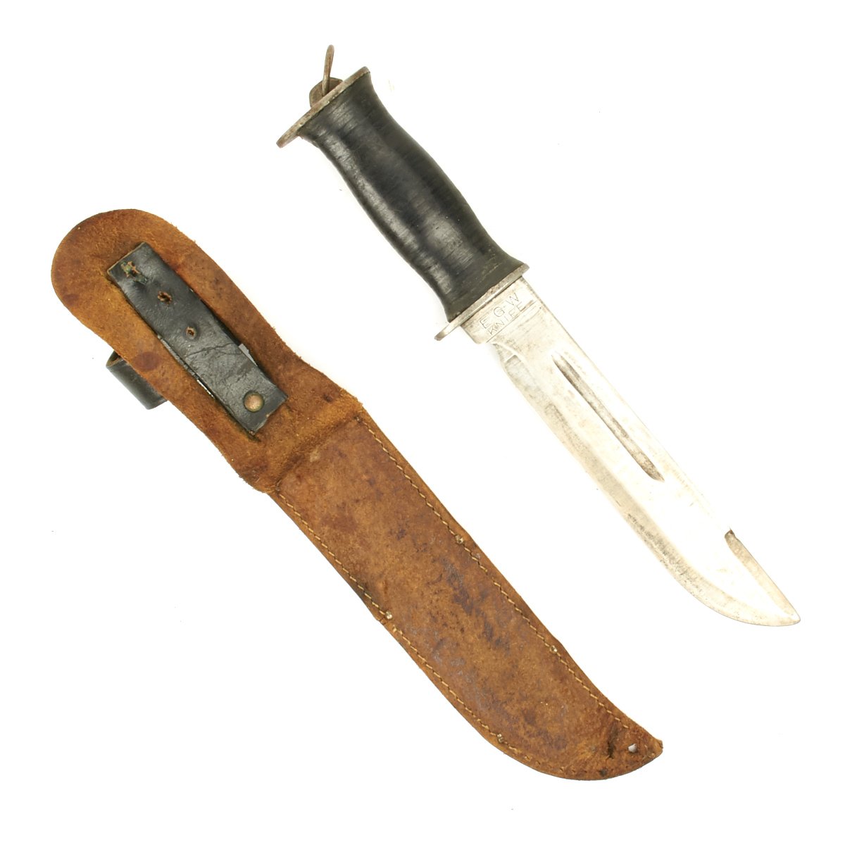 E.G.W Offered in very nice condition this genuine E.G. Waterman Company of New York City produced WWII fighting knife was very popular among USGI during WW2. Multiple variations were made with both wood and leather handles (see page 165 of U.S. Military Knives Collector's Guide By Silvey & Boyd) this is the more desirable leather washer handle version.