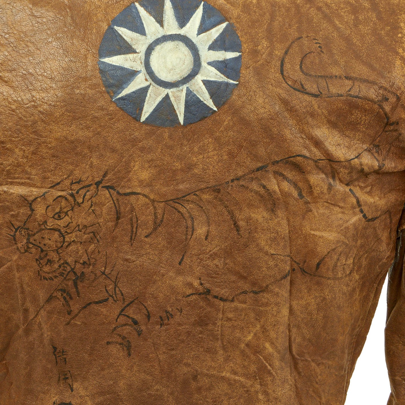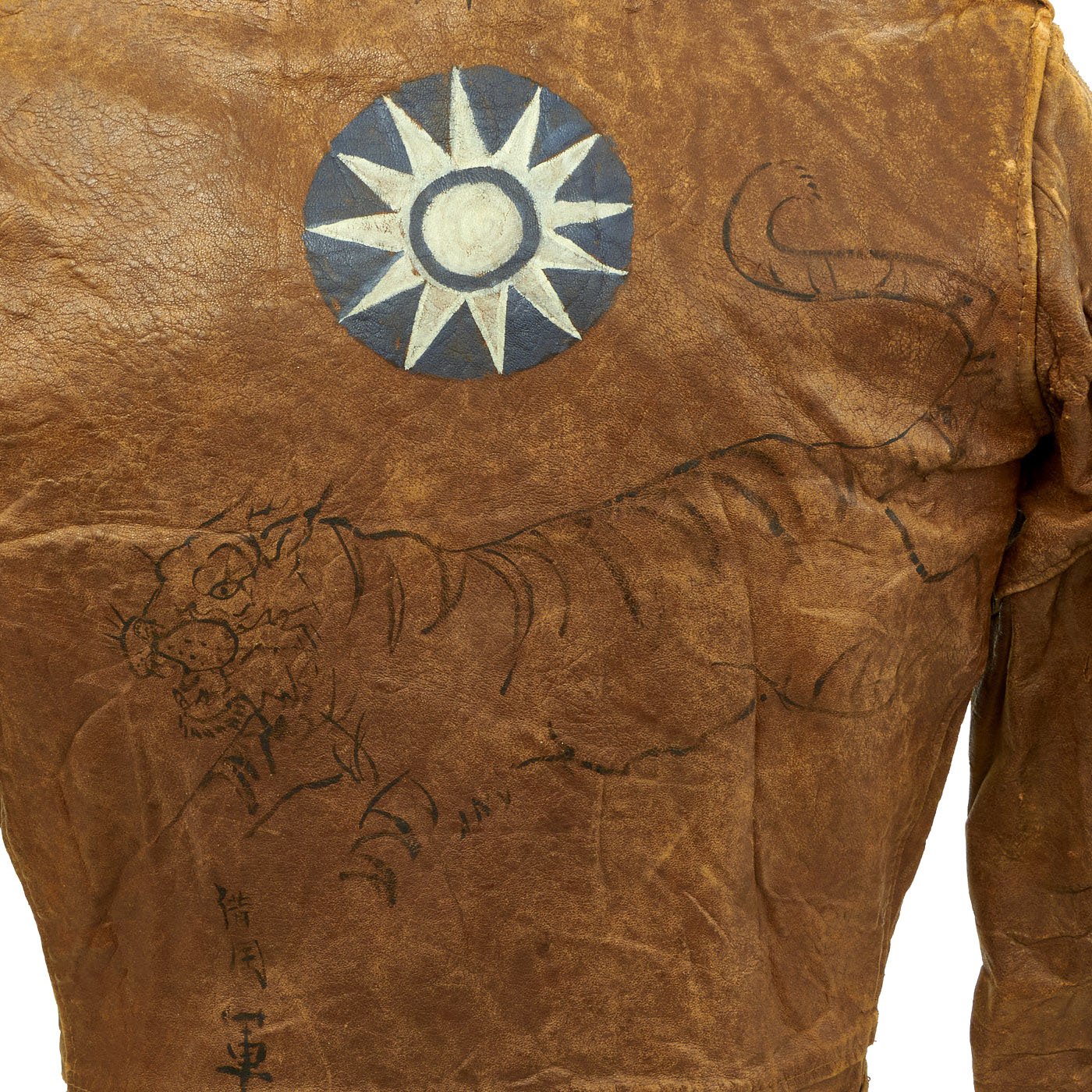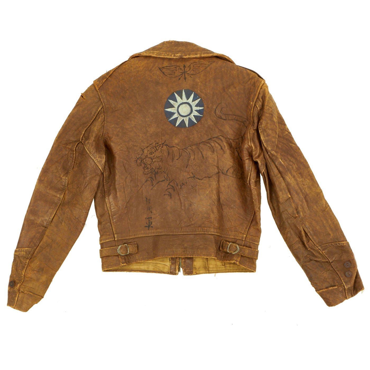 Original Item: One of a Kind. Incredibly scarce WWII Chinese Pilot’s Jacket. Quite possibly worn by an American Aviator serving with the American Volunteer Group (AVG), also known as the “Flying Tigers”. This jacket features some incredible period applied artwork, consisting of a large rampant tiger, Chinese characters, a Chinese Aviation Section Major’s Wing, and a full color Kuomintang Sun emblem painted on the back. The polished cotton lining also has some Chinese characters and the number “48” written inside. There is evidence that there was a tag sewn into the nape of the neck of the lining, but that is now missing. Jacket is cut similar to that of a British Battledress Jacket; Two pleated chest pockets, and an integral belt at the waist. Buttons are crudely fashioned from leather. The Jacket was secured via a zipper on the front, however, sadly, the zipper pull is not present. Jacket shows signs of heavy wear, but displays fabulously.
