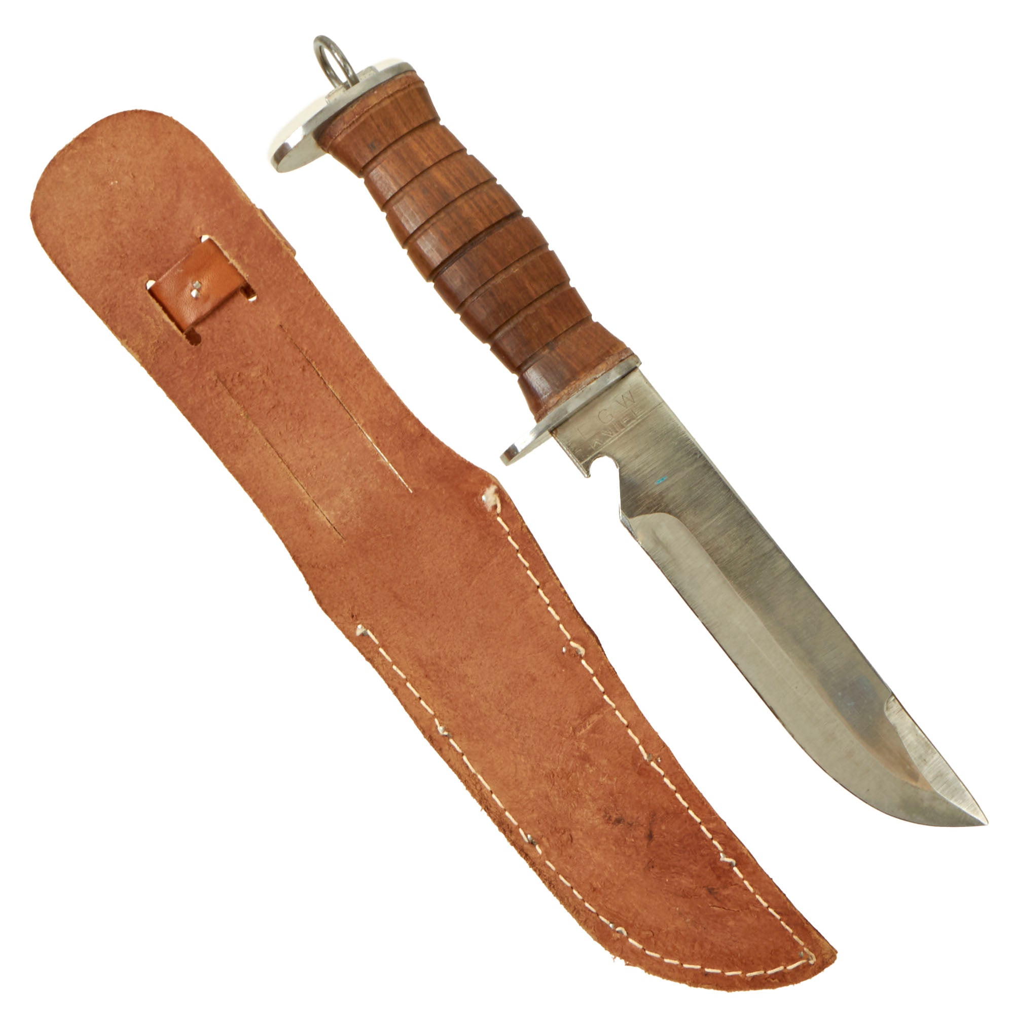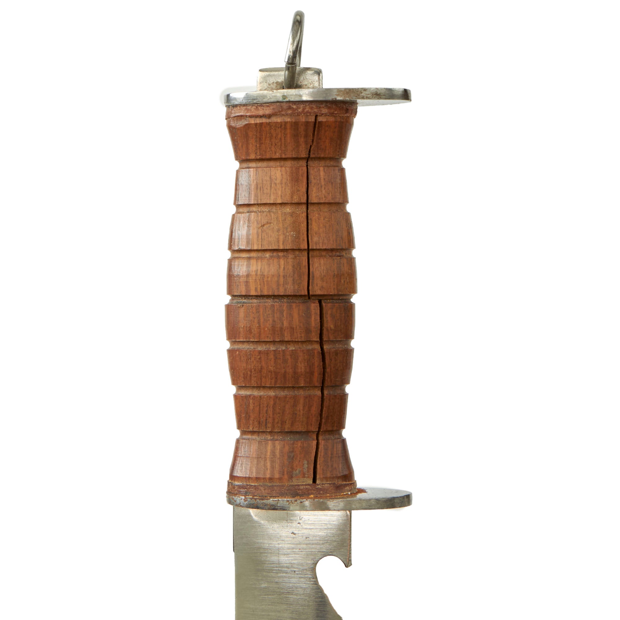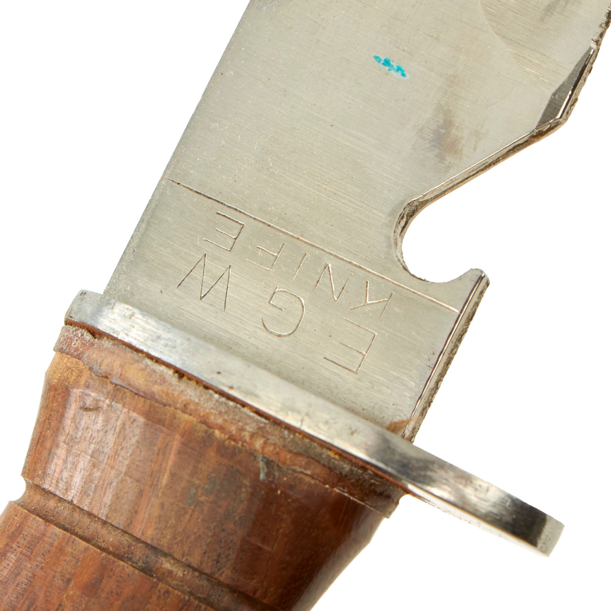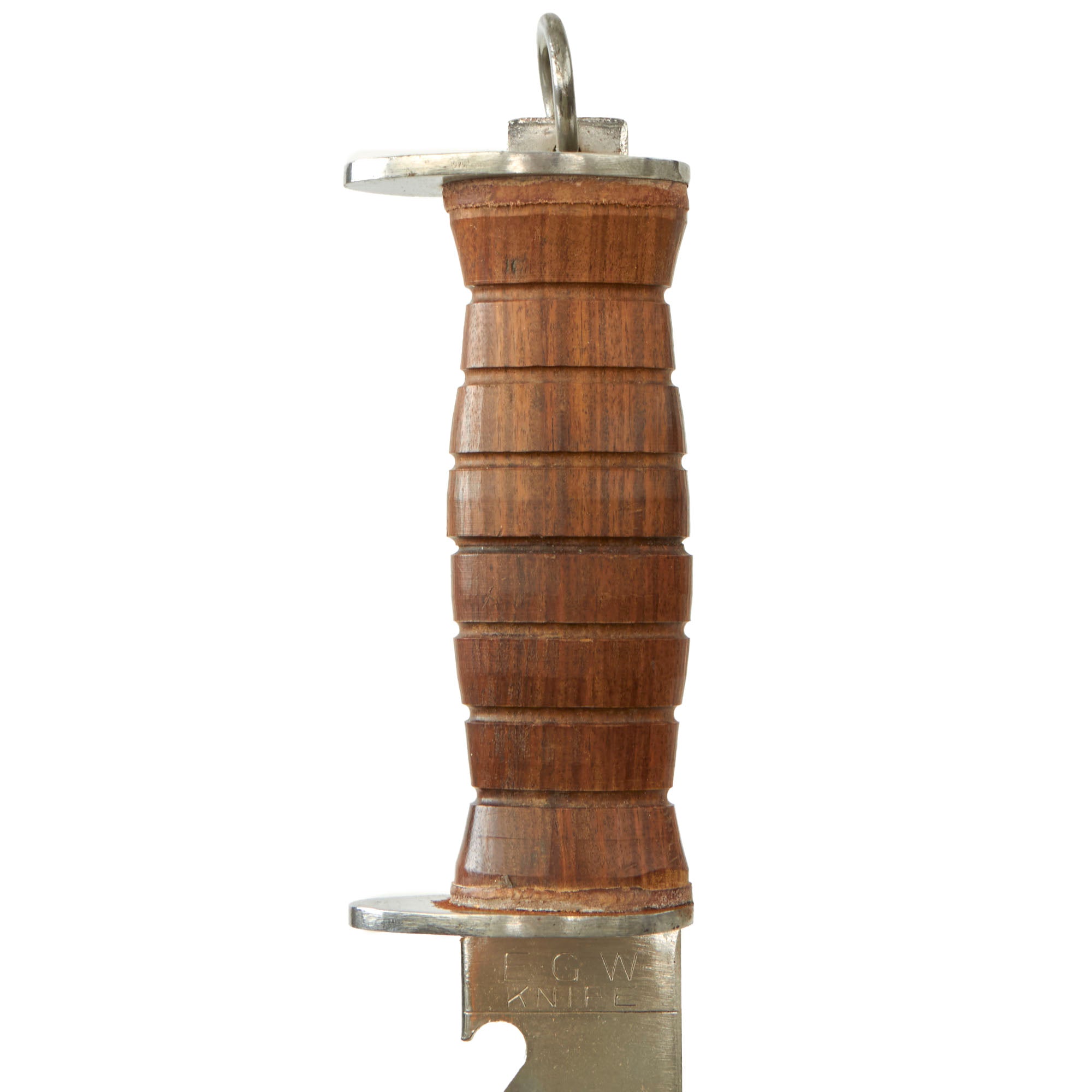 Original Item: Only One Available. Offered in very nice condition this genuine E.G. Waterman Company of New York City produced WWII fighting knives. These knives were very popular among USGIs during WW2 due to their versatility. While not an official U.S. issue, private purchase knives were extremely common. Multiple variations were made with both wood and leather handles (see page 165 of U.S. Military Knives Collector's Guide By Silvey & Boyd). This example has a hardwood handle, with leather spacers on the end. Overall length of the knife is 10 1/2 inches, with a 6 3/8 inch "bowie" blade, complete with a cap lifter. Unfortunately there is cracking down the side of the handle, as seen in the photos. The ricasso is factory-stamped with the classic up-side down marking: