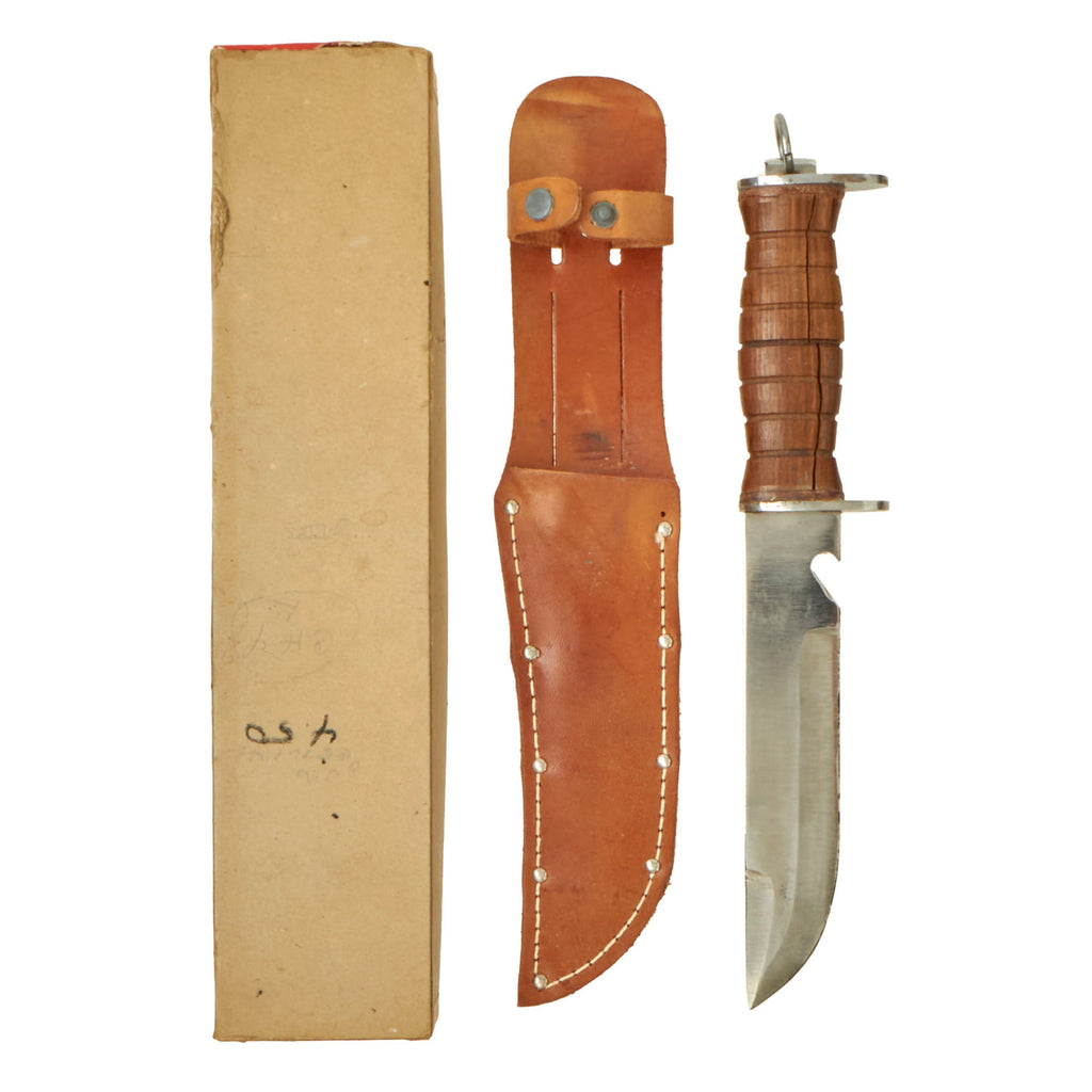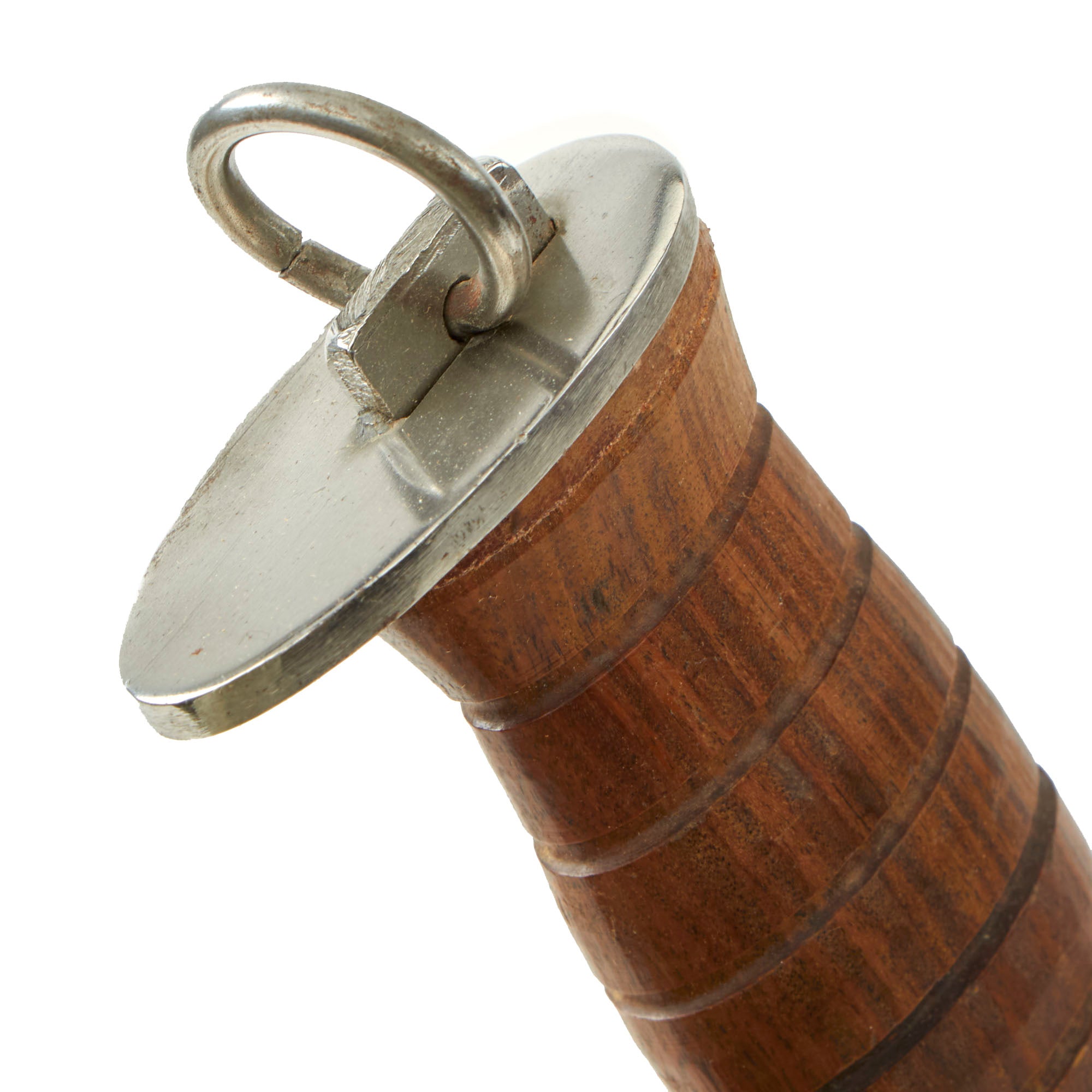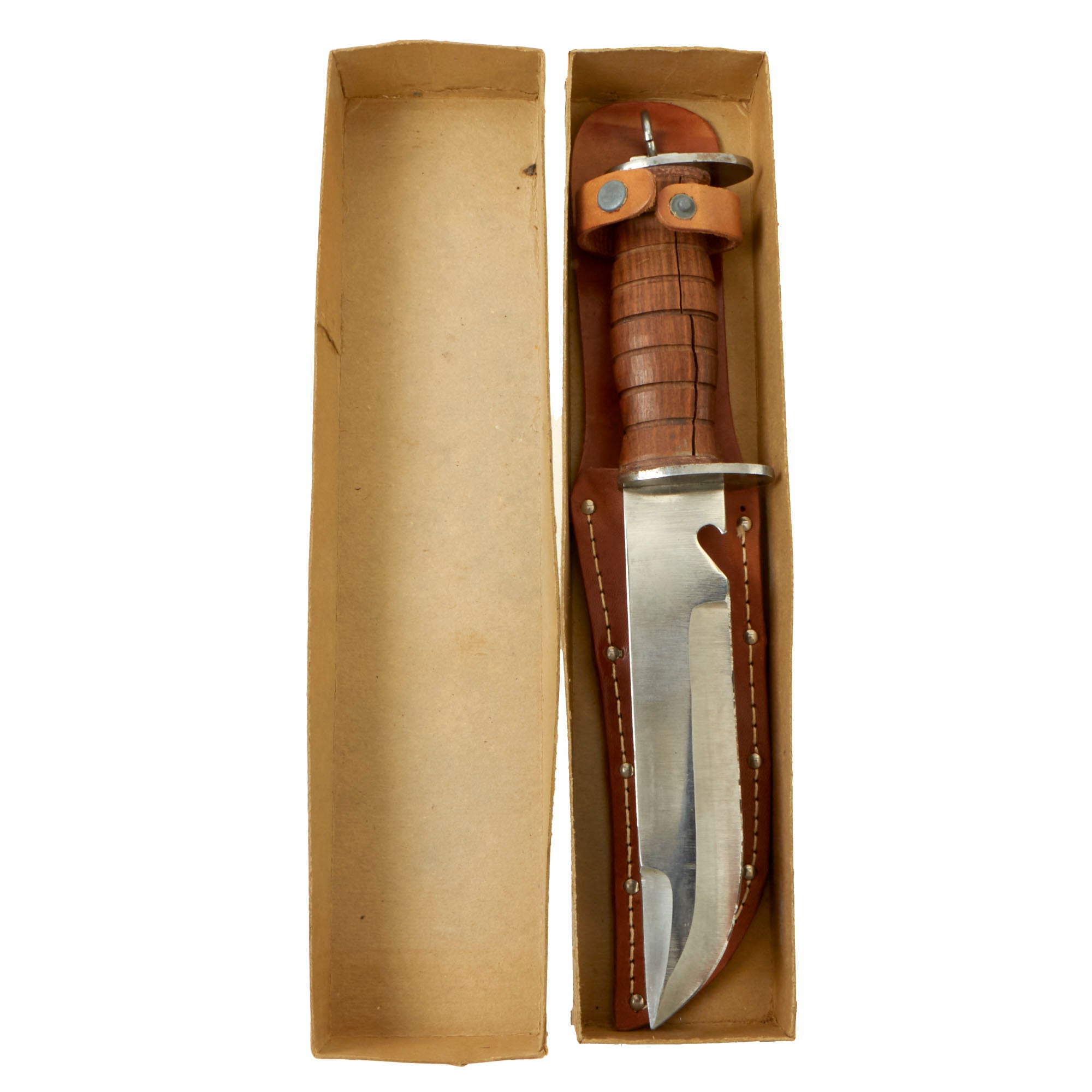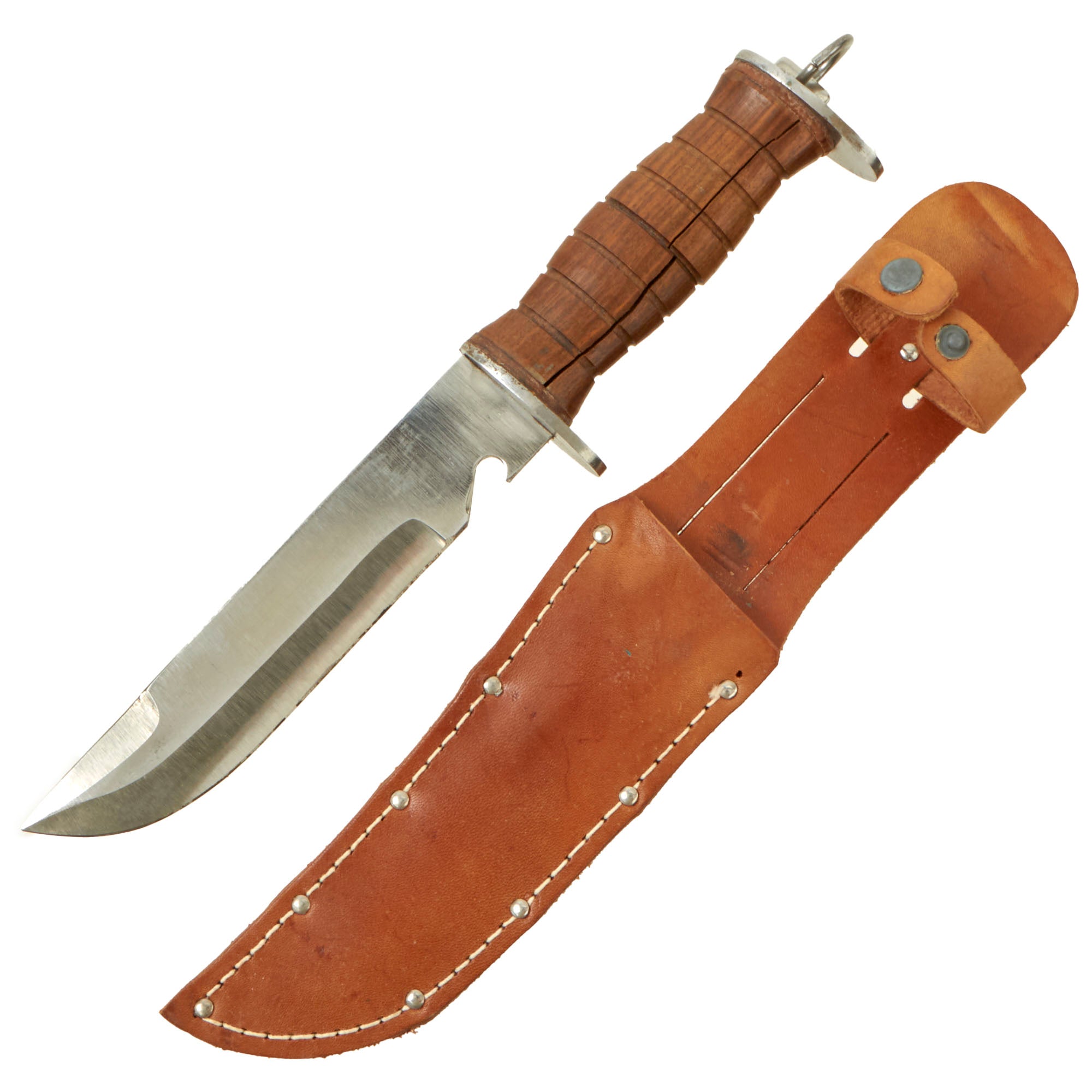 Original Item: Only One Available. Offered in very nice condition this genuine E.G. Waterman Company of New York City produced WWII fighting knives. These knives were very popular among USGIs during WW2 due to their versatility. While not an official U.S. issue, private purchase knives were extremely common. Multiple variations were made with both wood and leather handles (see page 165 of U.S. Military Knives Collector's Guide By Silvey & Boyd). This example has a hardwood handle, with leather spacers on the end. Overall length of the knife is 10 1/2 inches, with a 6 3/8 inch "bowie" blade, complete with a cap lifter. Unfortunately there is cracking down the side of the handle, as seen in the photos. The ricasso is factory-stamped with the classic up-side down marking: