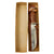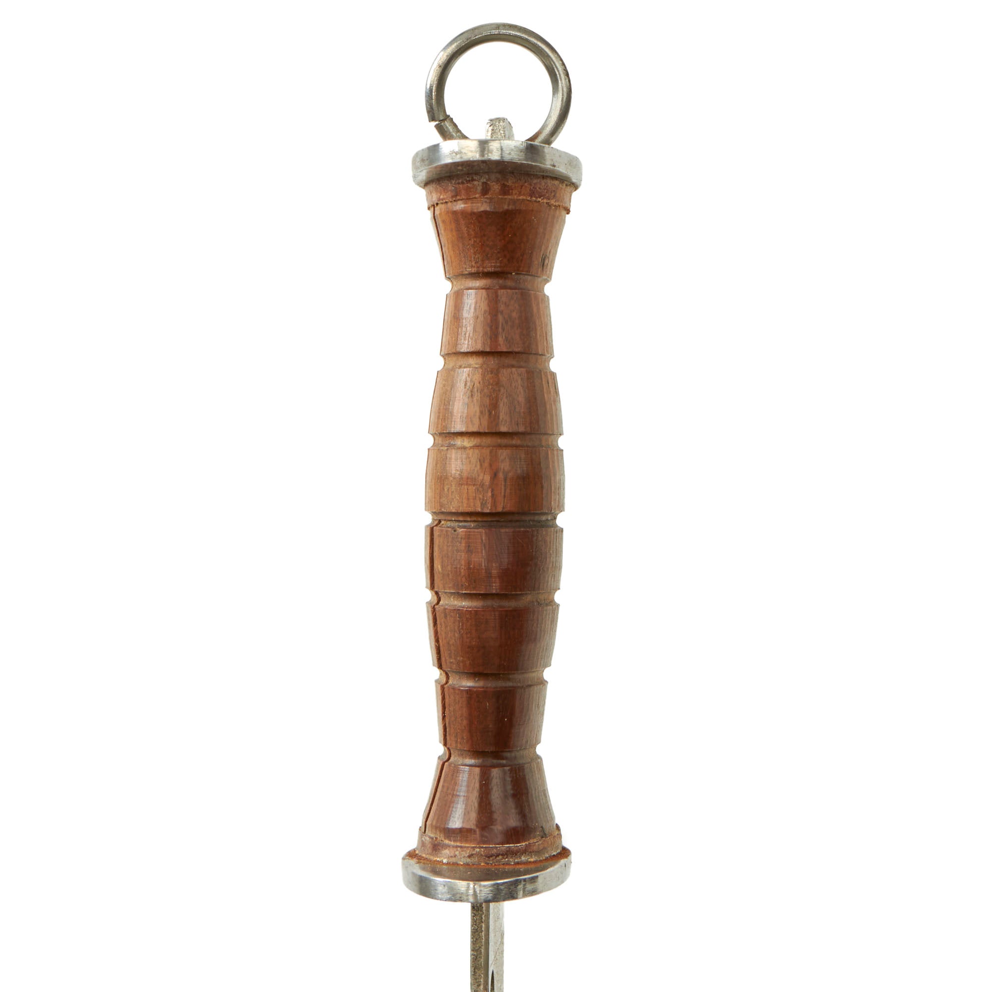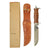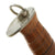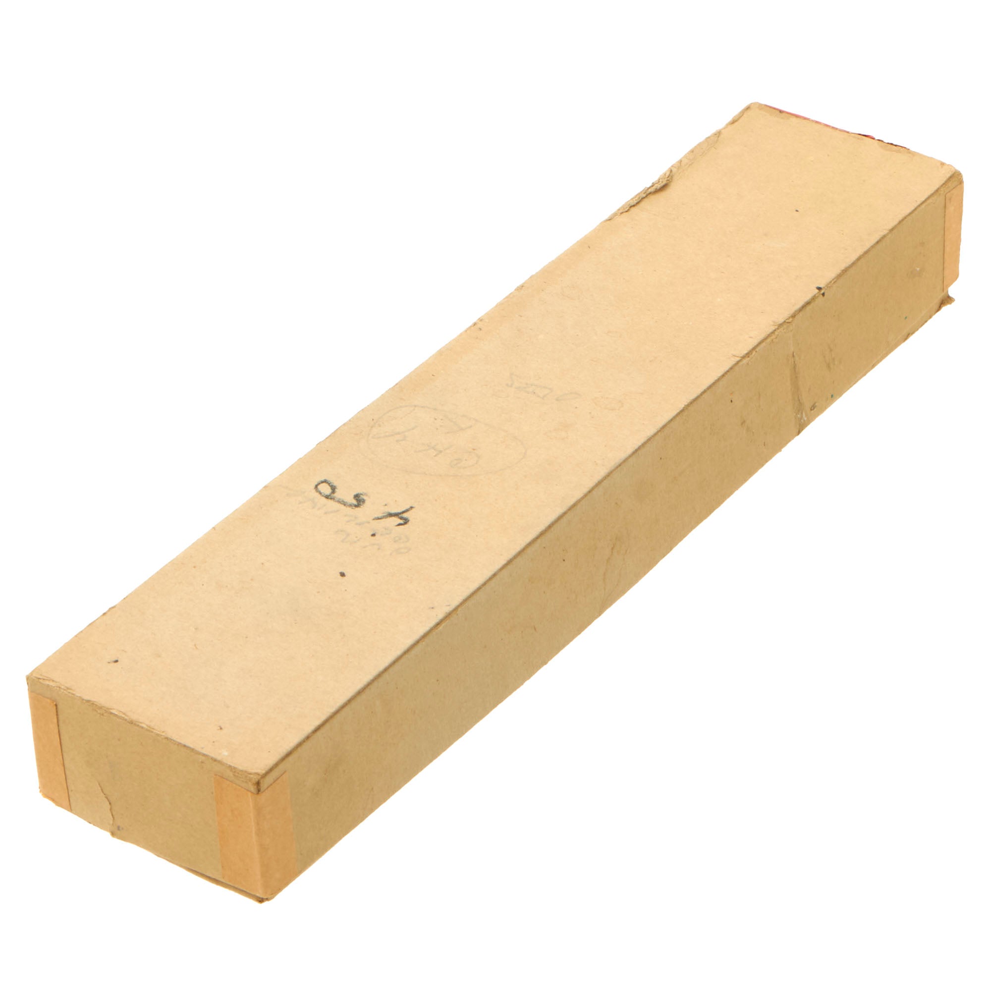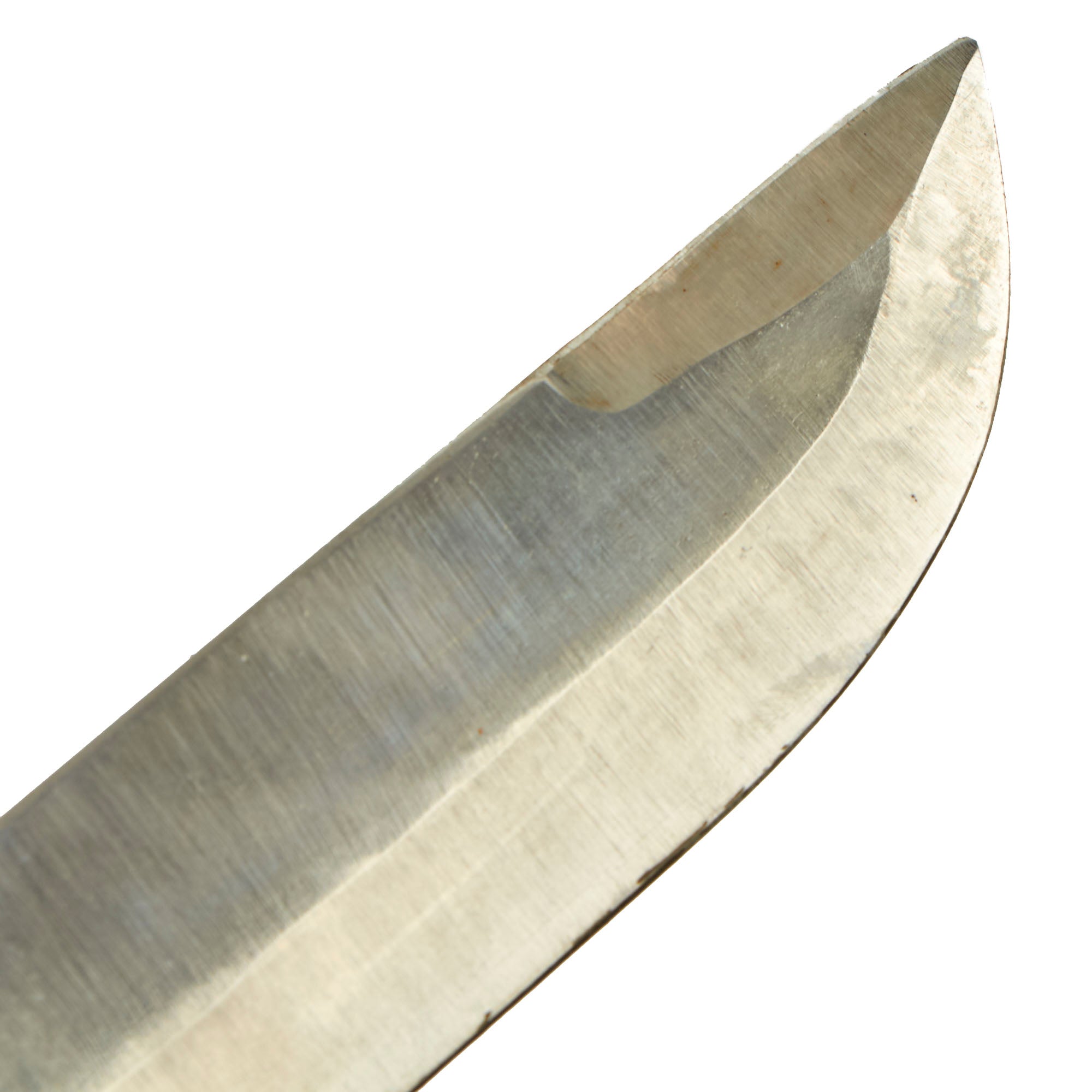 This knife has not been used, and still retains much of the original factory hollow ground edge. It does not seem to have been sharpened much over time, so the blade still has the original shape. The blade is rust-free; the tip is intact though it has some small nicks. Wood grip is in good condition, though has some cracking due to age and moisture changes. Pommel ring and cap are slightly loose, as expected on a knife of this age.