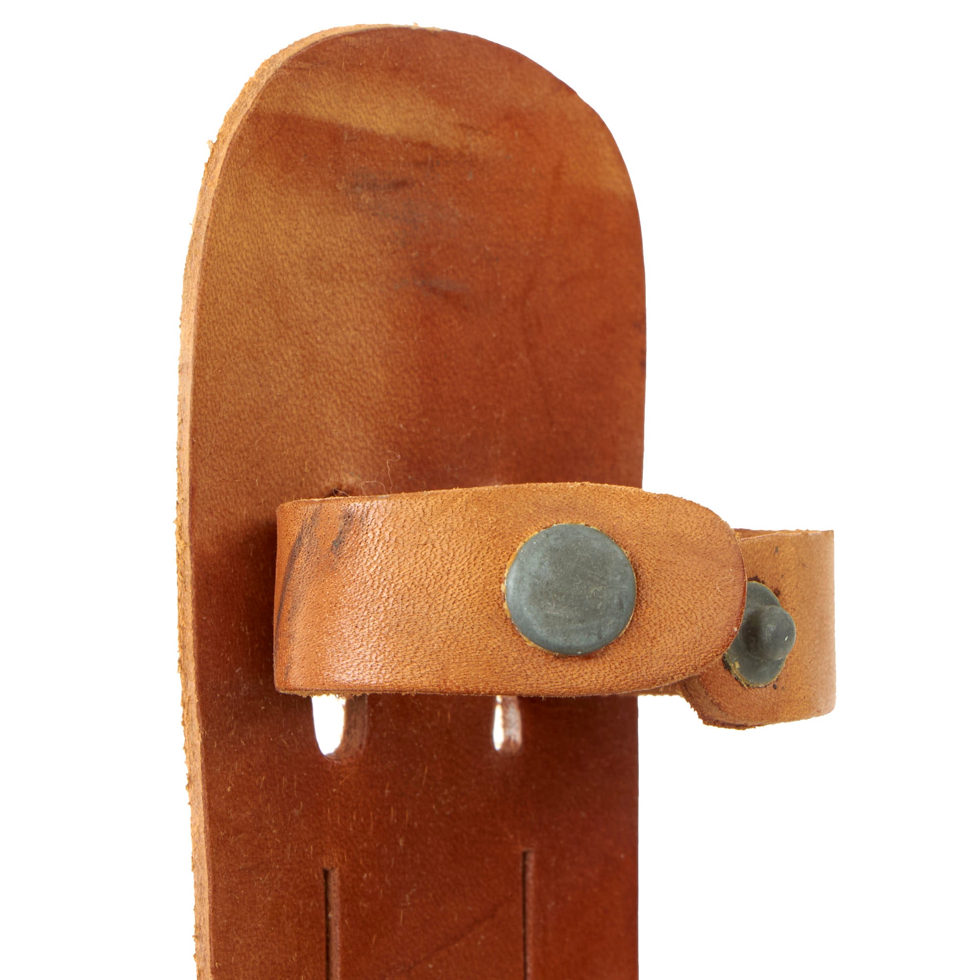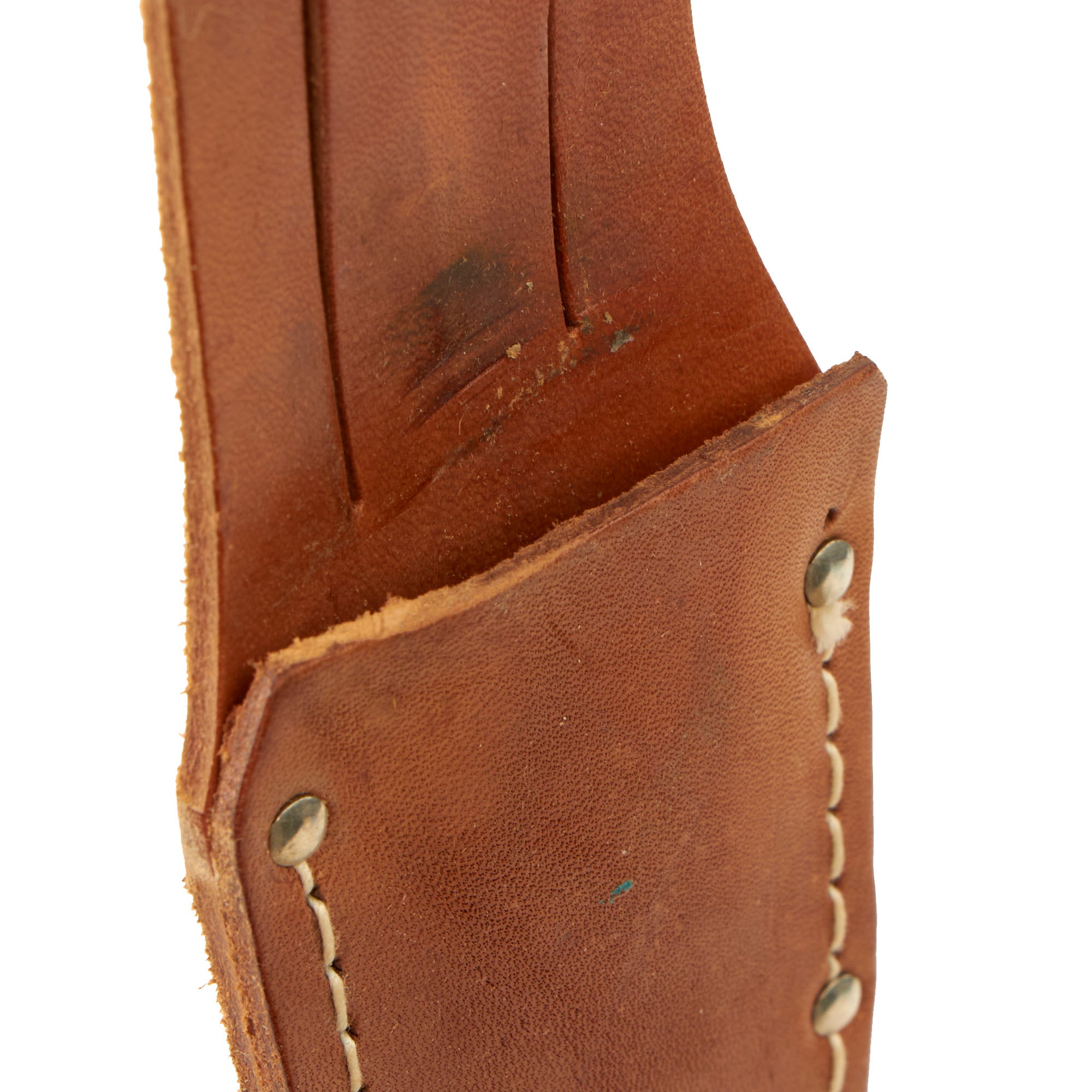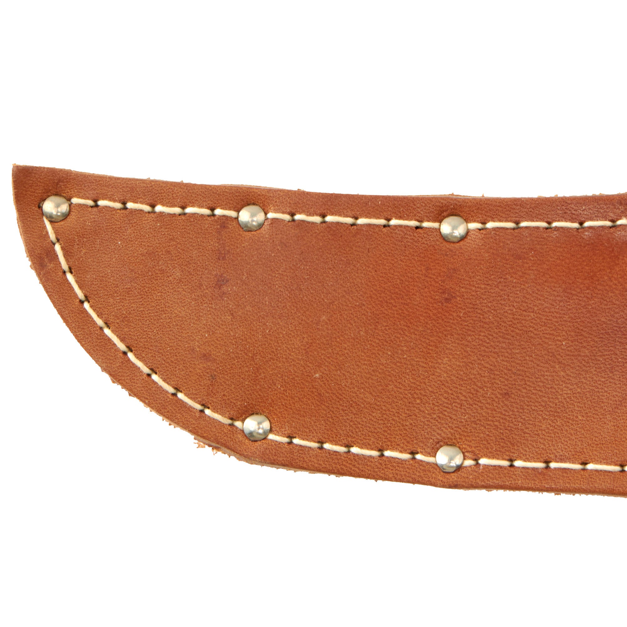 The leather scabbard appears original, and is in good shape, though somewhat stiff from age. The snap is functional, and the securing strap is in great shape.