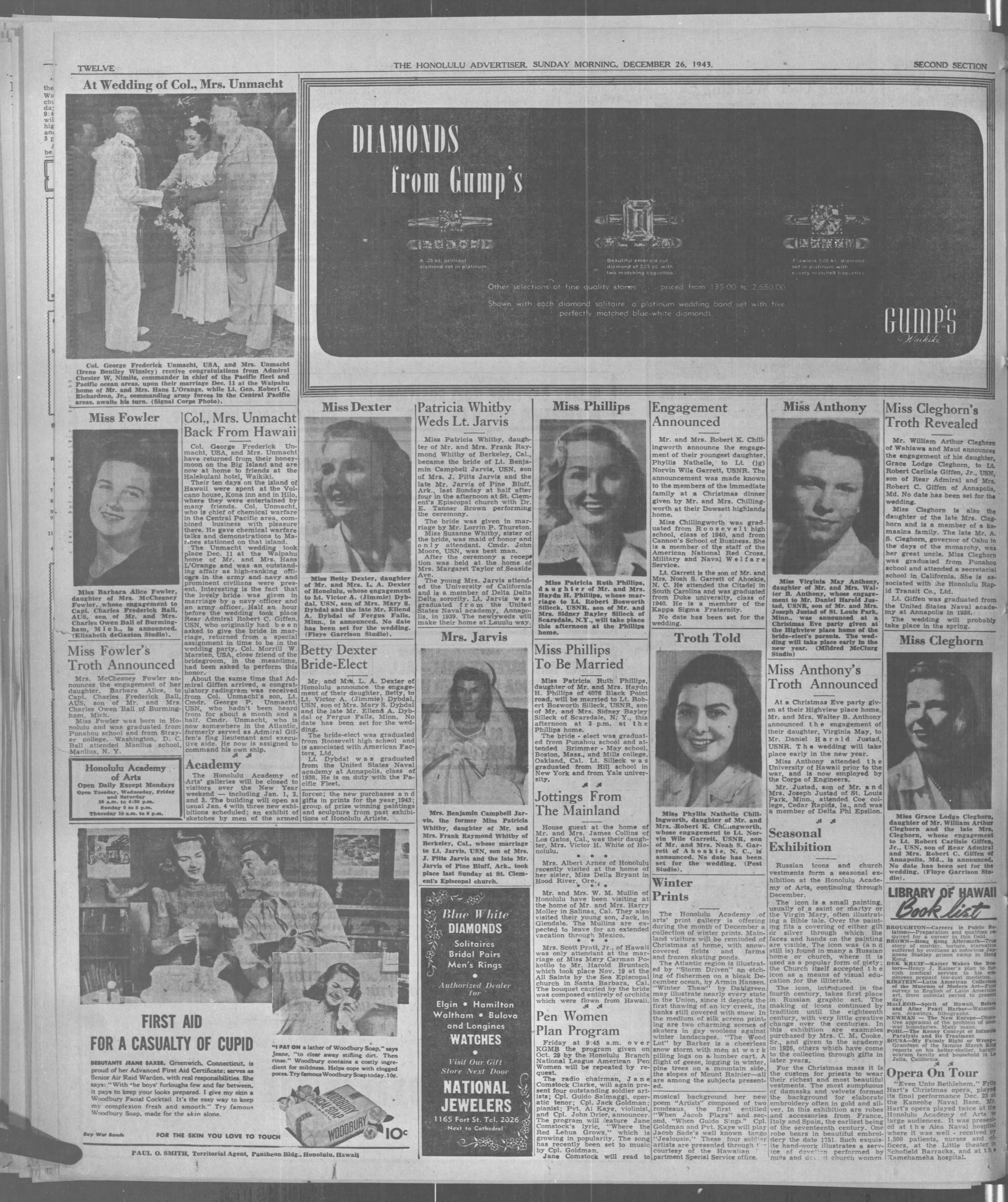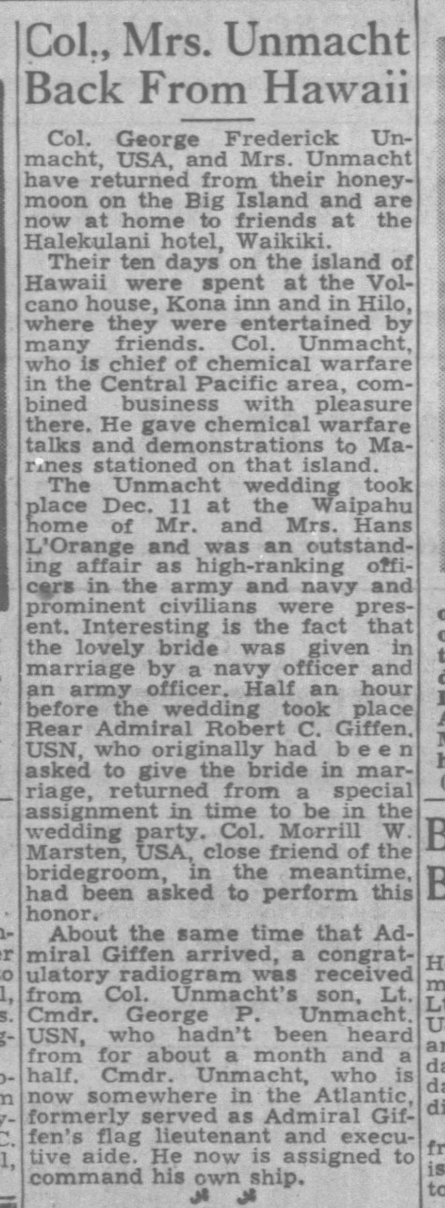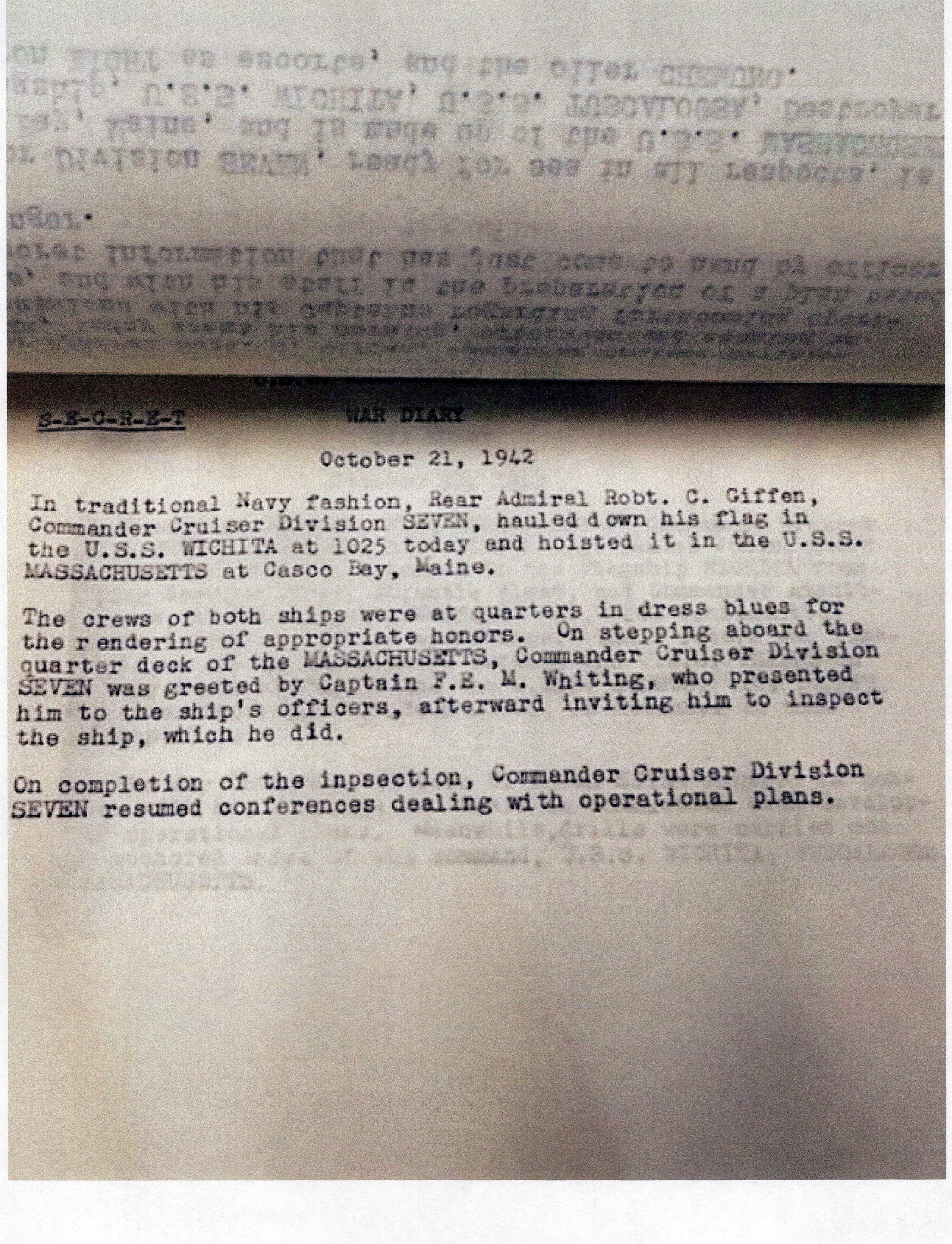 In the printed research accompanying this helmet, we see in the USS Wichita war diary that on October 20th, 1942, Lieut. George P. Unmacht was Flag Lieutenant of Commander Cruiser Division Seven, which was commanded by Giffen, 3 weeks before the start of the battle. The flagship of Commander Cruiser Division Seven was indeed the USS Massachusetts. This would mean Unmacht was Giffen’s flag lieutenant during the battle. We found in a December 1943 newspaper article about his father’s wedding, that Unmacht served as Giffen’s flag lieutenant and executive aid. This along with the October 20th, 1942 War Diary document which shows he was Giffen’s flag lieutenant 3 weeks before the battle leads us to believe that Unmacht was certainly aboard the USS Massachusetts during the battle.