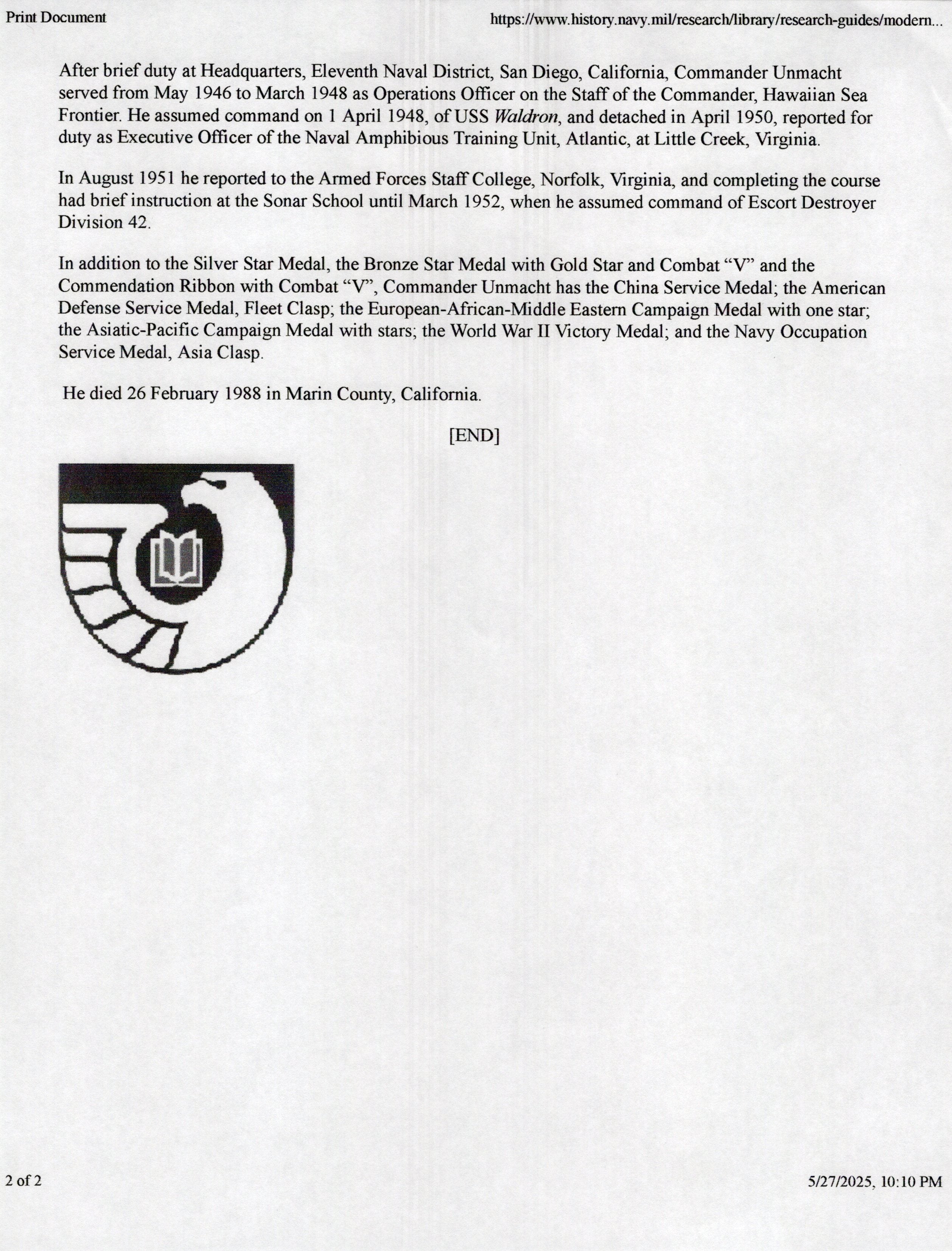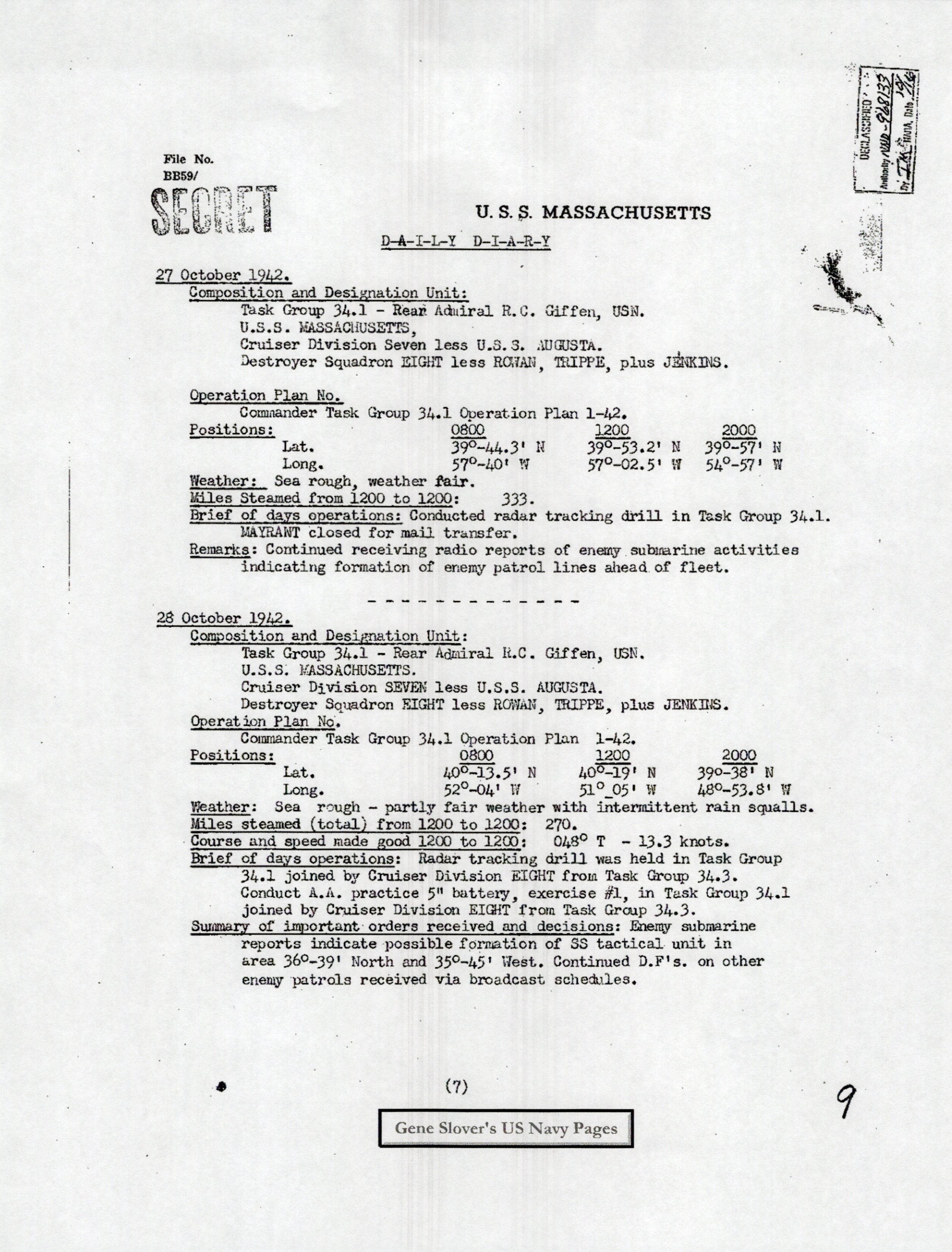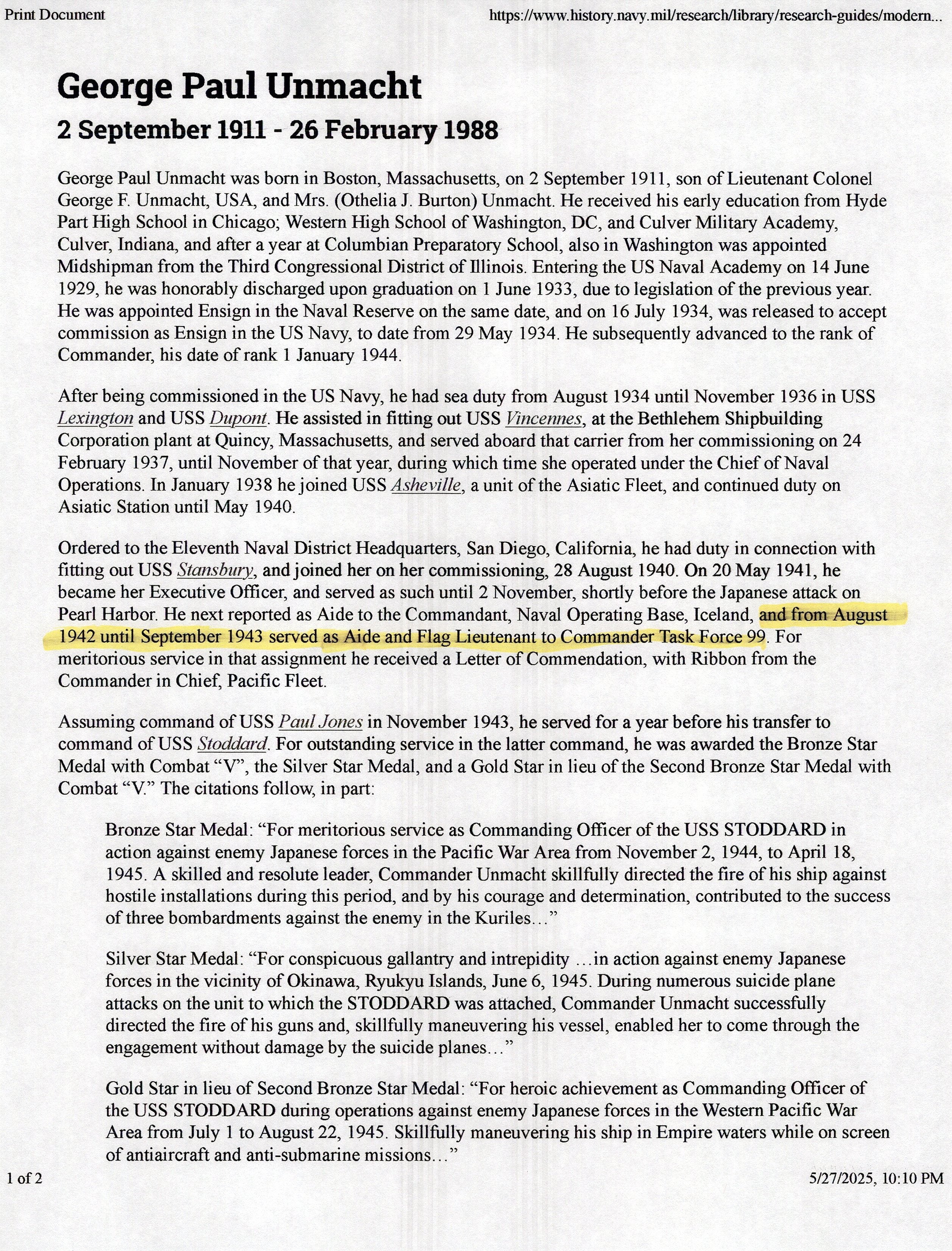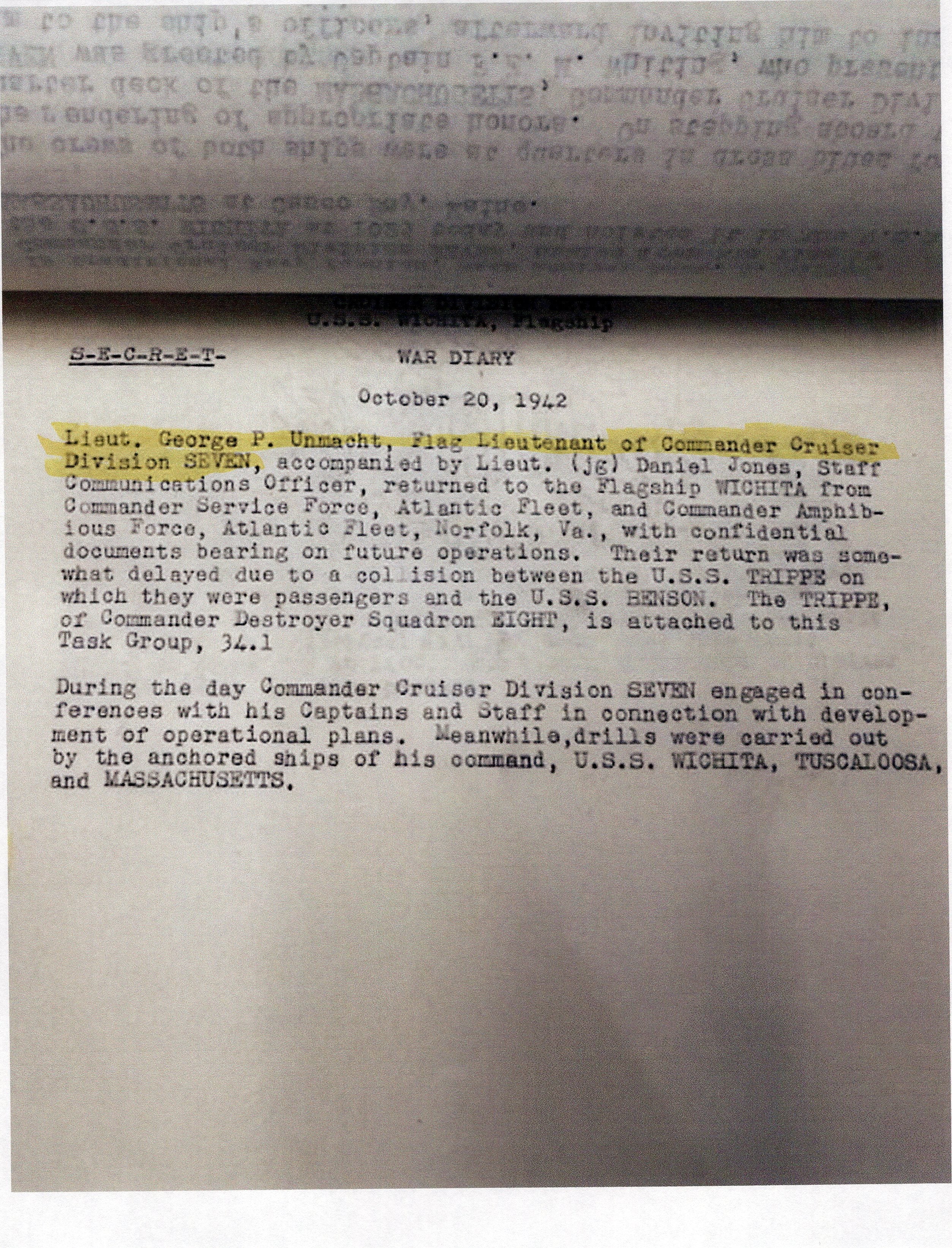With the research we’ve accumulated from the Nimitz archive, and all available reference online, we are entirely confident in our findings that Unmacht was flag lieutenant of the USS Massachusetts during Casablanca. There may be incomplete information found online that does not include the Massachusetts as his station, but as flag lieutenant of a division, his location would often be hard to track.