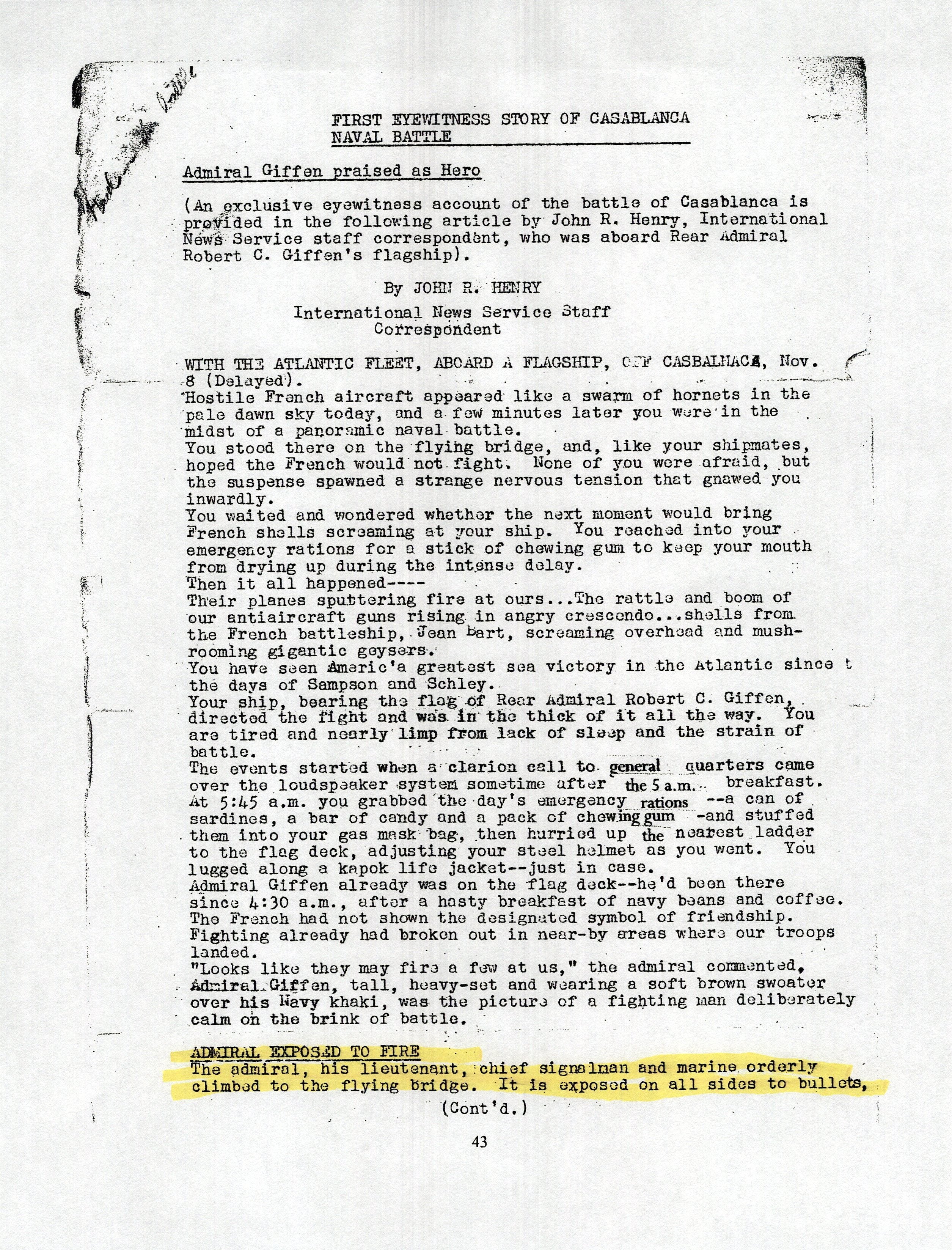 Throughout the bombardment, Rear Admiral Giffen and Flag Lieutenant Unmacht remained on the ship’s flying bridge—the highest, most exposed position on the vessel, reserved for the admiral and his senior staff. In an extraordinary contemporary account, International News Service war correspondent John R. Henry, who was embedded aboard USS Massachusetts, recorded the remarkable bravery of both men. Found during detailed research in the Nimitz Library archives at the U.S. Naval Academy, Henry’s dispatch describes Admiral Giffen and Unmacht standing their ground on the flying bridge “entirely exposed to enemy gunfire and aerial bombardment,” calmly issuing orders while the ship fired its main batteries.