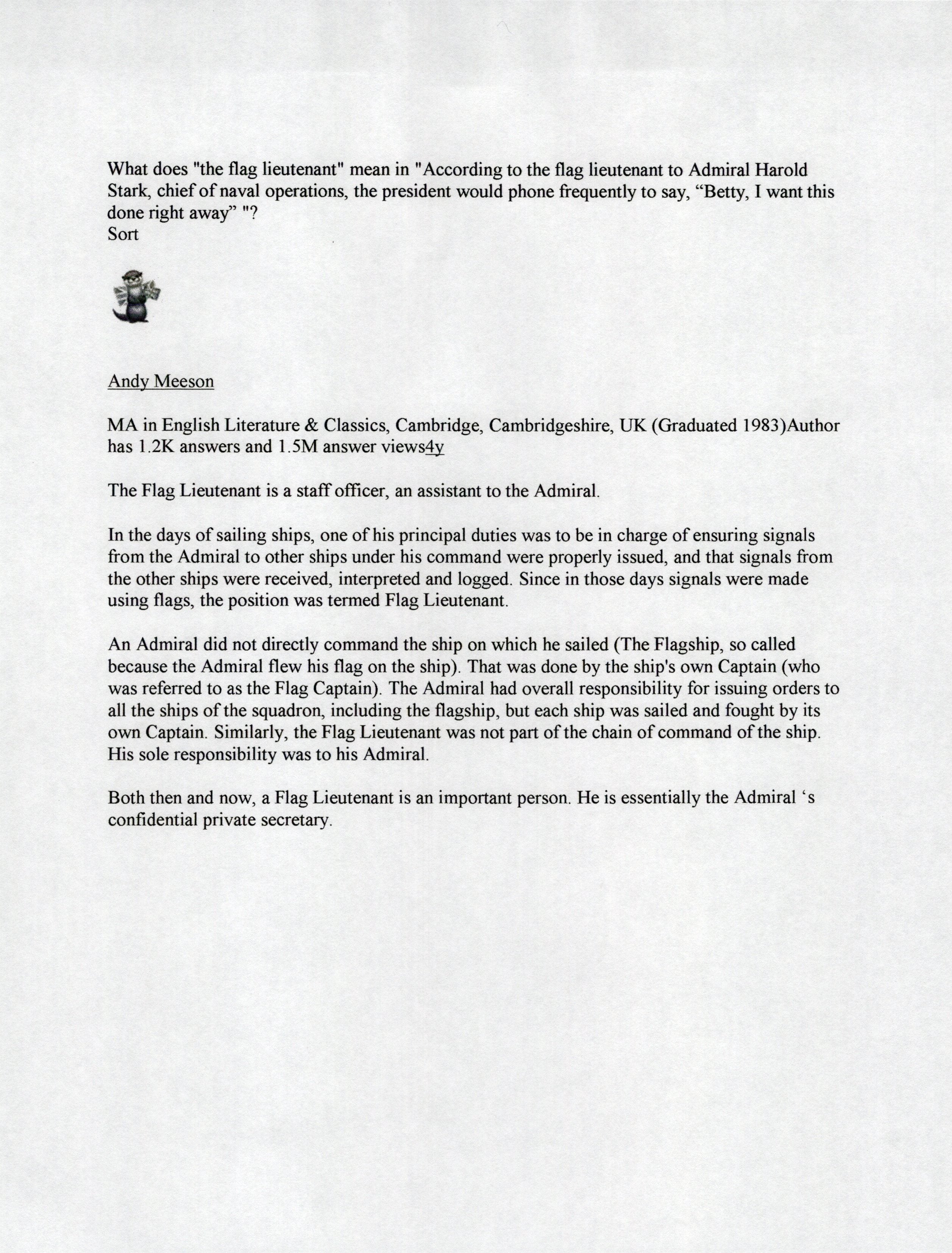 Another document states that during the battle, The admiral, his lieutenant, chief signalman and marine orderly climbed to the flying bridge. It is exposed on all sides to bullets, shrapnel and shell. His lieutenant in this case would have been Lieutenant Unmacht.