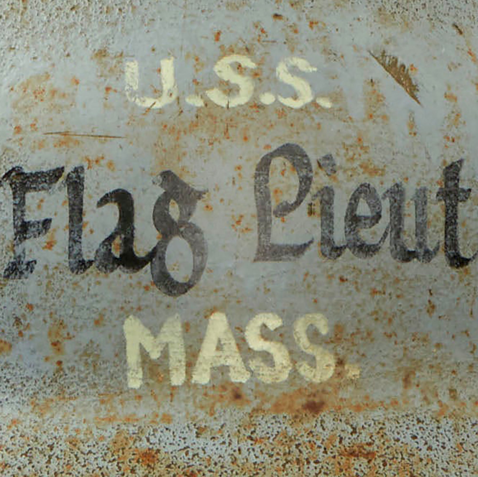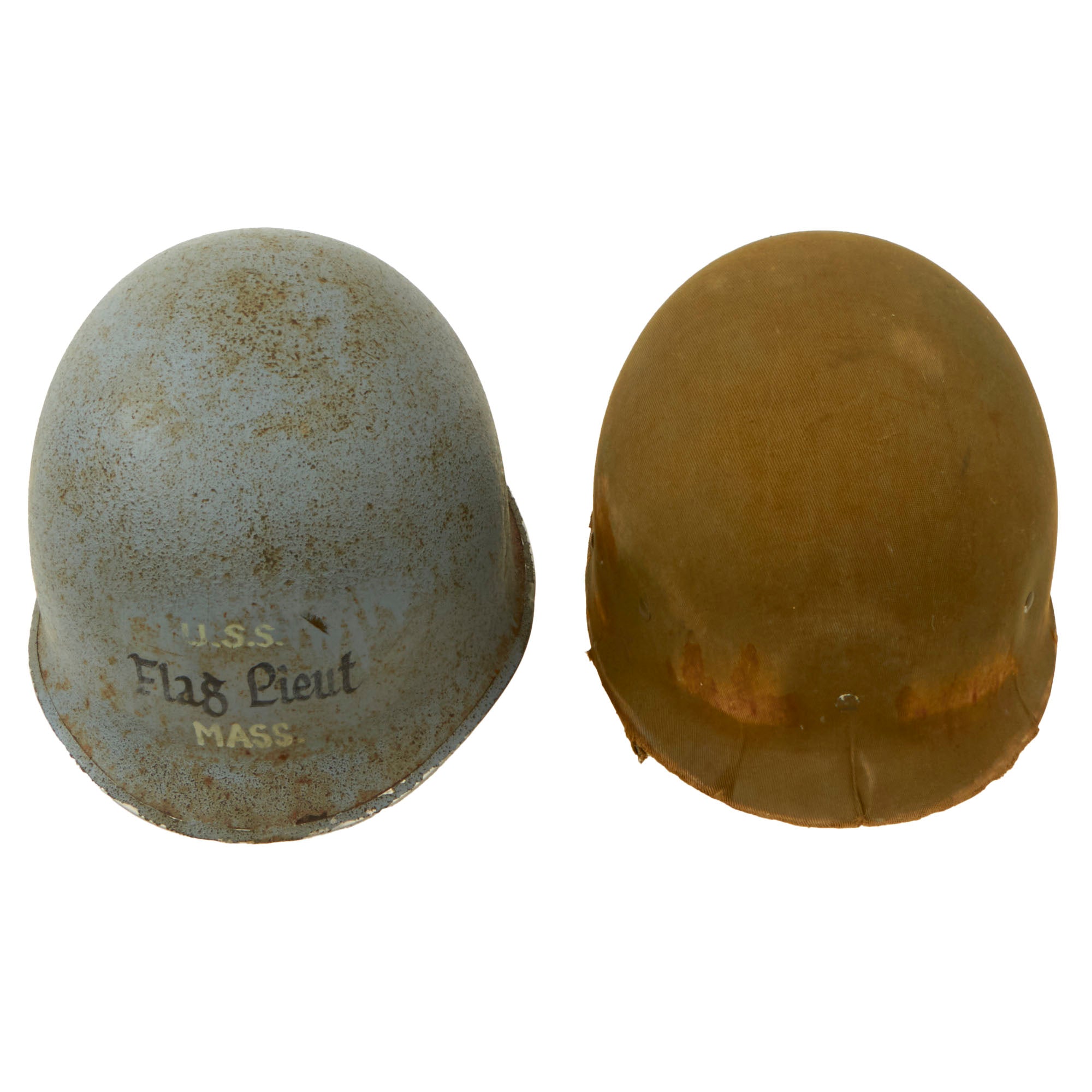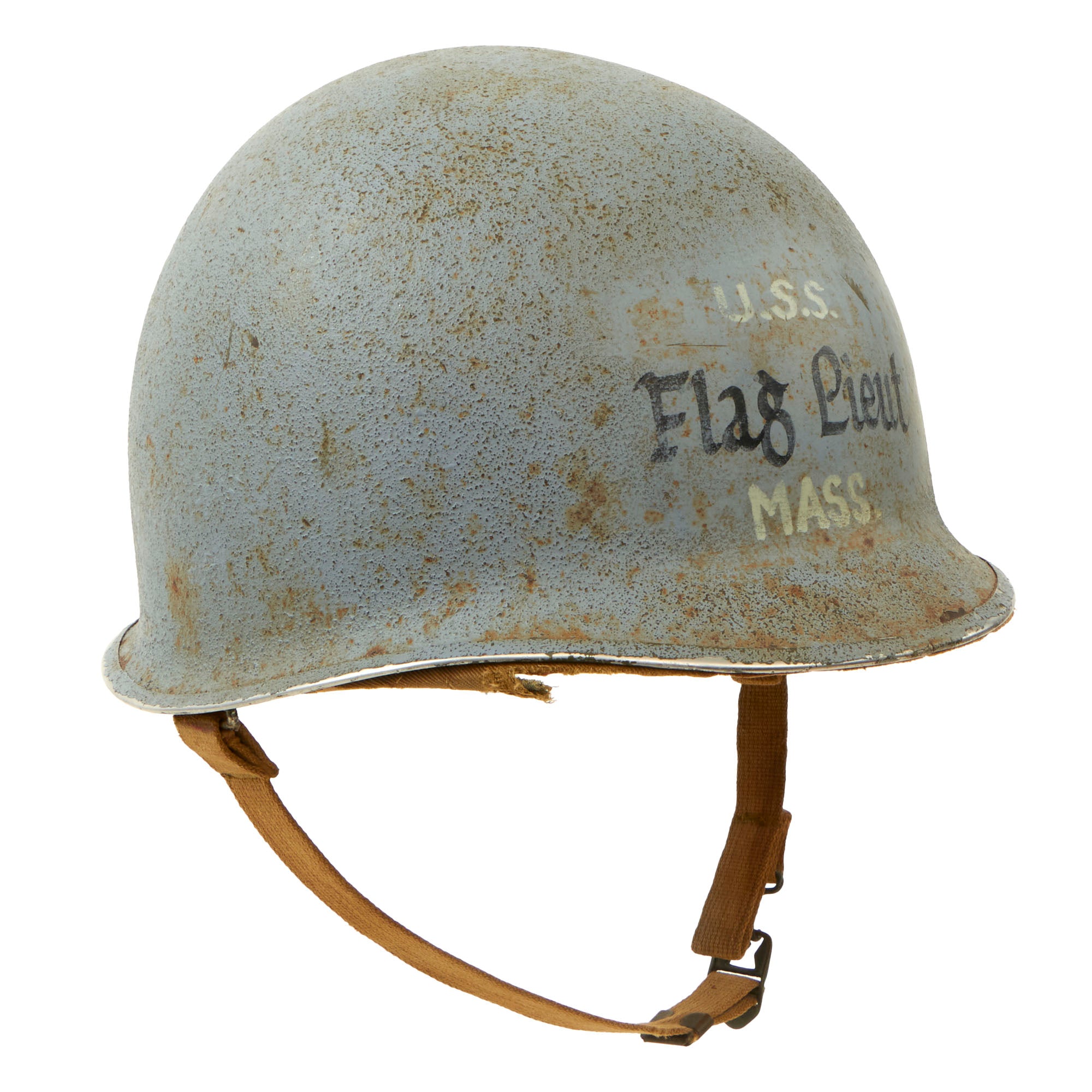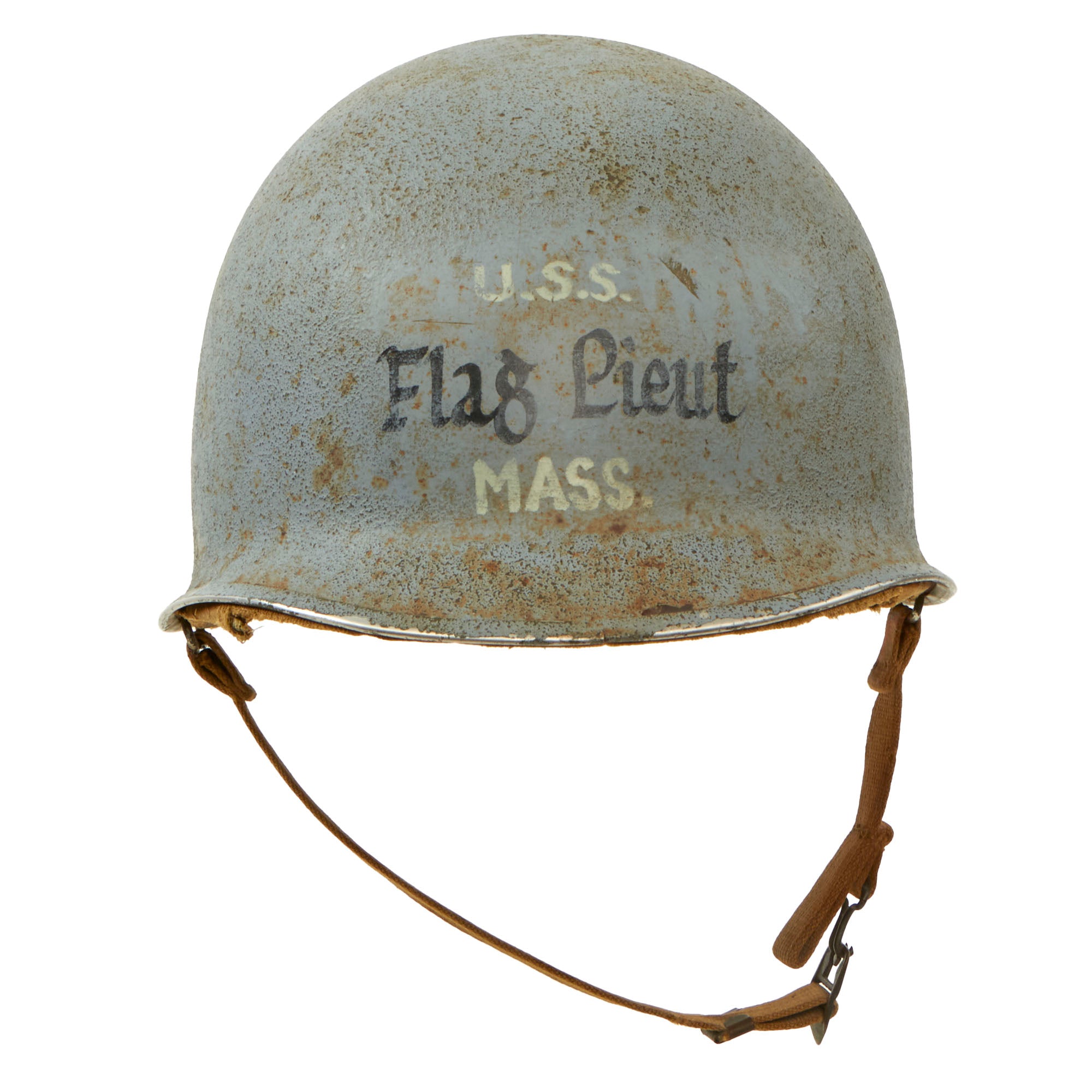 This very helmet—retaining its original U.S. Navy gray-blue combat finish, wartime webbed suspension, and chinstraps—is further distinguished by the presence of hand-painted, stylized inscriptions: “USS Mass.(Massachusetts)” and “Flag Lieut” These markings, render this helmet not only unique but deeply personal. It reflects the pride of position and the formal structure of naval hierarchy at a time of immense global conflict on one of the most famous US Navy battleships of World War II.