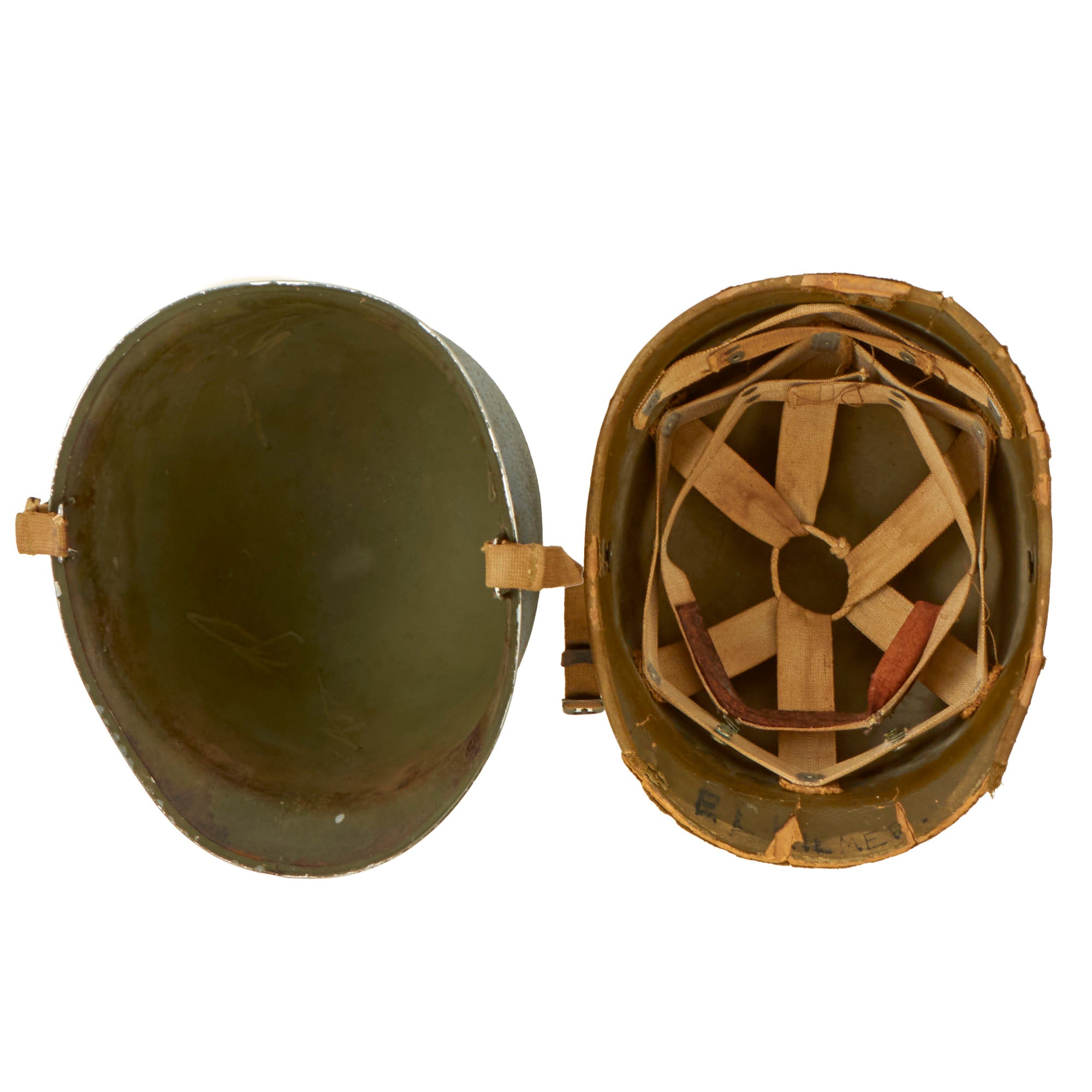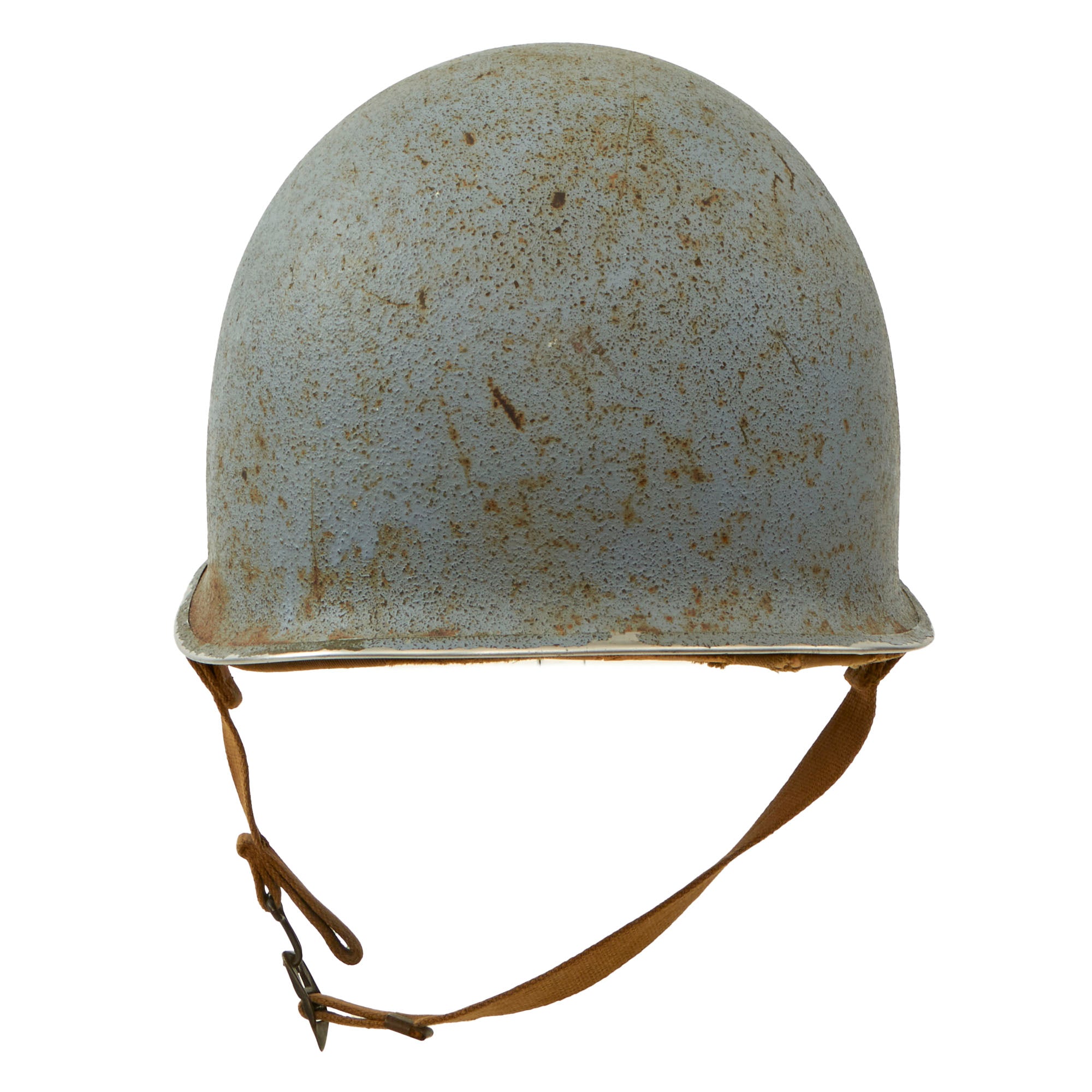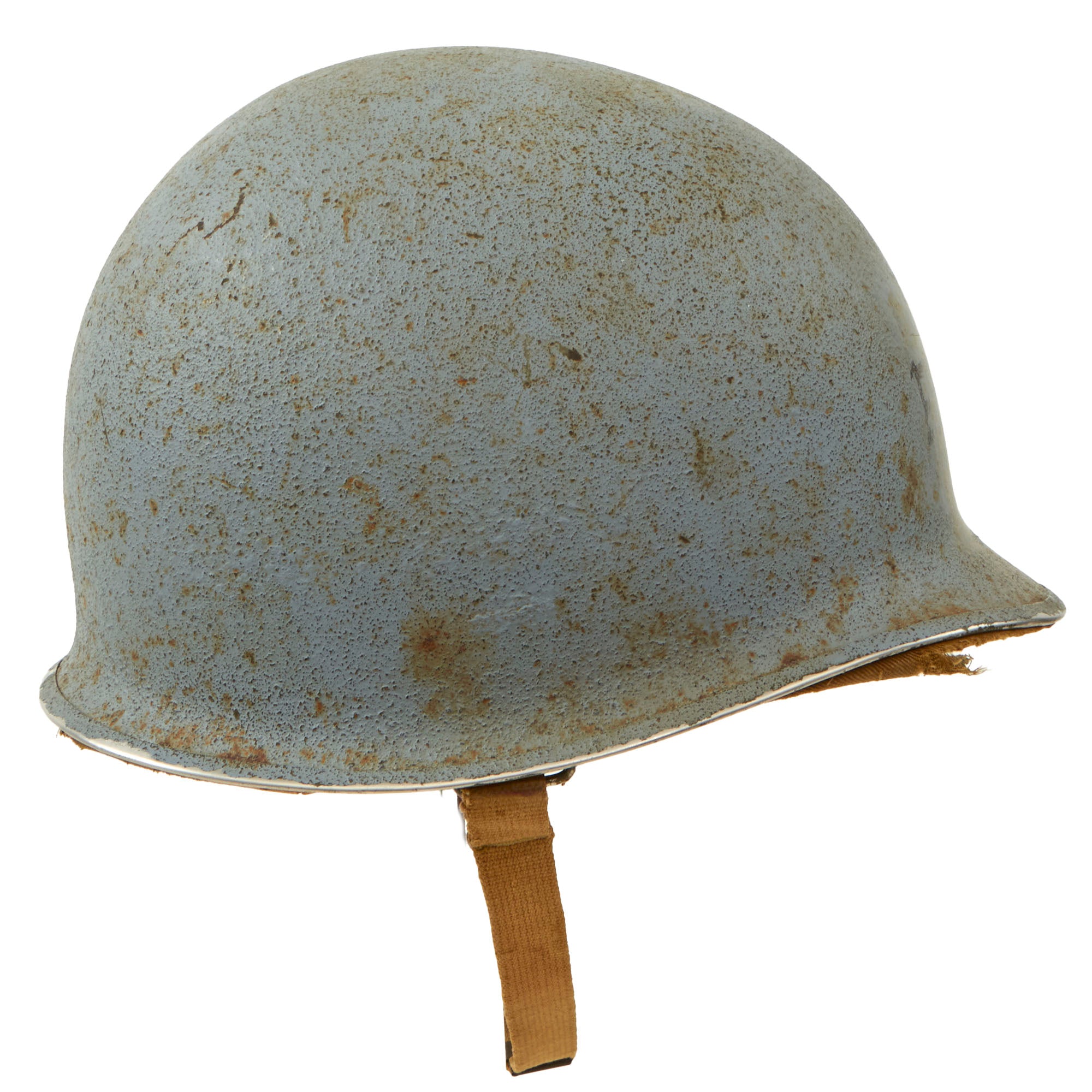 Original Item: One-of-a-kind. International Military Antiques is honored to present a singular artifact of extraordinary historical importance: a WWII U.S. Navy M1 fixed bale (very early 1941 production) combat helmet worn by Flag Lieutenant George P. Unmacht aboard the battleship USS Massachusetts (BB-59) during Operation Torch in November 1942. This object is not simply an example of wartime combat gear— it is a verified, uniquely documented item tied directly to a key moment in U.S. naval history and to one of the most significant amphibious campaigns of World War II. With ironclad provenance to a decorated officer and a momentous operation, this helmet represents an unparalleled opportunity for collectors, historians, and institutions.