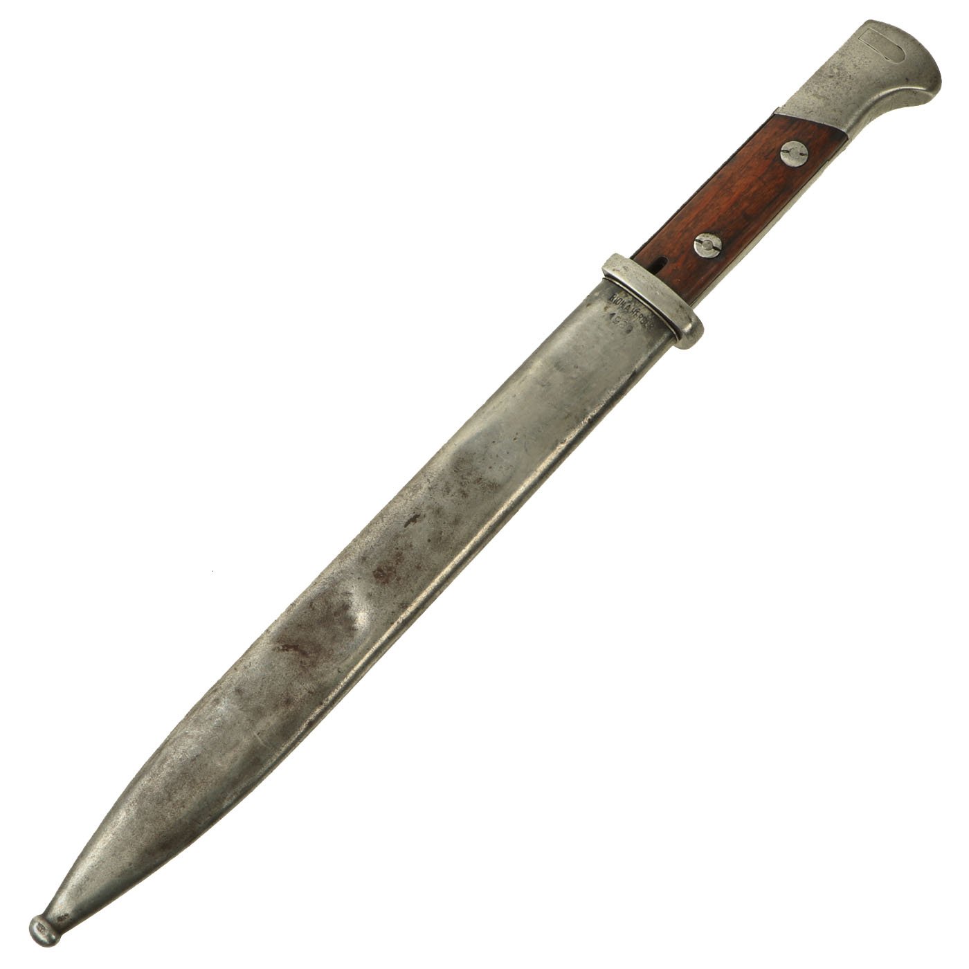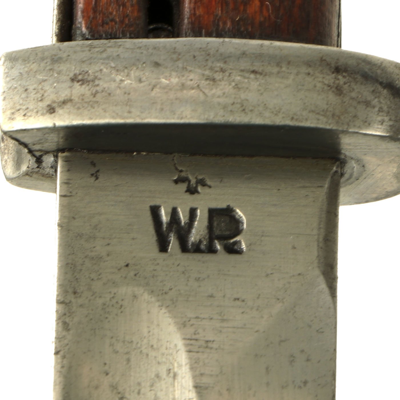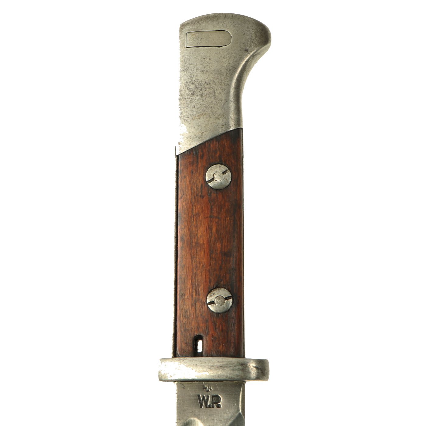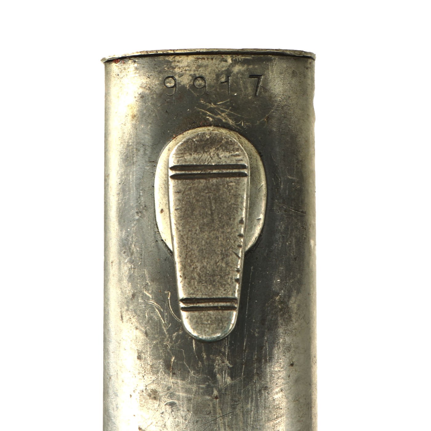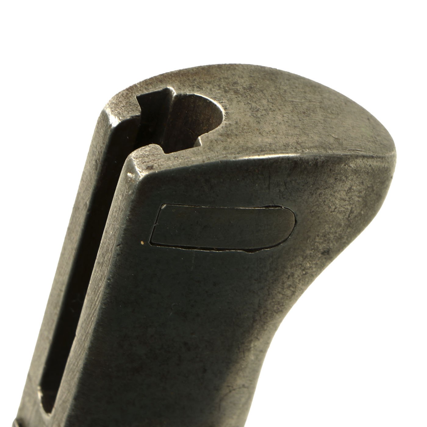 The bayonet is correctly fitted with a flash guard on the grip spine and has a 9.75" bright steel blade with a fuller down each side. The hilt is still fitted with the original bolt retained wooden grips. The bayonet catch is functional, and overall it is in very good condition. Many of these were refinished in black after capture by German forces, but this example is still correctly "in the white".