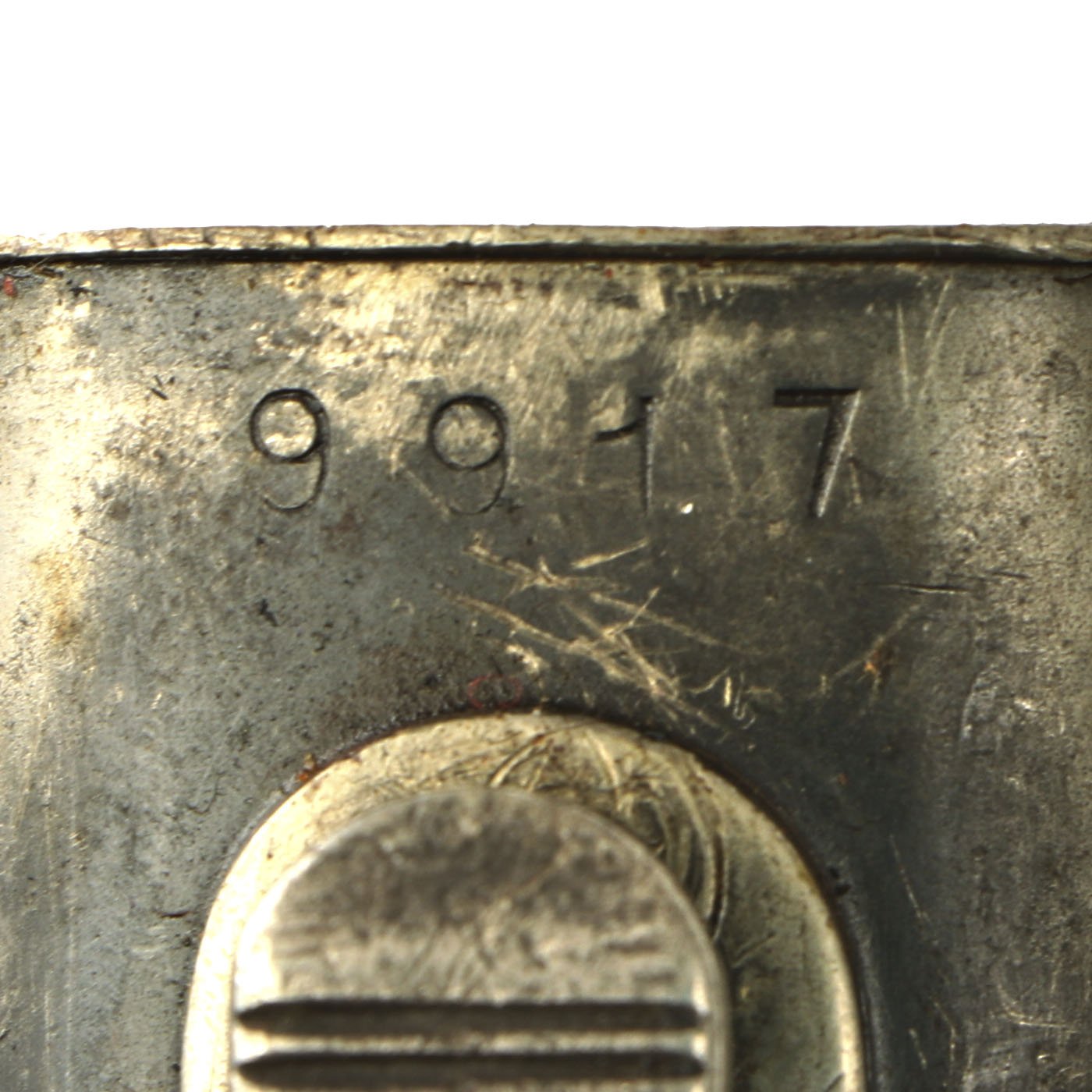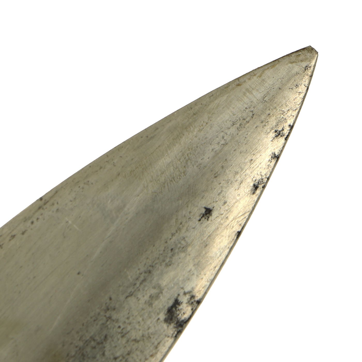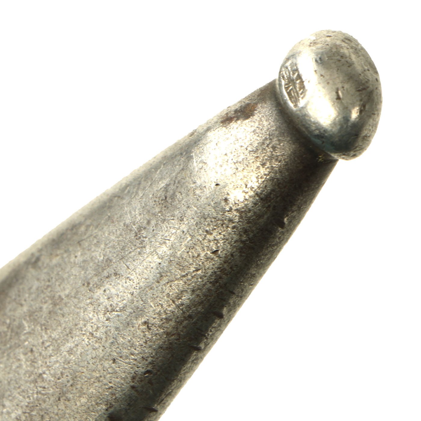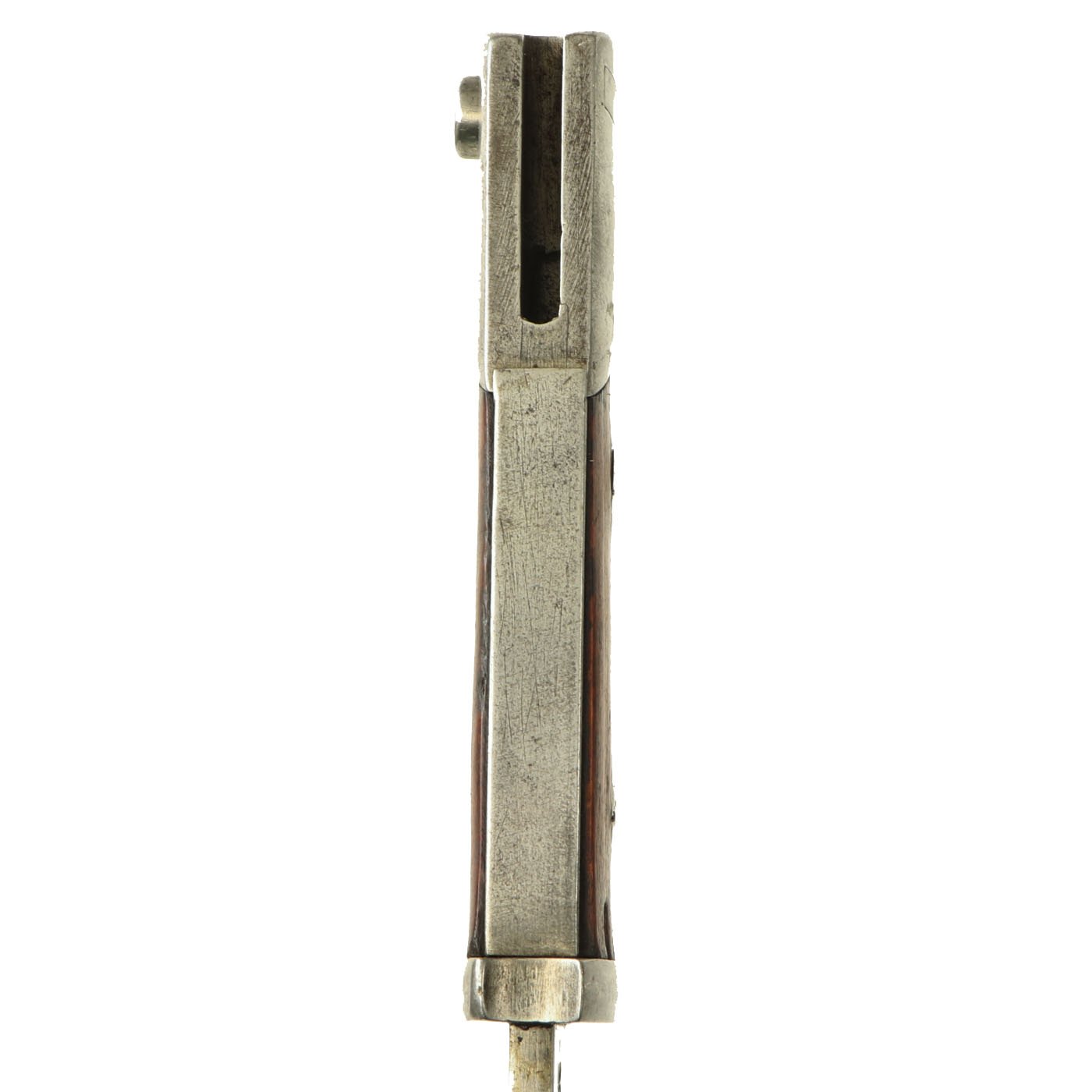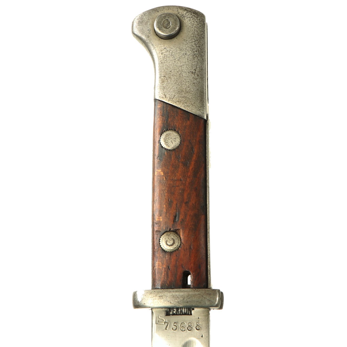 The bayonet is correctly fitted with a flash guard on the grip spine and has a 9.75" bright steel blade with a fuller down each side. The hilt is still fitted with the original bolt retained wooden grips. The bayonet catch is functional, and overall it is in very good condition. Many of these were refinished in black after capture by German forces, but this example is still correctly "in the white".