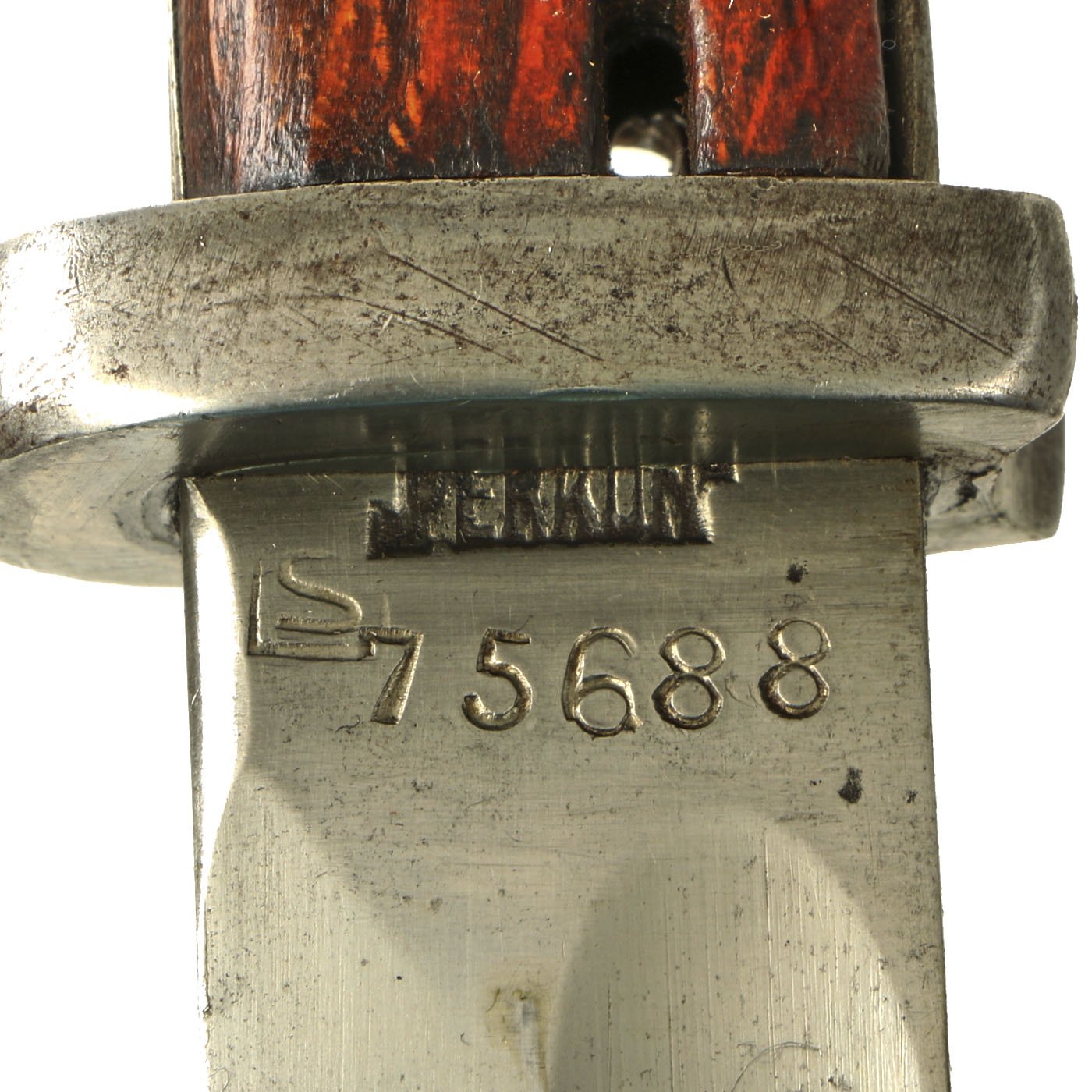 This example is marked PERKUN on the bayonet ricasso, for the Perkun factory in Warsaw, Poland. The reverse ricasso bears the Polish double headed eagle proof mark and the letters W.P. (Wojsko Polskie = Polish Army). This example, like all WWII era issued bayonets, does not have a muzzle ring, just like the German Mauser bayonets.