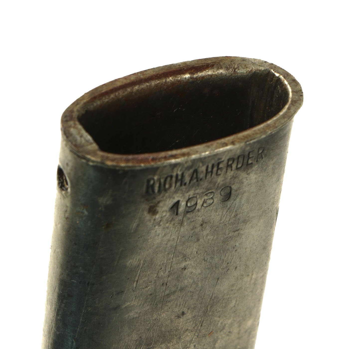 However, it does come in a German 98K steel bayonet scabbard, dated 1939 and maker marked RICH. A. HERDER, a well known Solingen manufacturer. This most likely indicates that it was captured and used by German forces after they occupied Poland.