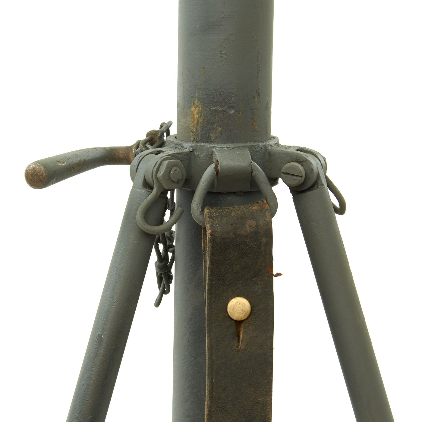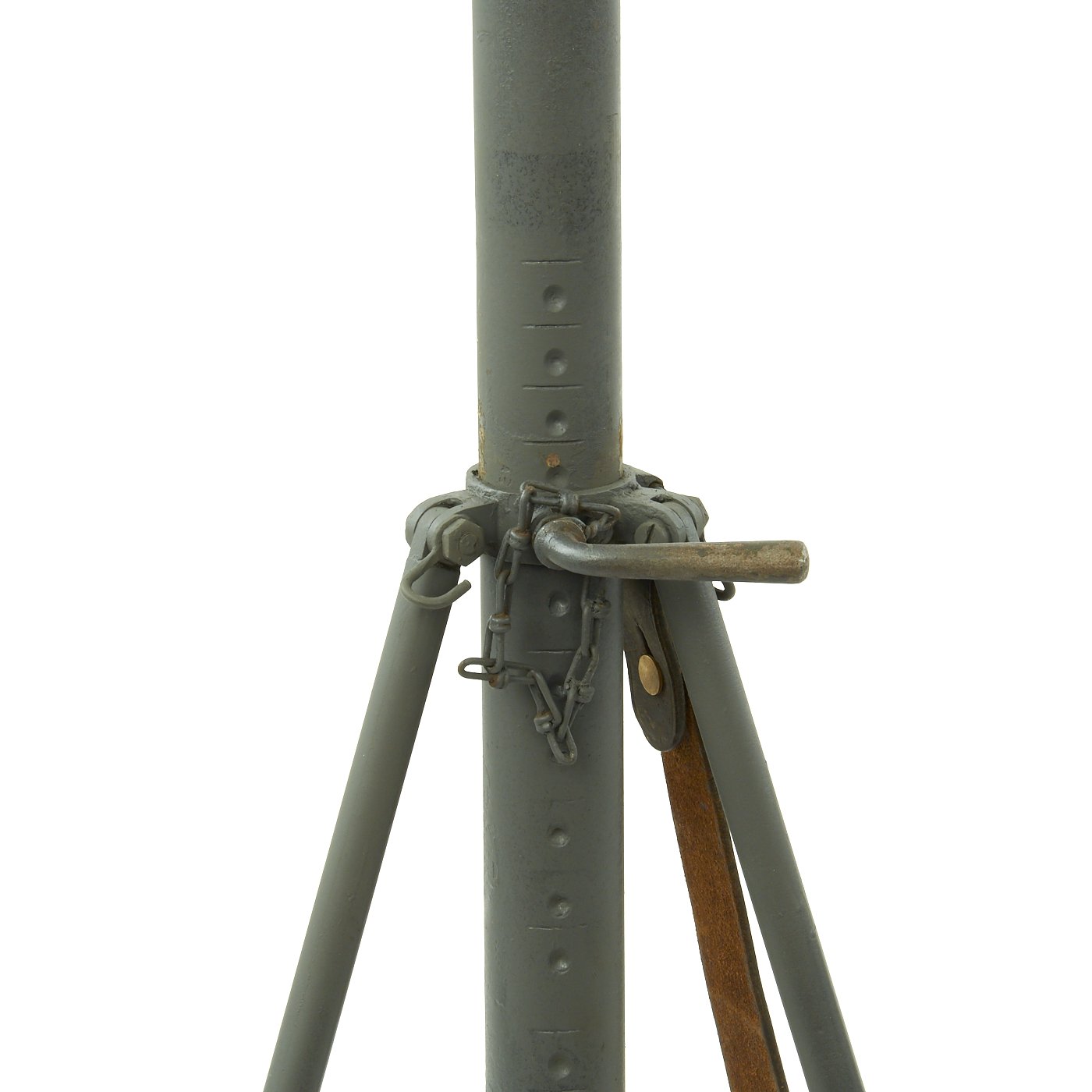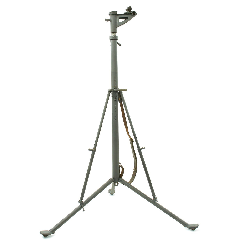 This example of a folding tripod mount is offered in fully functional overall excellent good condition. Its was recently stripped and repainted with correct German Panzergrau Grey color paint. It features folding collapsible legs, height adjustable neck, MG 34/13 mounting cuff and can stand between 4' and 6' tall. A rare and excellent accessory for any Mg34 or Mg13 collector.