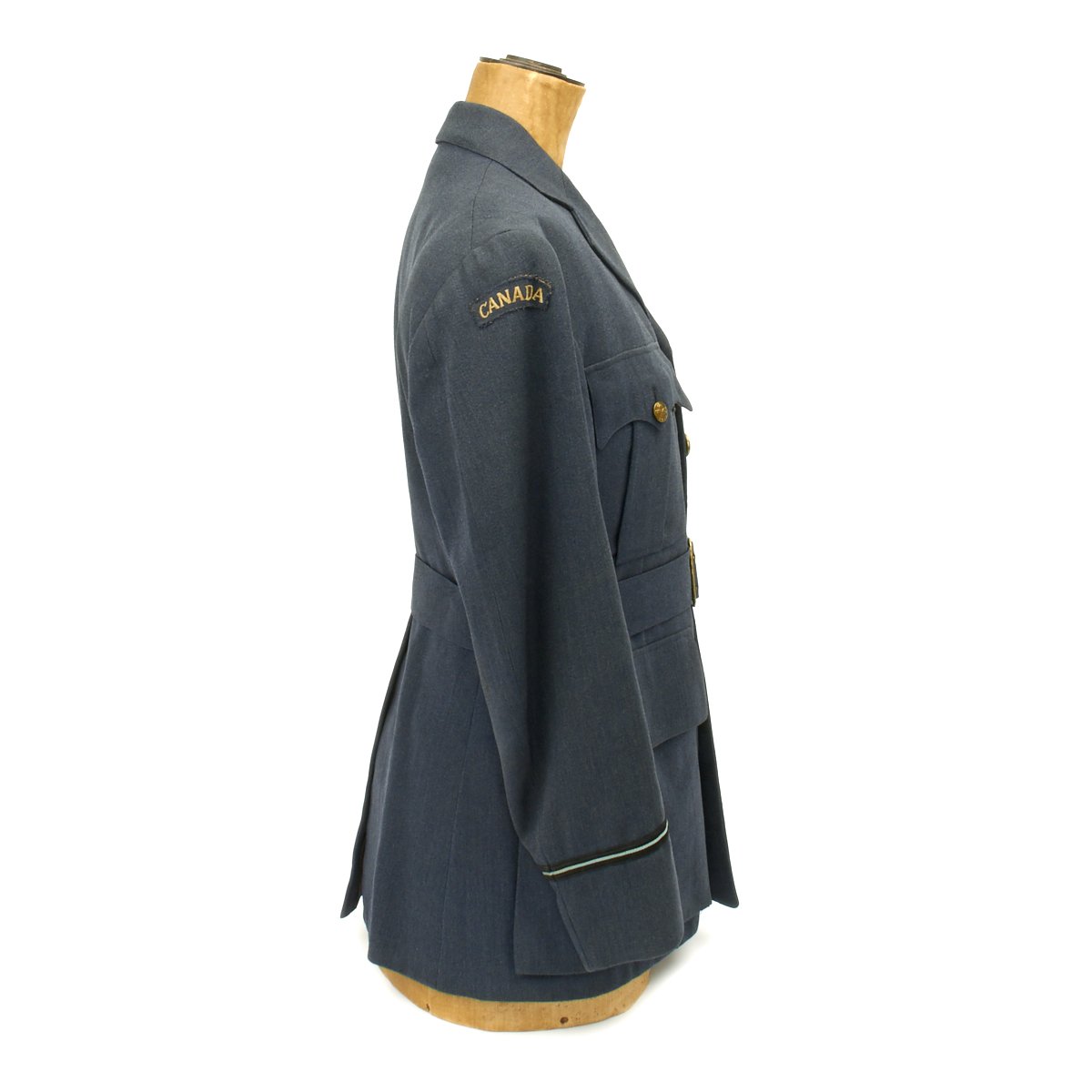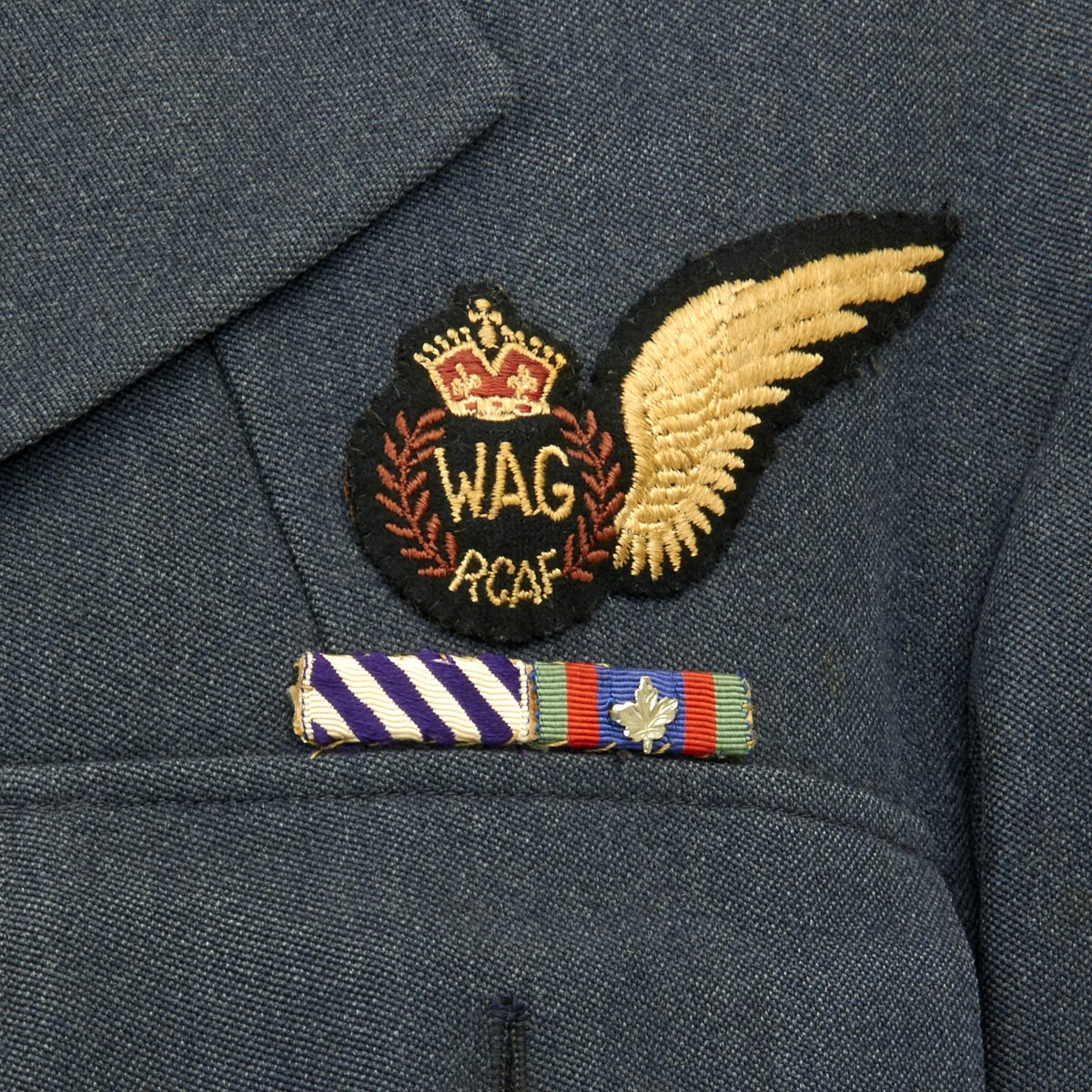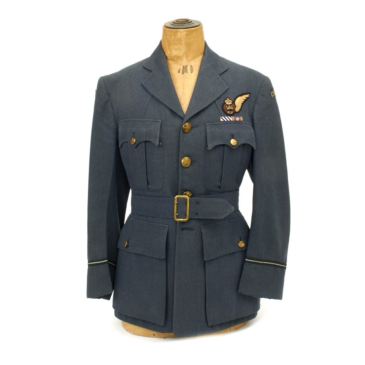 Original Item: Only One Available. A very nice RCAF blue wool three-quarter length tunic that is fully lined. It features a open stepped collar with three large RCAF buttons (lowest missing) approximately 2.5cm in diameter. It is tapered and belted at the waist for a more tailored look with a small watch fob pocket that would be hidden by the belt. A pair of pleated patch breast pockets with scalloped, button flaps, as well as a snap to each corner to keep the flaps flat, as well as two large pockets, also with button flaps are to each hip. A "Canada" shoulder flash to left arm, sewn below the shoulder seam, while the rank stripes with piping in the dark blue and lighter blue encircle each sleeve, representing "Flying Officer" are sewn to each cuff. An embroidered "Wireless Operator Air Gunner" single-winged aircrew brevet with a wreath containing the letters WAG is sewn above the left breast pocket. Also a ribbon bars with the following medals: Distinguished Flying Cross, Canadian Volunteer Service with overseas service silver Maple Leaf. A silk manufacture tag for Smallman & Ingram is sewn directly to the interior over the inside great pocket. The chest measures approximately 38". The tunic shows light usage and wear with no staining.