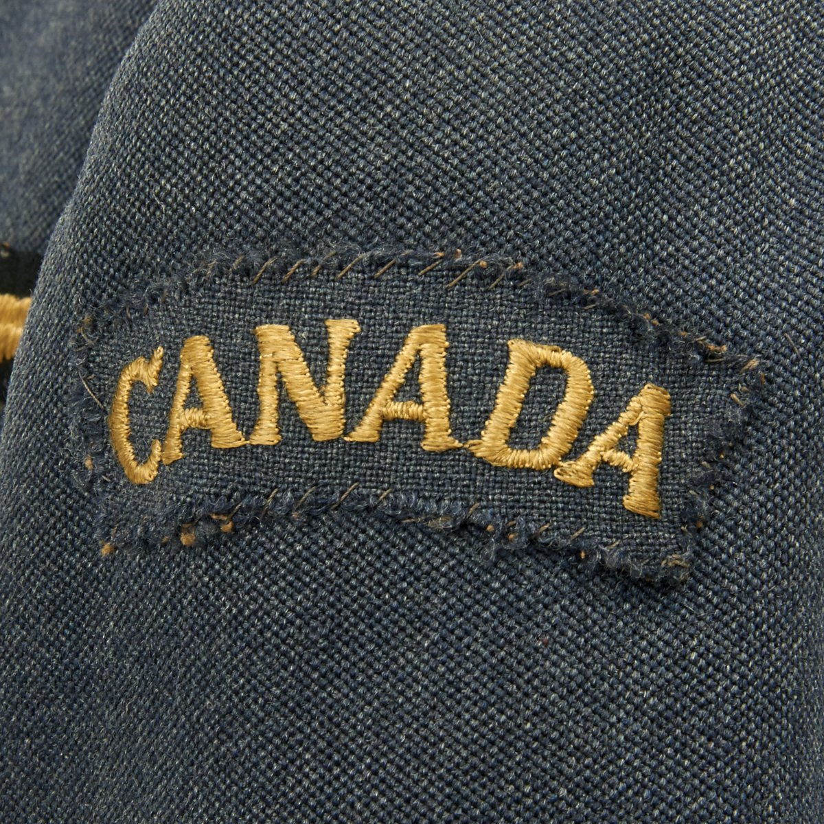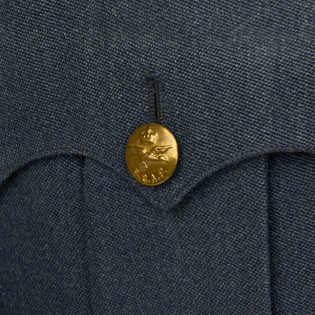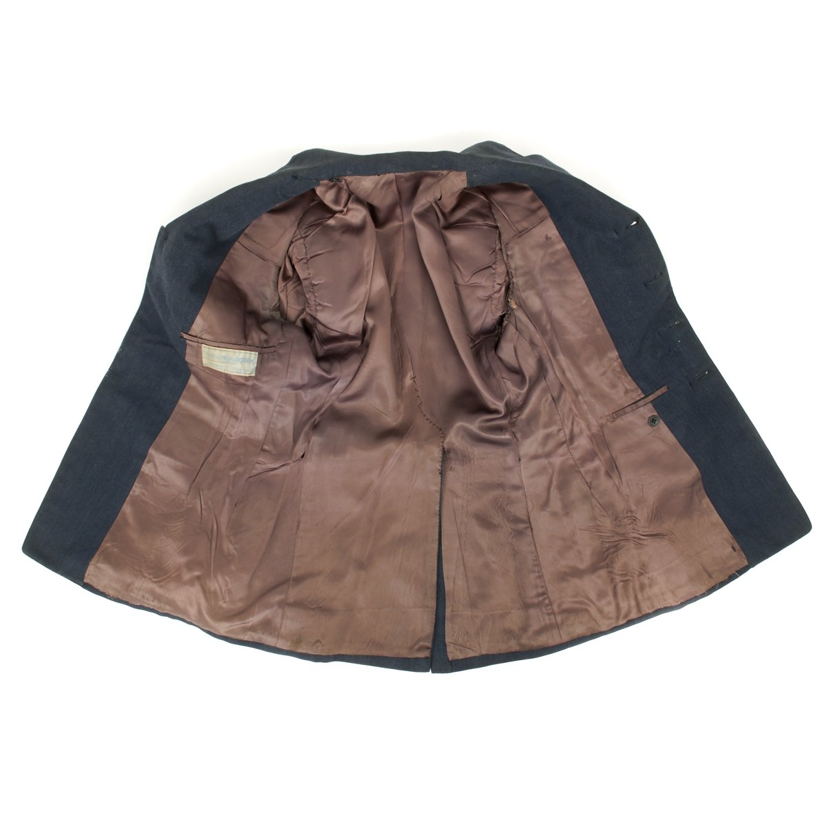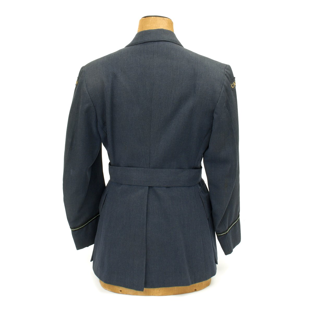 Original Item: Only One Available. A very nice RCAF blue wool three-quarter length tunic that is fully lined. It features a open stepped collar with three large RCAF buttons (lowest missing) approximately 2.5cm in diameter. It is tapered and belted at the waist for a more tailored look with a small watch fob pocket that would be hidden by the belt. A pair of pleated patch breast pockets with scalloped, button flaps, as well as a snap to each corner to keep the flaps flat, as well as two large pockets, also with button flaps are to each hip. A "Canada" shoulder flash to left arm, sewn below the shoulder seam, while the rank stripes with piping in the dark blue and lighter blue encircle each sleeve, representing "Flying Officer" are sewn to each cuff. An embroidered "Wireless Operator Air Gunner" single-winged aircrew brevet with a wreath containing the letters WAG is sewn above the left breast pocket. Also a ribbon bars with the following medals: Distinguished Flying Cross, Canadian Volunteer Service with overseas service silver Maple Leaf. A silk manufacture tag for Smallman & Ingram is sewn directly to the interior over the inside great pocket. The chest measures approximately 38". The tunic shows light usage and wear with no staining.