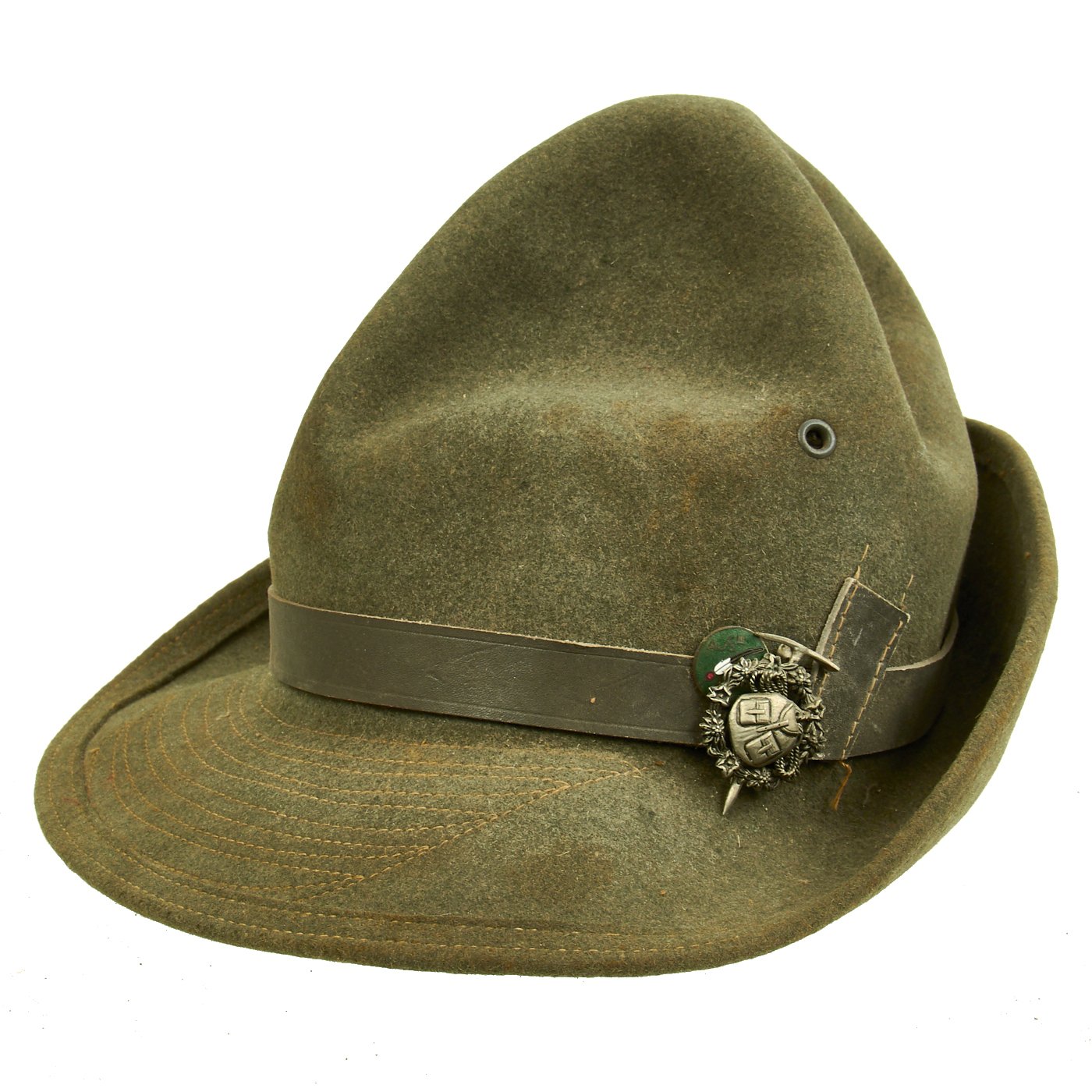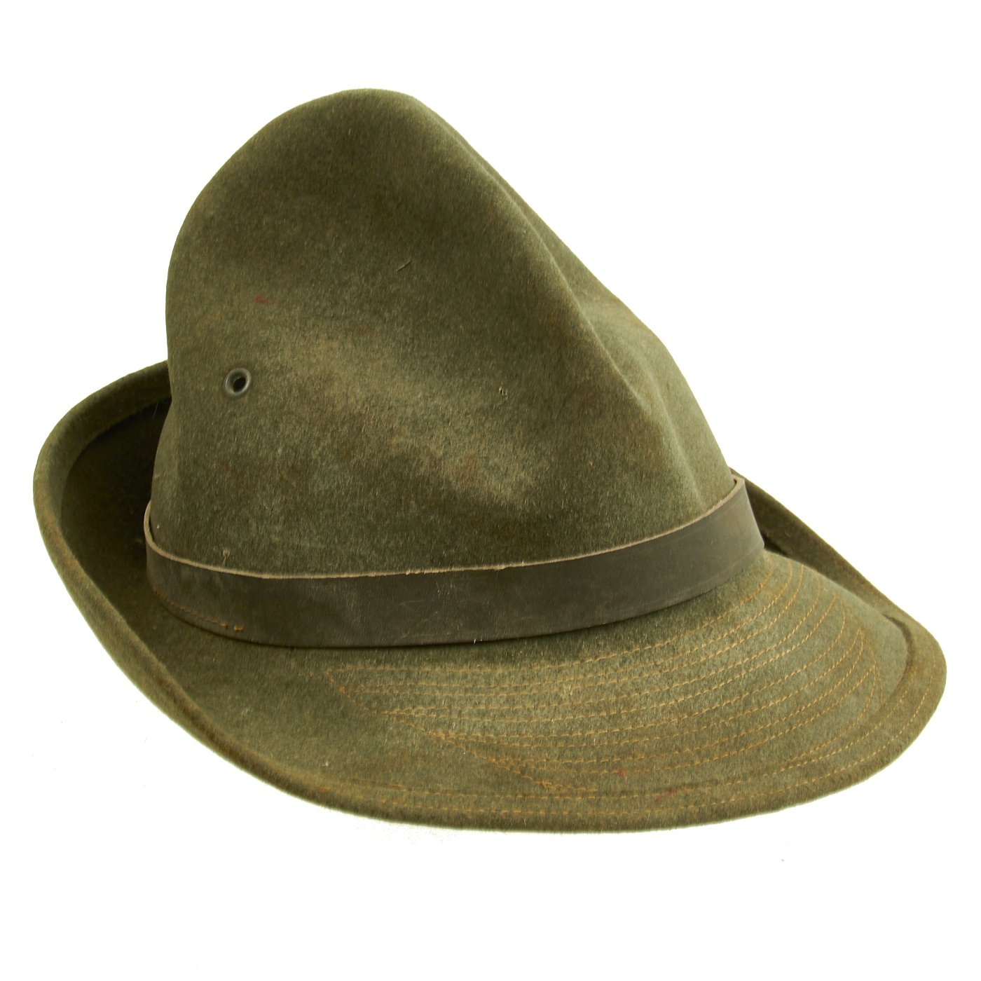 Original Item: Only One Available. Very nice felt Robin Hood style wool hat with leather band around the base and a leather feather pocket (no feather). Attached to the band are two pins. One is and enamel round pin featuring a red/white/blue feather. The other pin is an alpine motif with pick, climbing rope and back pack surrounded by laurel leaves. Leather sweatband with ball cotton lining. Shows some wear but overall nice condition, approximate size US 7 (56 cm).