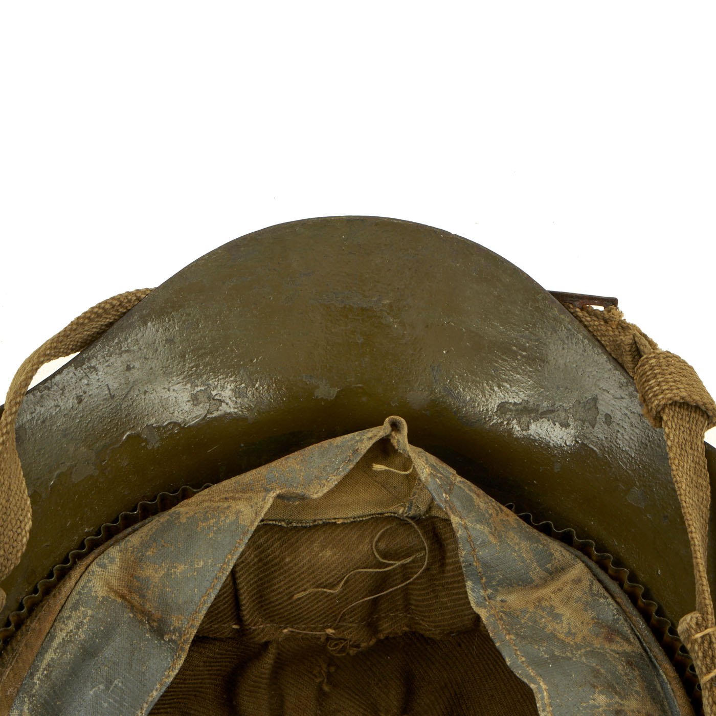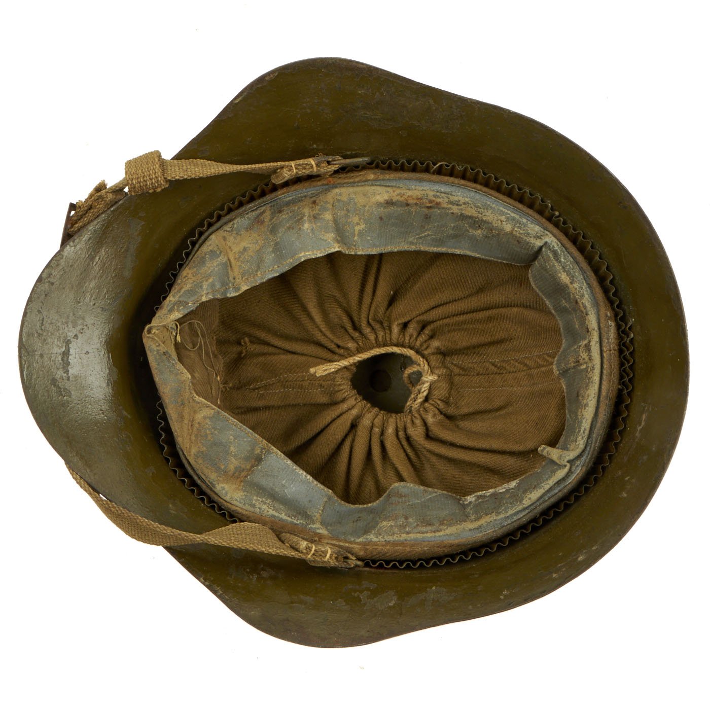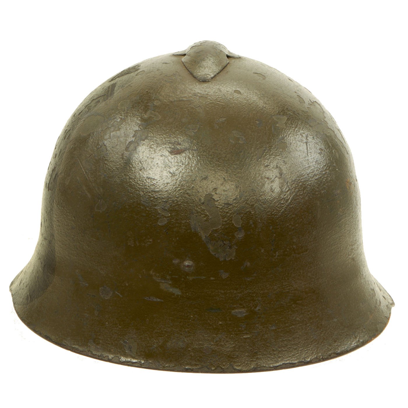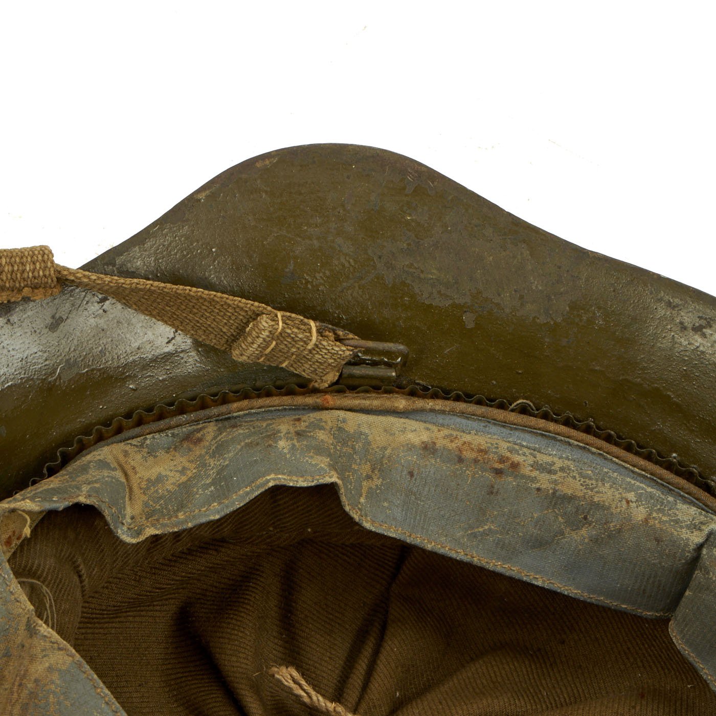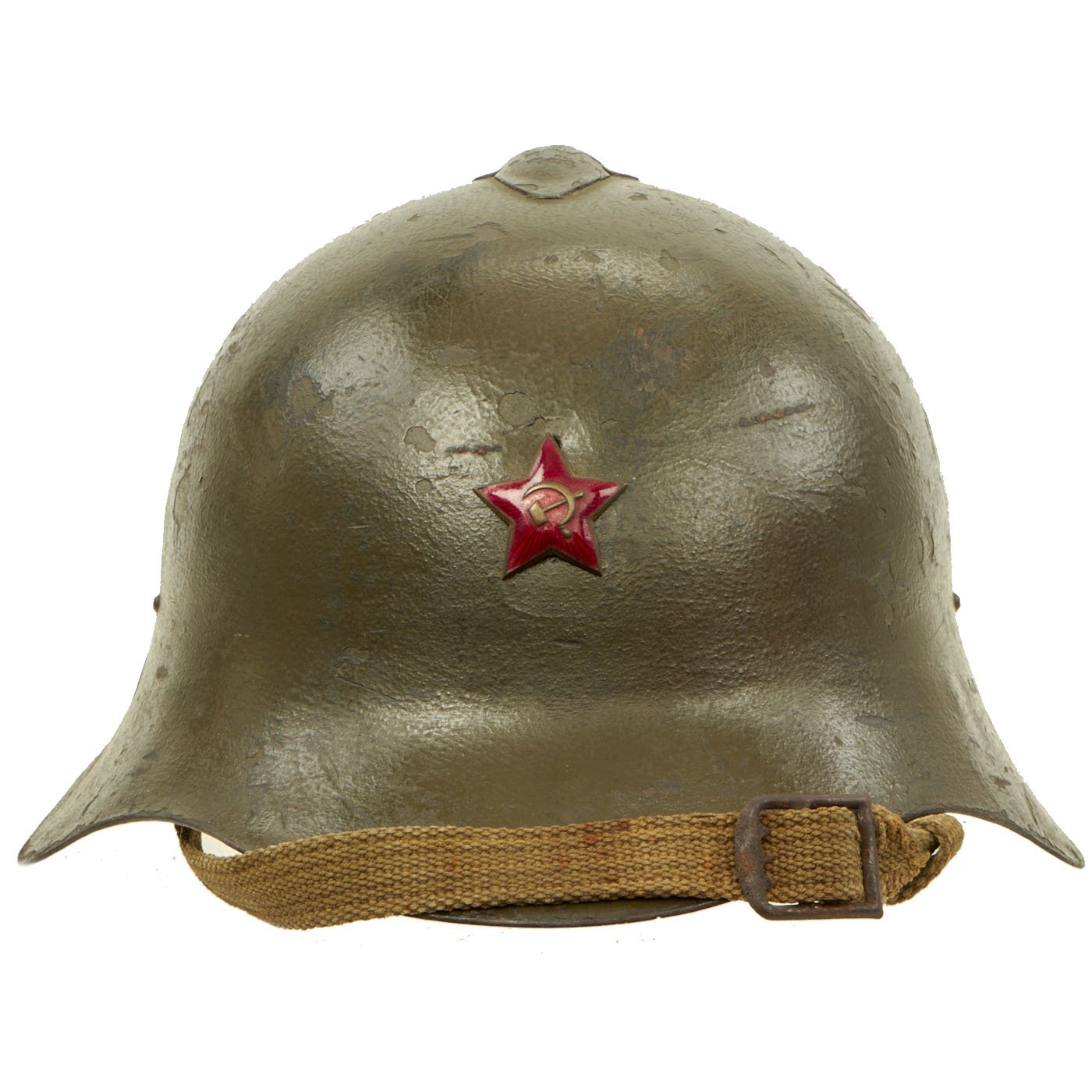 Original Item: Only One Available. This is a fine example of a Russian WWII Issue SSh-36 Combat helmet, with correct shell stamping on the rear of the skirt: 3 - 1542. It comes complete with the original cloth liner over corrugated metal with an oilcloth sweatband. The original canvas chin strap is present and in great shape. Size looks to be about medium - approximately a US 7 1/4 (58cm) and offered in overall very good condition. There are no stress cracks, as often seen, there are no real dents or damage to speak of, just the usual wear from use and age.