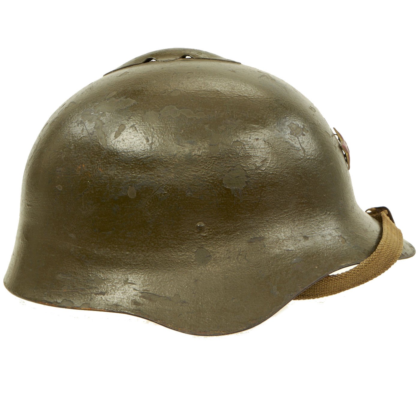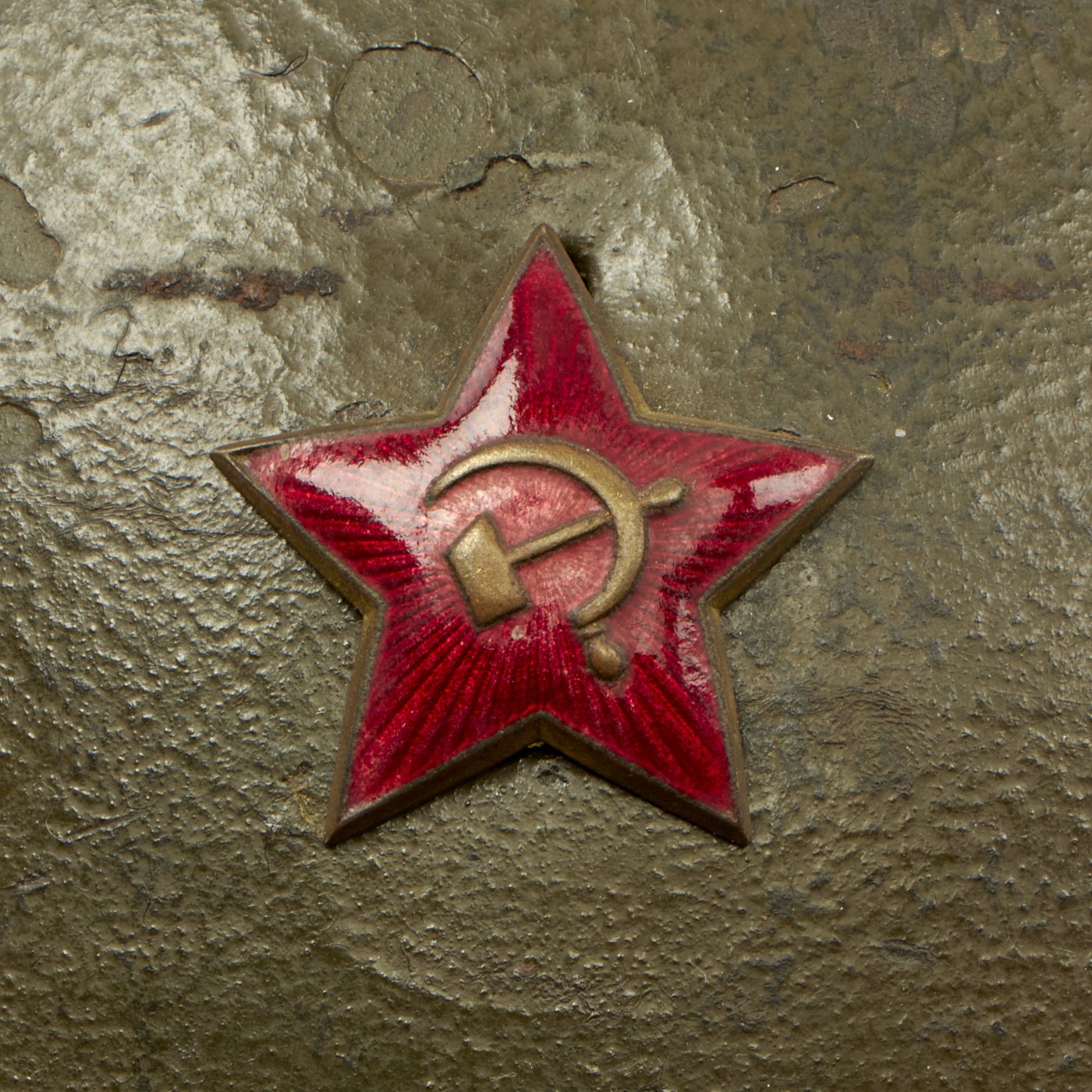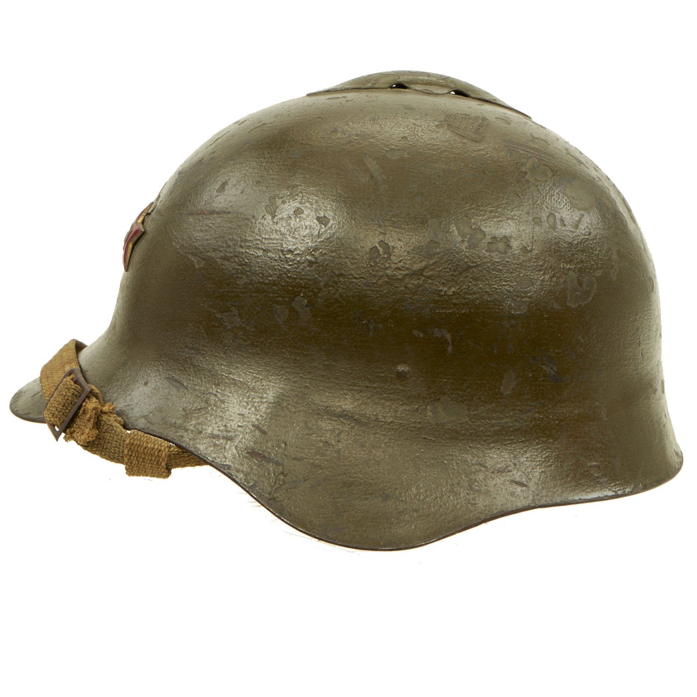 The helmet has been repainted post war, and at some point had holes punched in the front, so that a "Soviet Star" badge could be installed. We do not know if this was done officially in service, or at sometime after it was sold out of service.