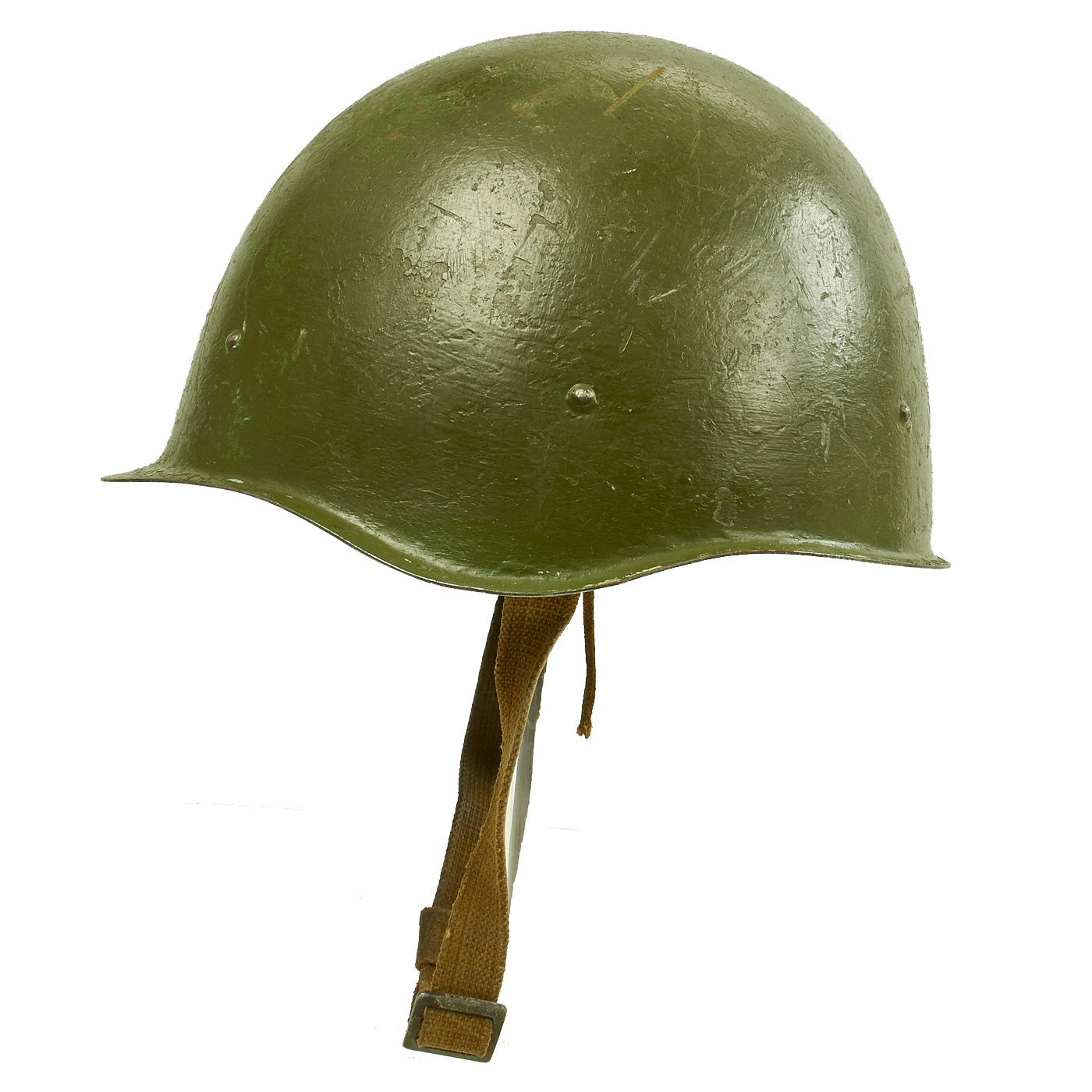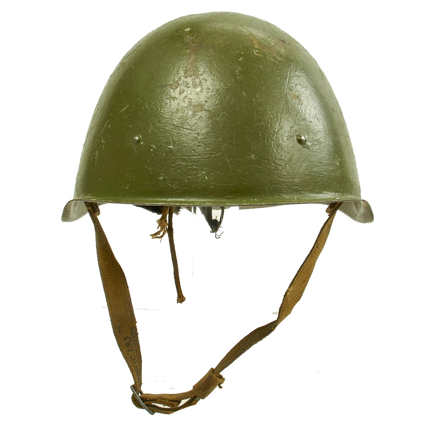 Original Item: Only One Available. The SSh (Russian: Стальной шлем - Stal'noy shlem or Steel Helmet) 40, also referred to as the M40 (Model 40), was the last and most commonly seen in-service helmet used by the Soviet Union during World War II. The only external difference between the SSh-39 and the SSh-40 were the six rivets near the bottom of the helmet, as opposed to the three near the top of the SSh-39 shell. Rivet placement of the SSh-40 was due to a newly introduced liner, simpler and more sturdy than the previous versions.