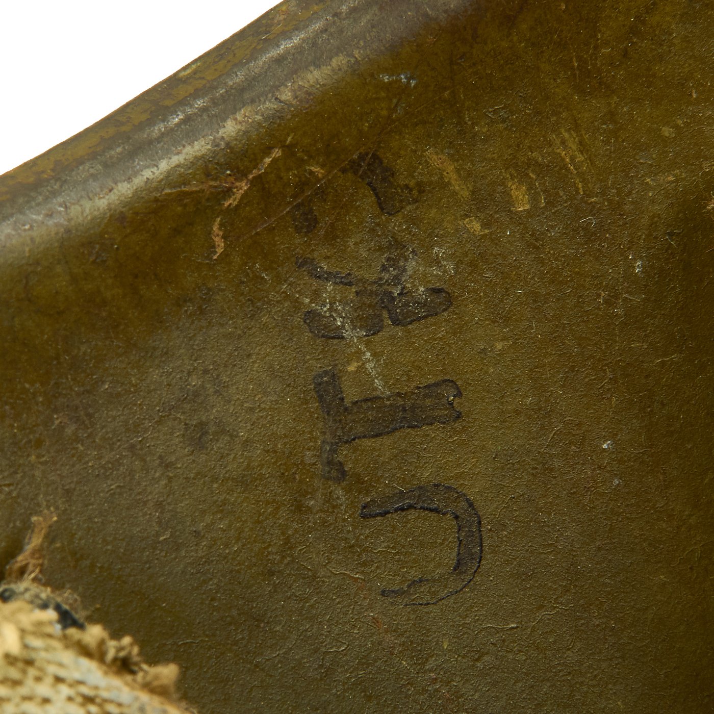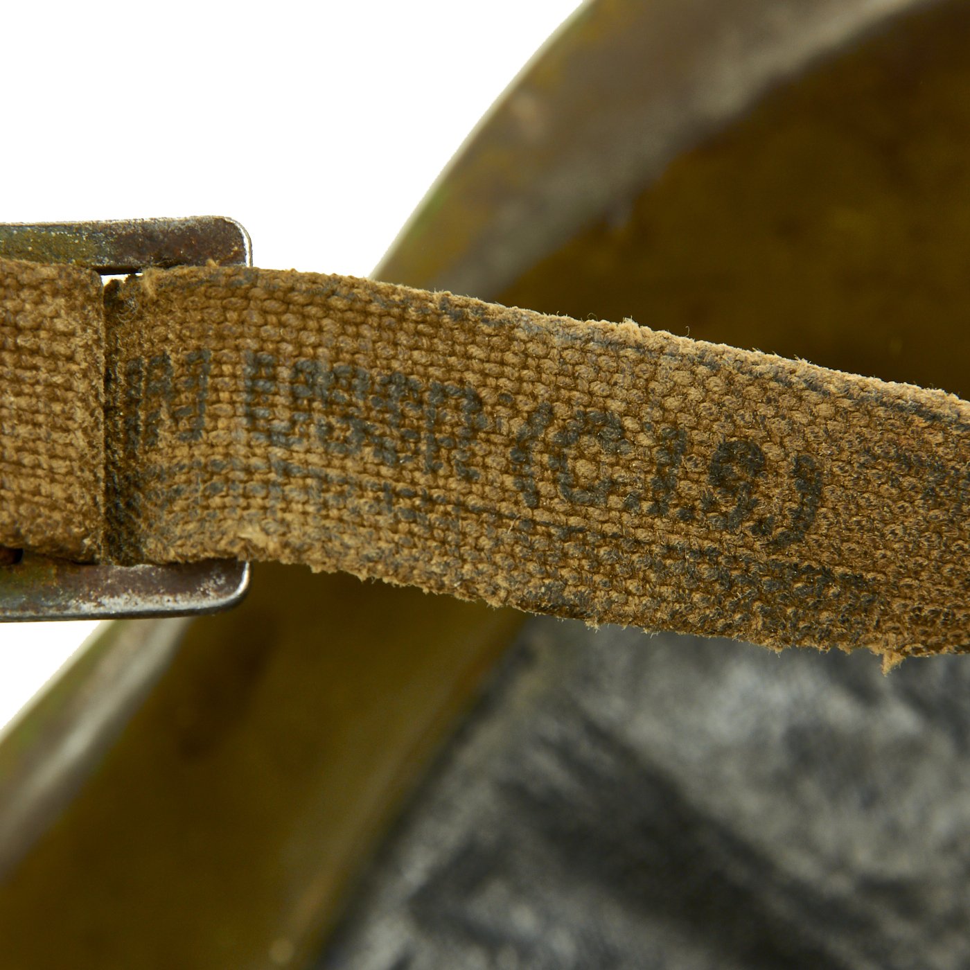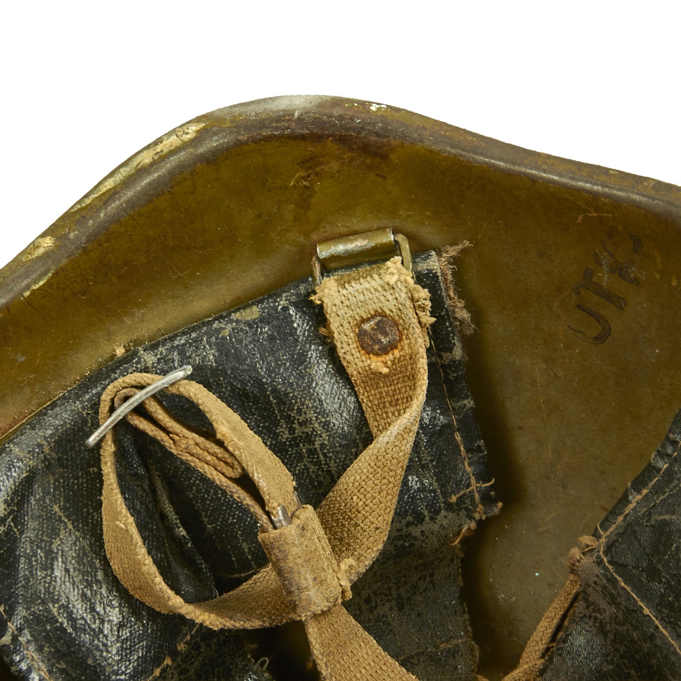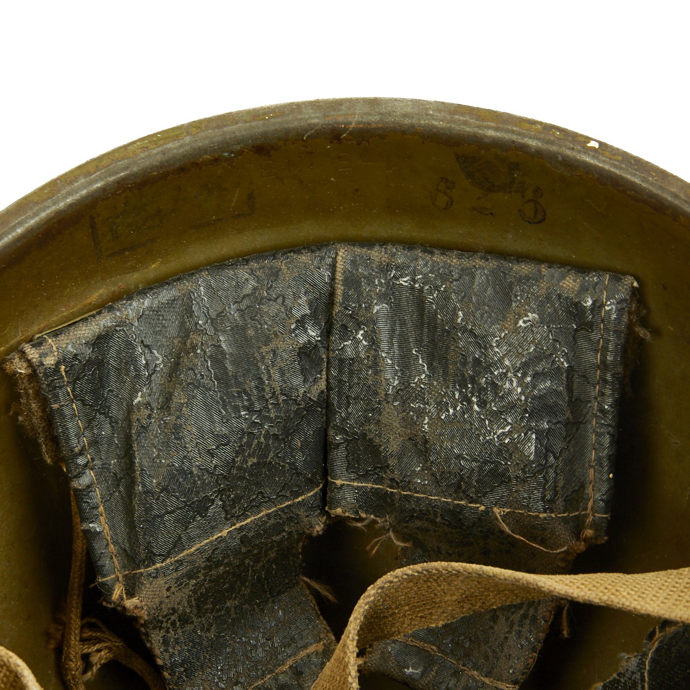 This is a very good example complete with liner and chinstrap, all correct, and in very nice service worn condition. The inside of the shell bears multiple original issue stamps, and the rear of the shell has 1 - 5113 stamped into the shell. There are even original markings stamped onto the chin strap. One of the markings should be a date, however it unfortunately has the bottom worn off, so it is not legible.