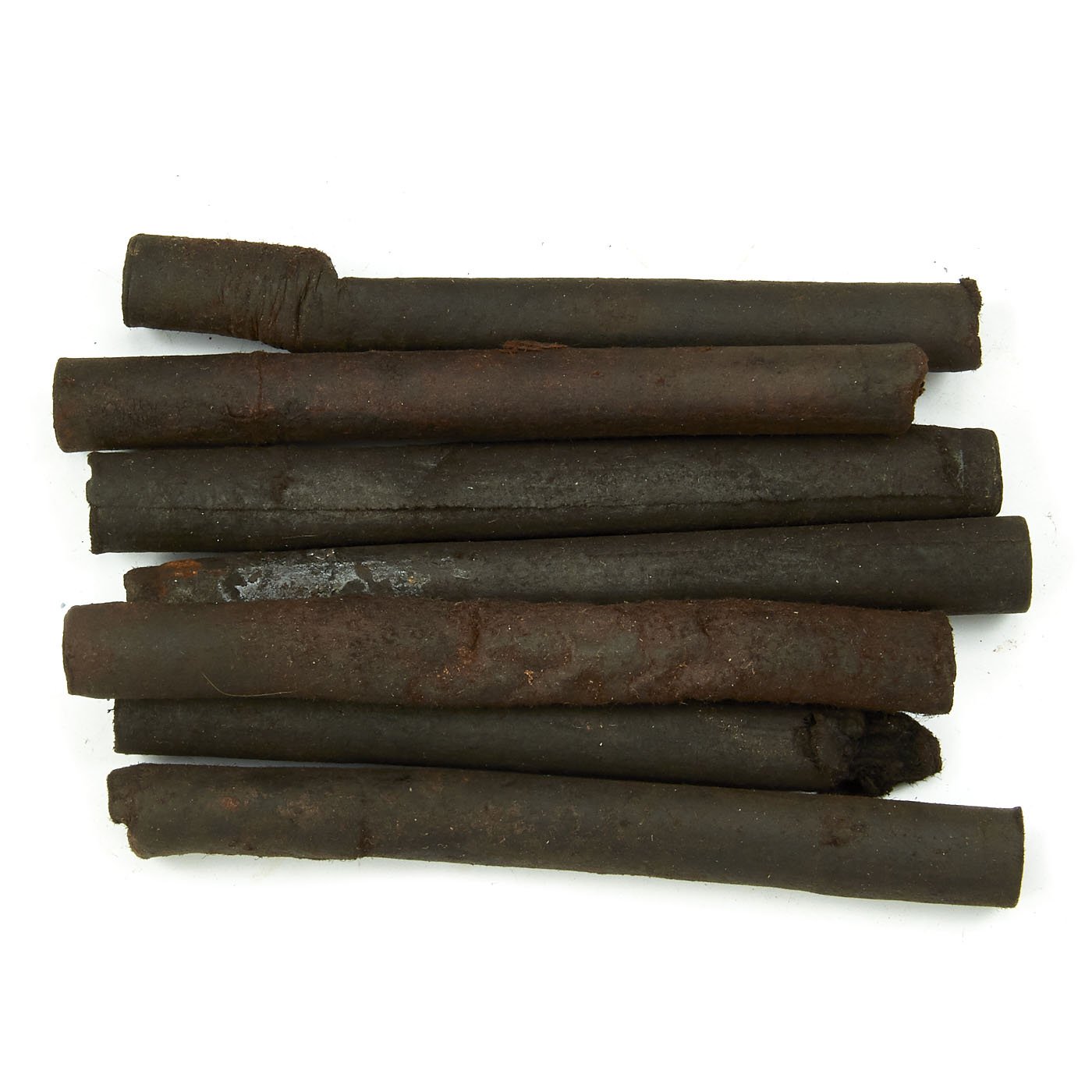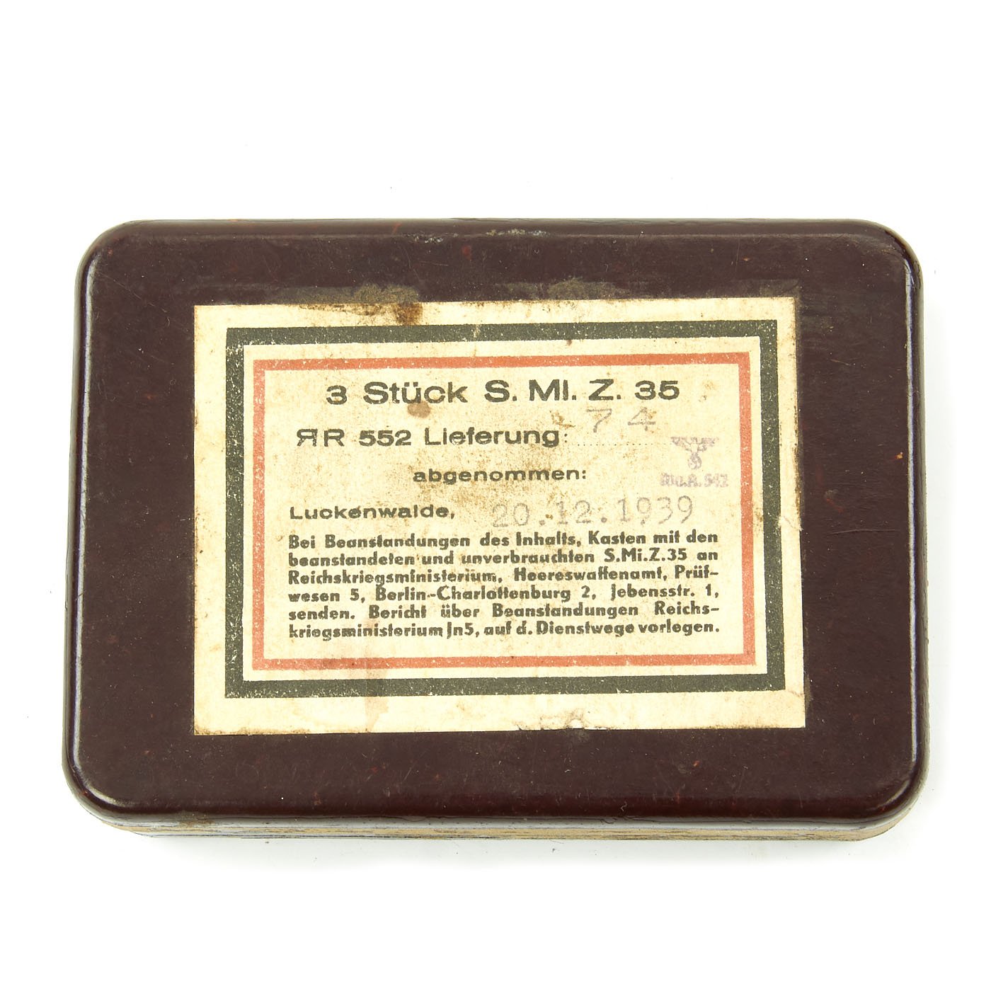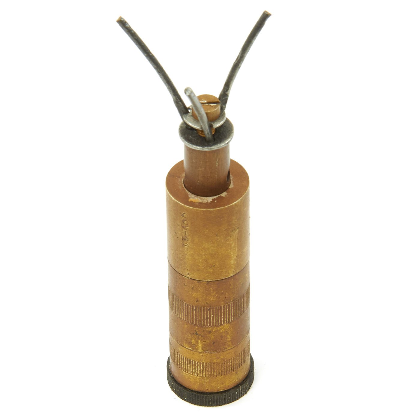 The best part of this set is definitely the bakelite case, marked 3 Stück S. Mi. Z. 35, meaning that it contains 3 pieces of the S. Mi. Z. 35 "Pressure" type fuses, which are made to resemble blades of grass. These fuses are in great shape, and all still have their original bakelite bottom plugs. Even better, each still comes with the original safety pin, which inserts through the stalk. The pins have nuts on the end so that they cannot fall out prematurely, and the other end has a hole in it. This way the mine would be buried, and then a string was used to remove the safety pin, reducing risk to the mine layers. The case also has a Waffenampt Wa.A 542 marking, as well as a date of 20. 12. 1939. All markings are on the tag on the lid, with an identical tag inside the case. The maker marking indicates these were made by one of the many subcontractors of Richard Rinker.