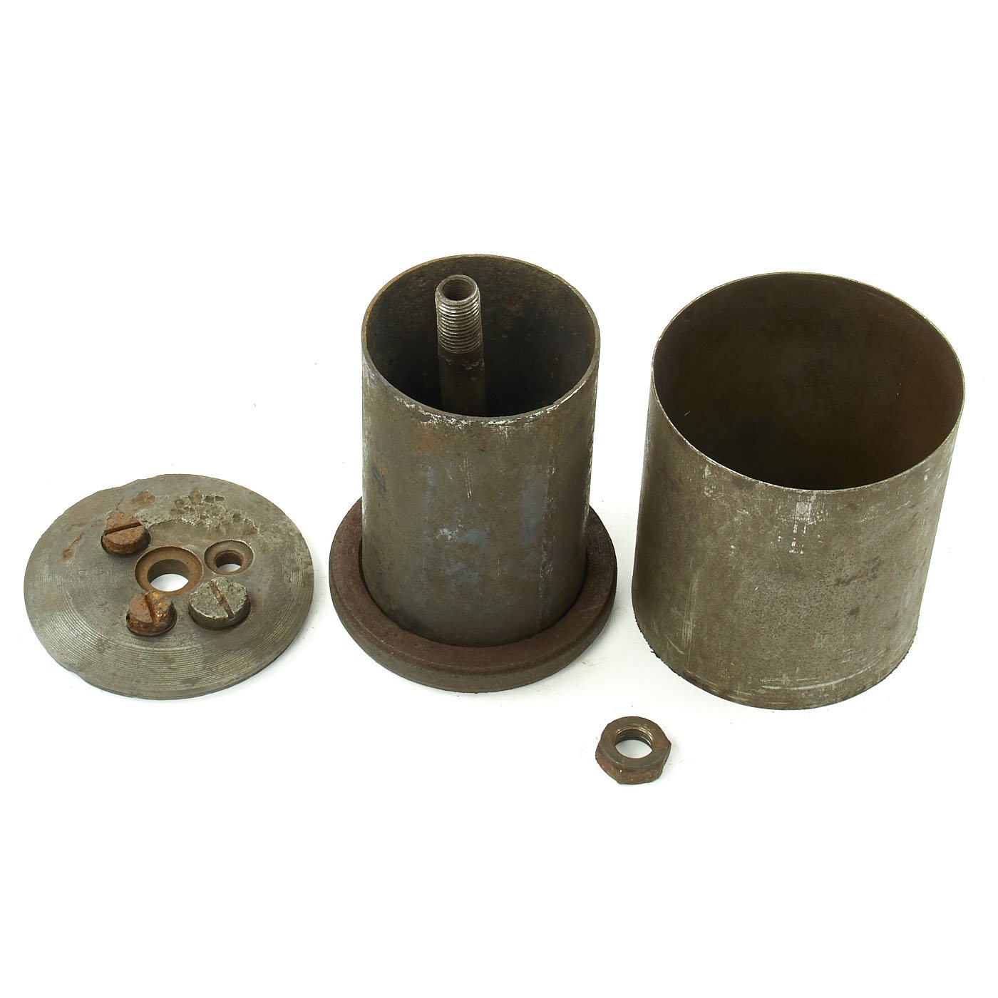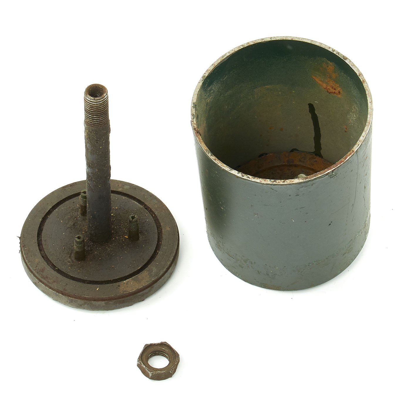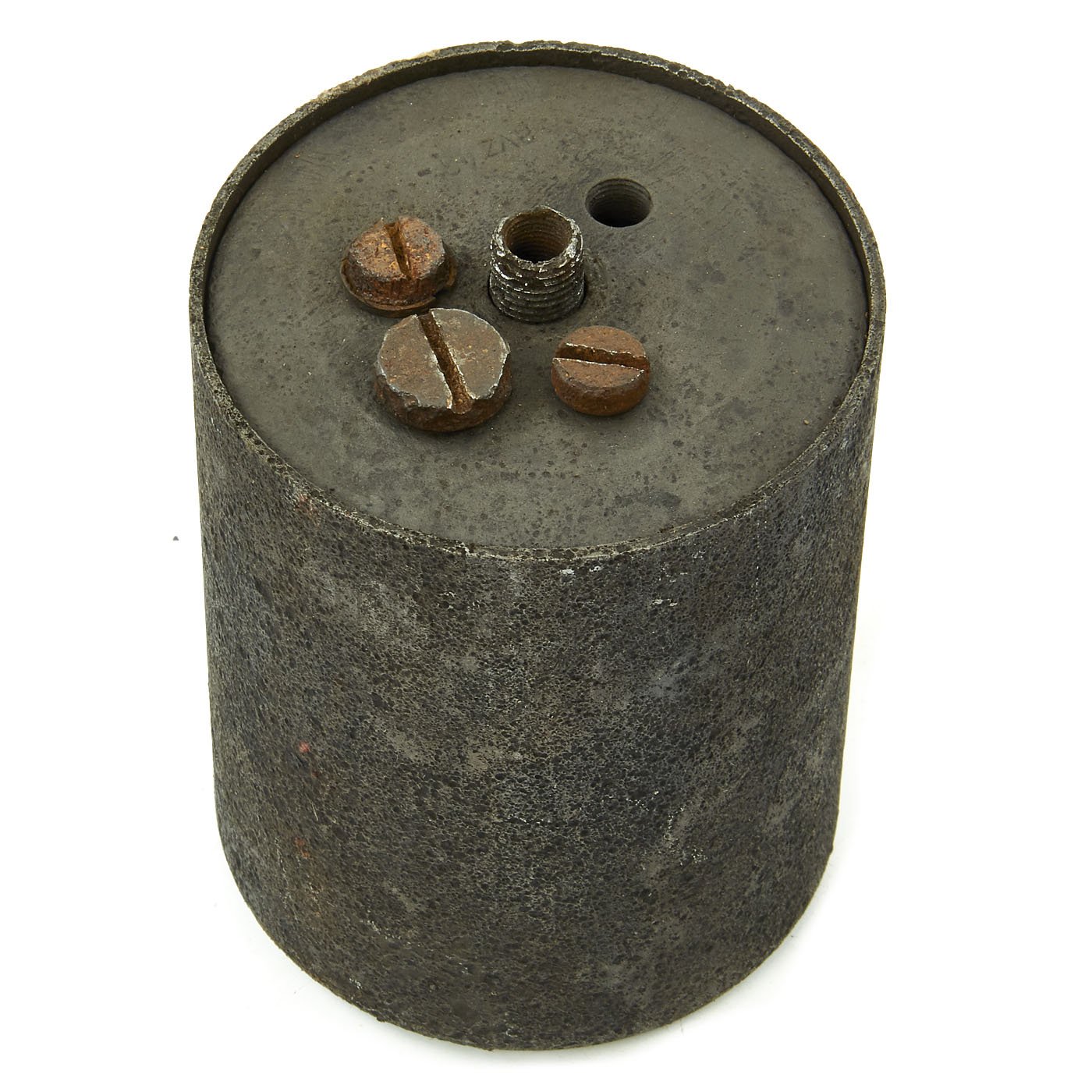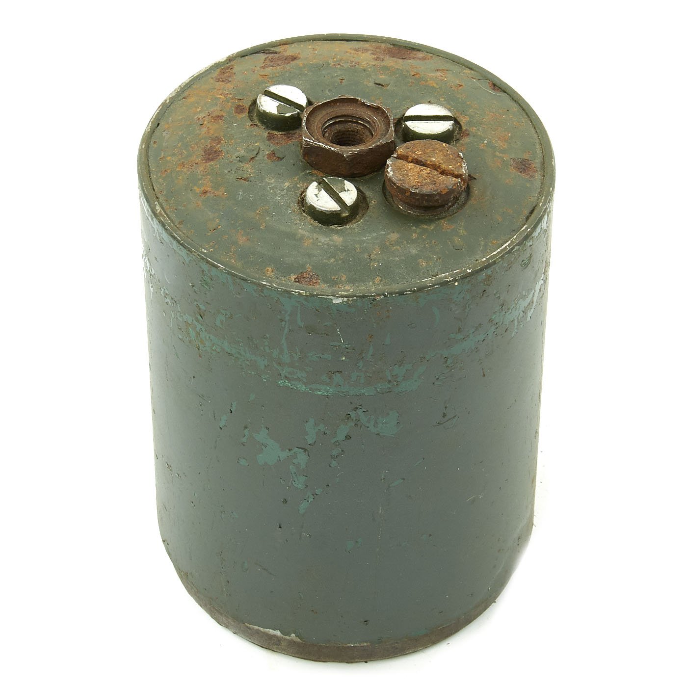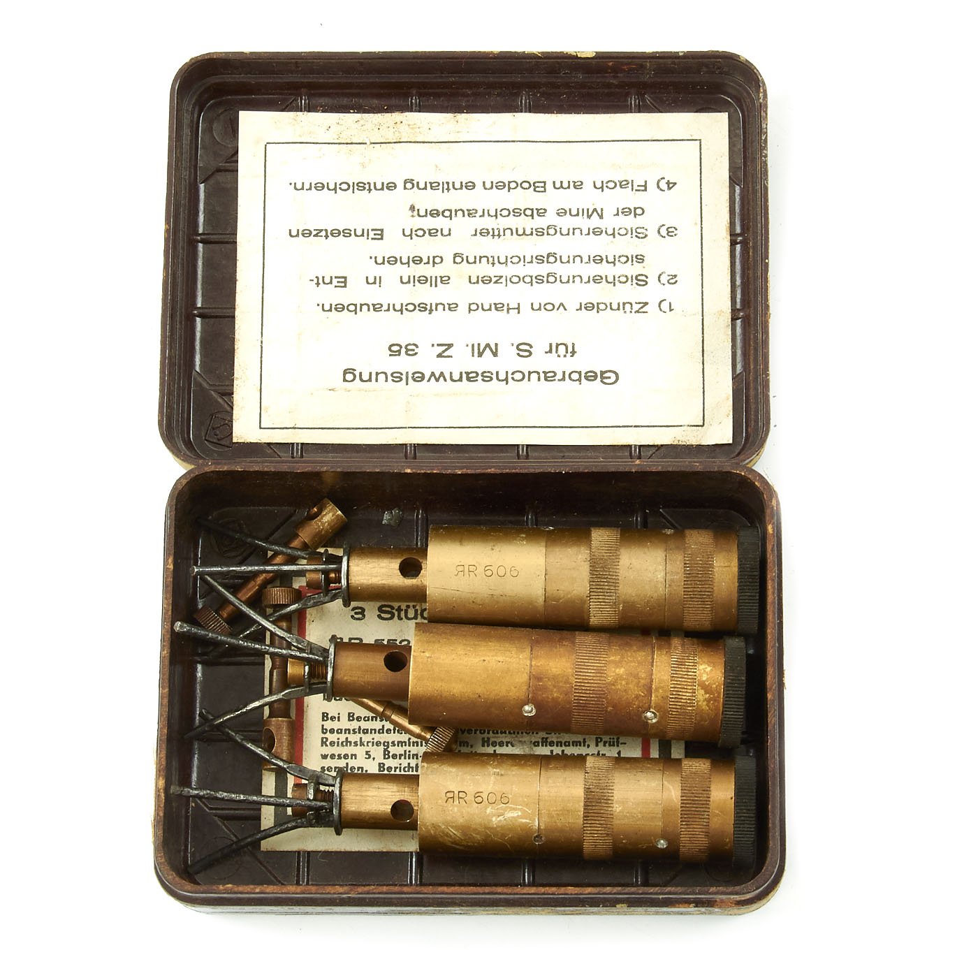 Original Item: Only One Set Available. This is an incredible inert set of three original German WWII S-Mines, contained in an original steel transit chest. Included are multiple original paper detonator fuse tubes, as well as an original 1939 dated bakelite case containing three pressure activated fuses, one for each mine. There is also a bag of original steel shrapnel, which we have not installed in any of the mines in the set.