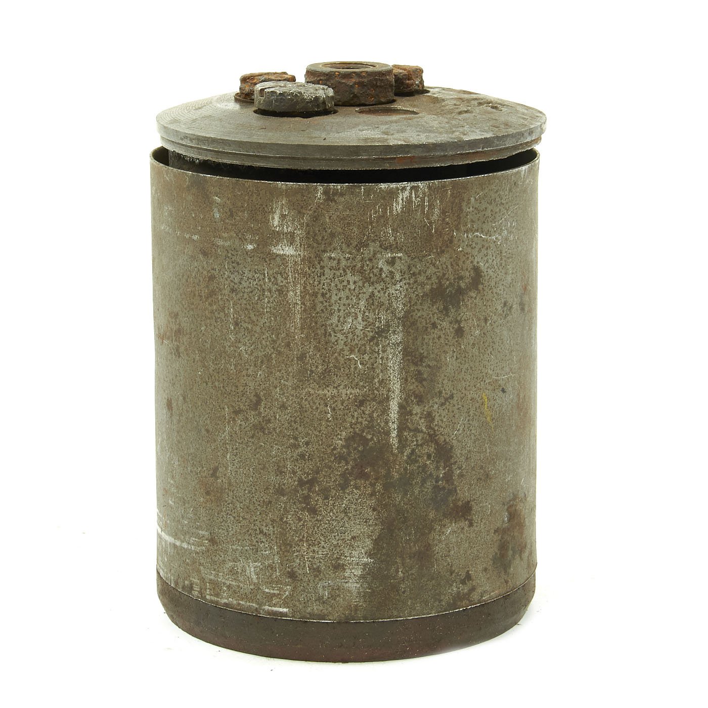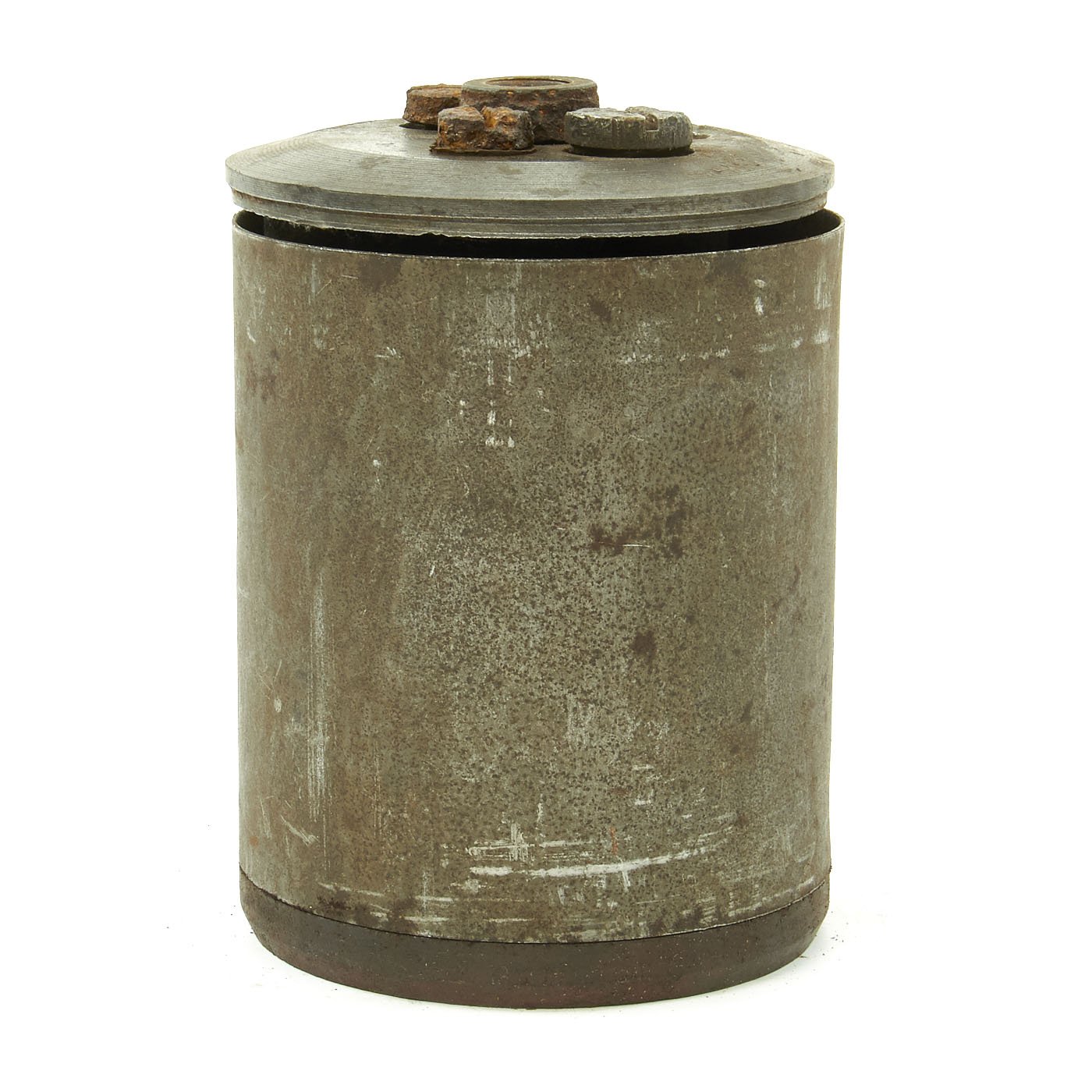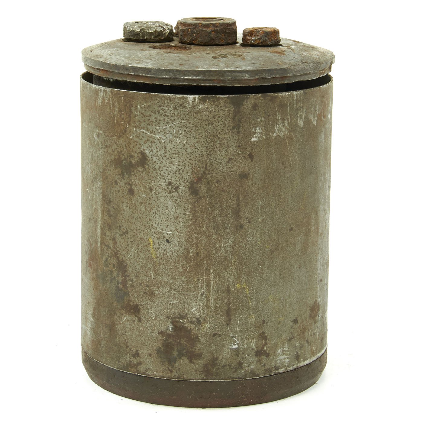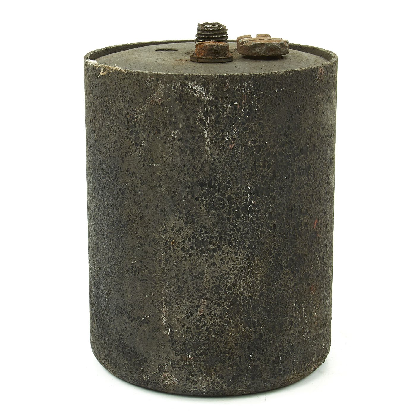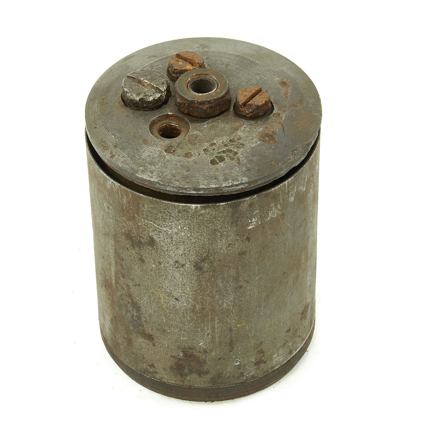 Original Item: Only One Set Available. This is an incredible inert set of three original German WWII S-Mines, contained in an original steel transit chest. Included are multiple original paper detonator fuse tubes, as well as an original 1939 dated bakelite case containing three pressure activated fuses, one for each mine. There is also a bag of original steel shrapnel, which we have not installed in any of the mines in the set.
