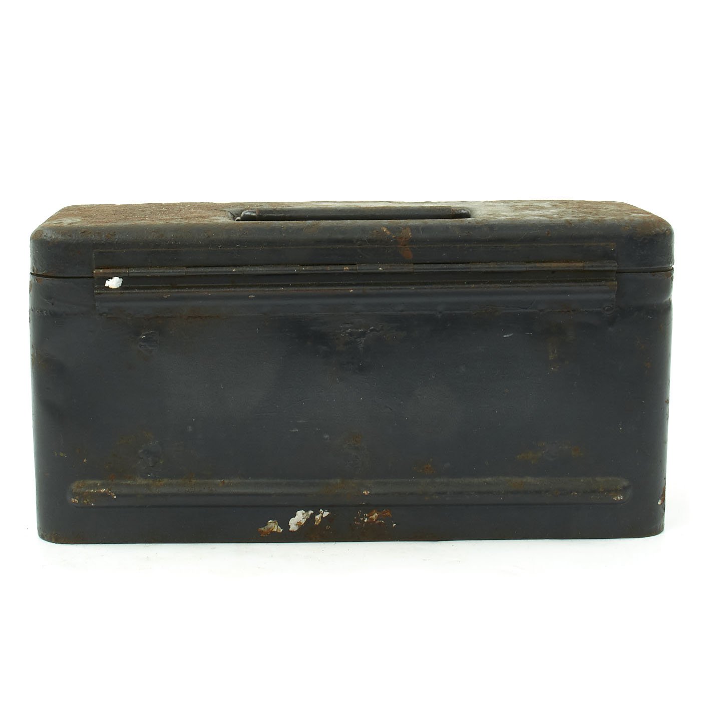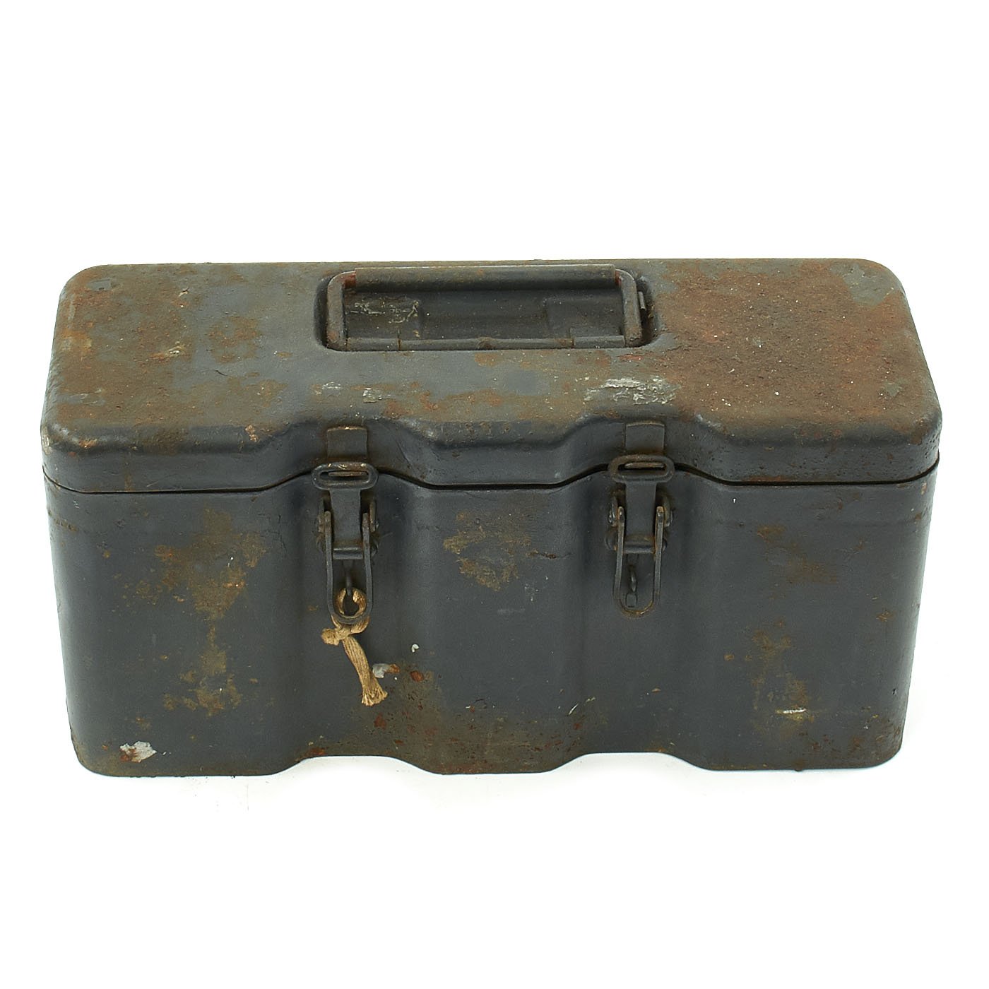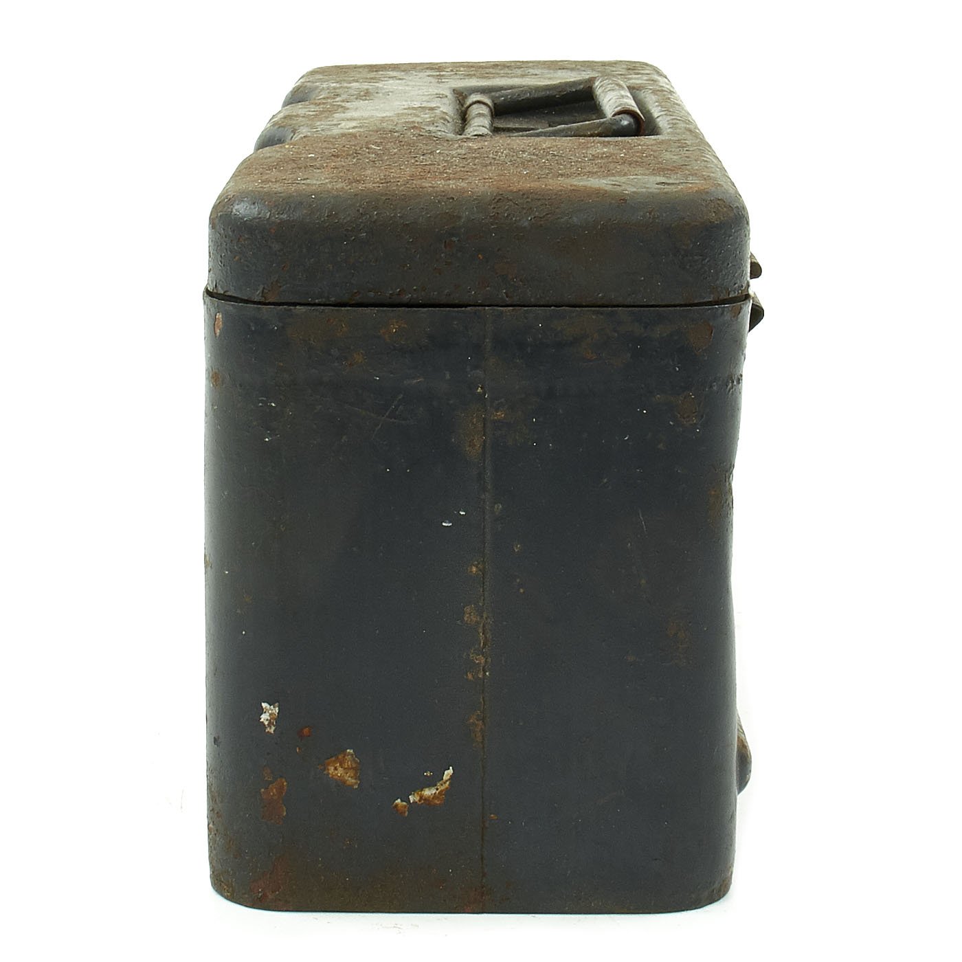 The metal chest is something we have not had before, and it is painted in the typical blue/black paint with red primer that is seen on many original WWII German items. The top handle is still functional as are the two closure latches. Inside there is no padding for the three S-mines, so it was most likely removed, or is a separate piece that we do not have. The chest measures approximately 14" x 7" x 5", and is in very good condition.