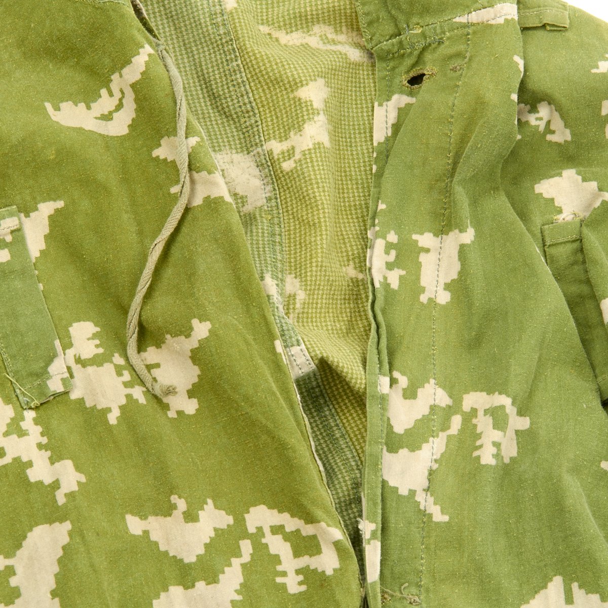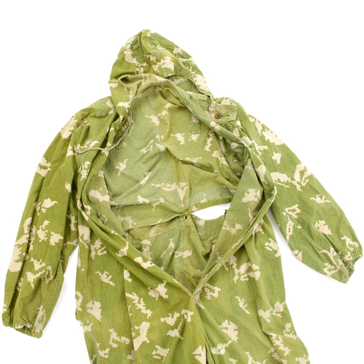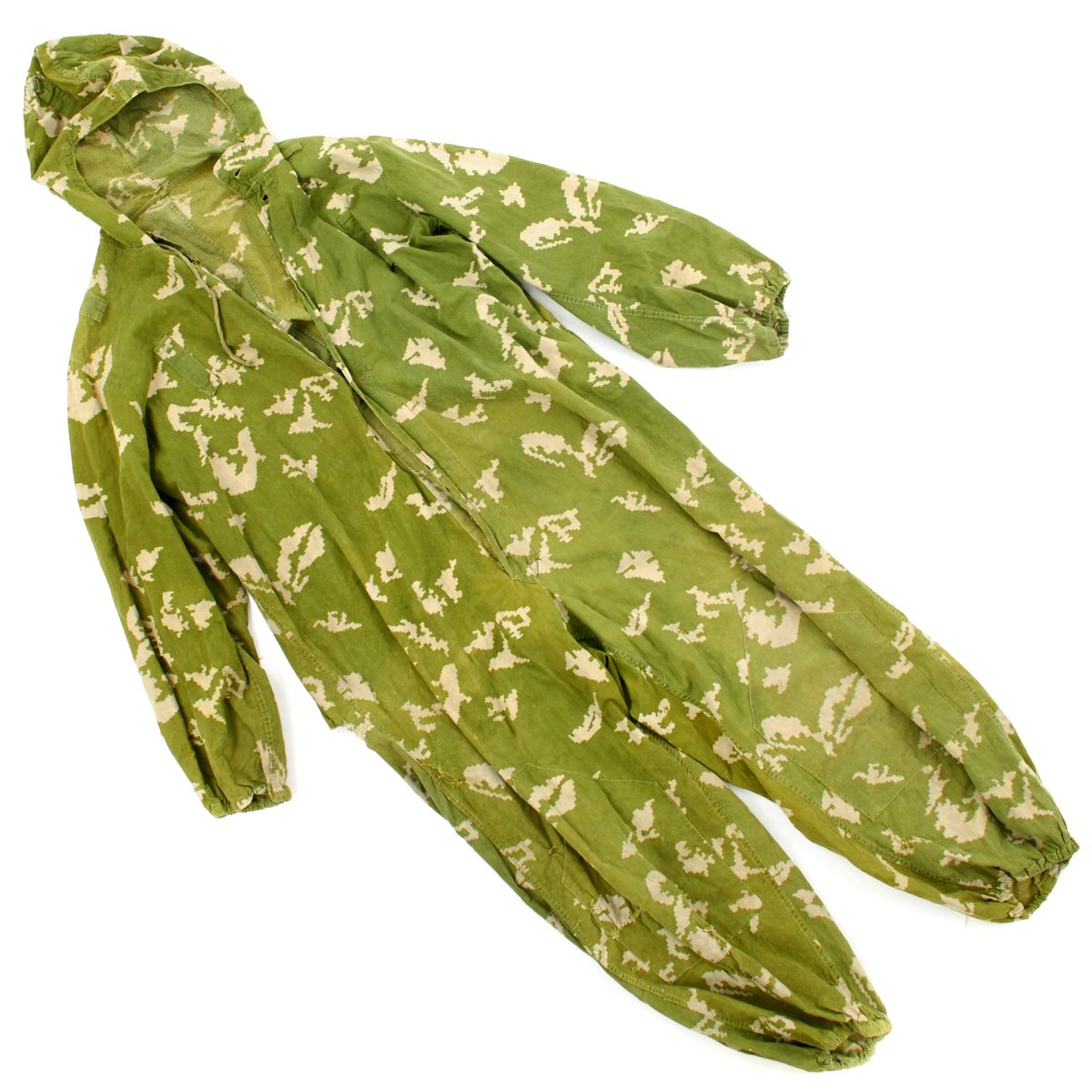 Original Item: Only One Available. This is a late WW2 or early Cold War one-piece Soviet Berezka Amoeba Pattern Camouflage suit constructed of cotton. It is offered in very good condition in approximately a size 42 as it fits a 190 lbs 6'0 man. No visible markings other than on the buttons. Features a hood and elastic cuffs. Very hard to find on the US collector's market and will make an excellent Russian display.