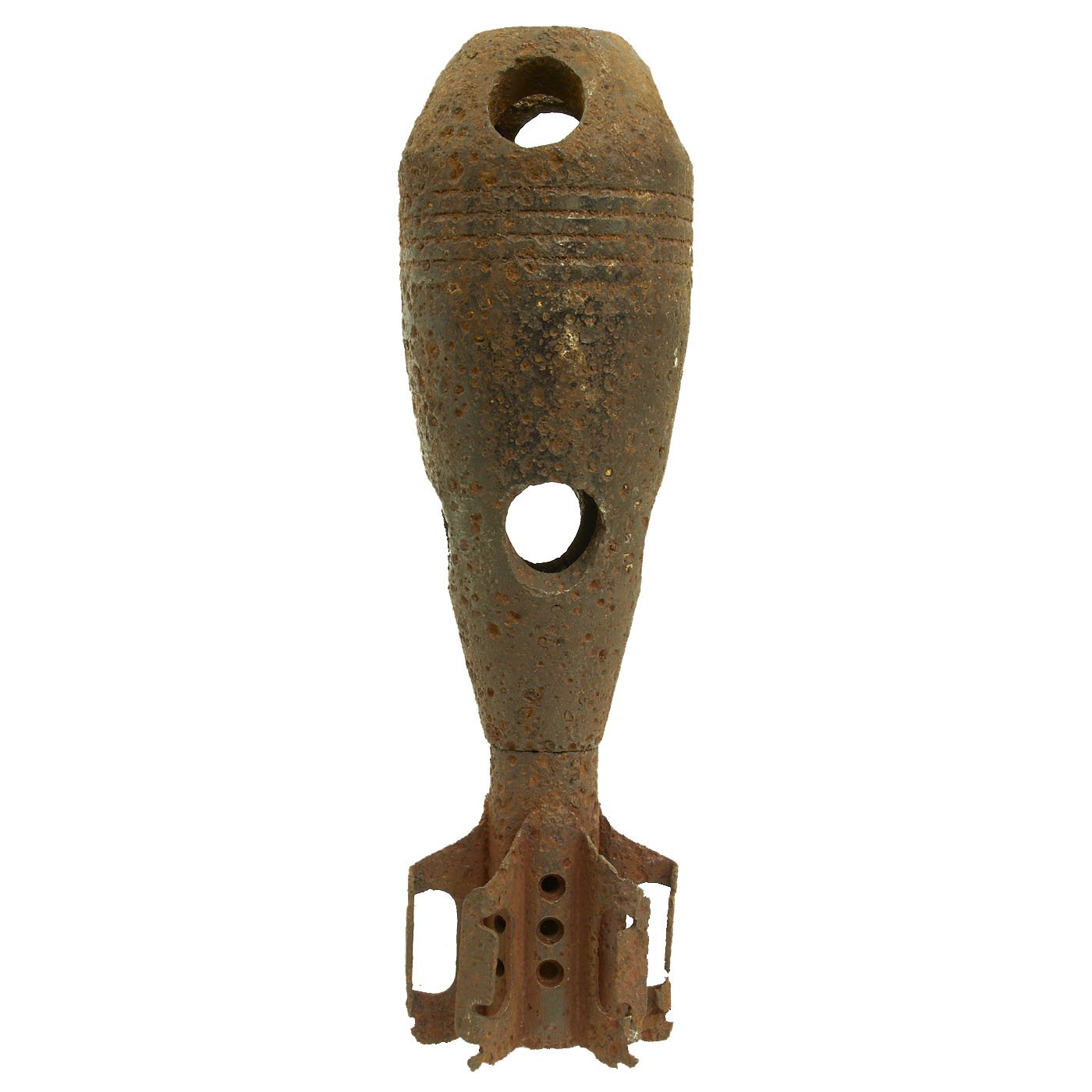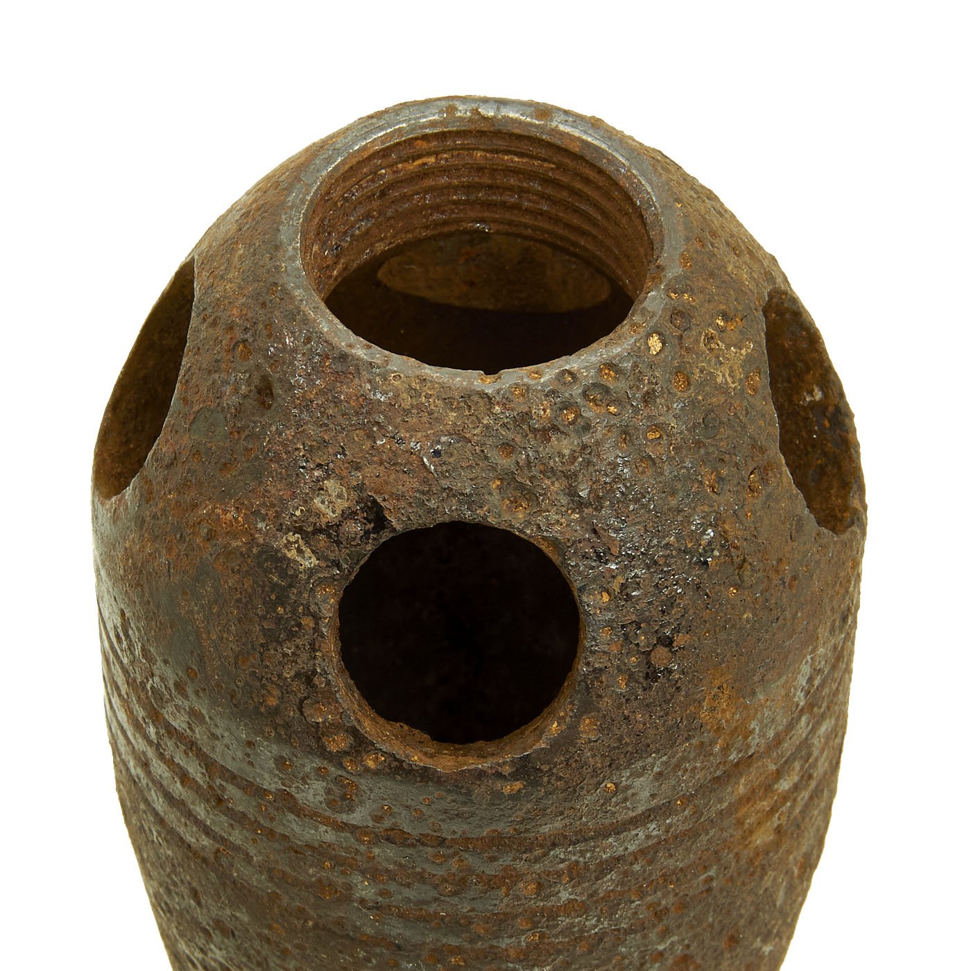 These originally came with a practice fuse, which would cause smoke to escape from the holes in the practice rounds outer shell. There is rust and deterioration due to being left in the ground after it was used for practice, but overall it is still in good shape. We have left the rust intact to preserve the authencity.