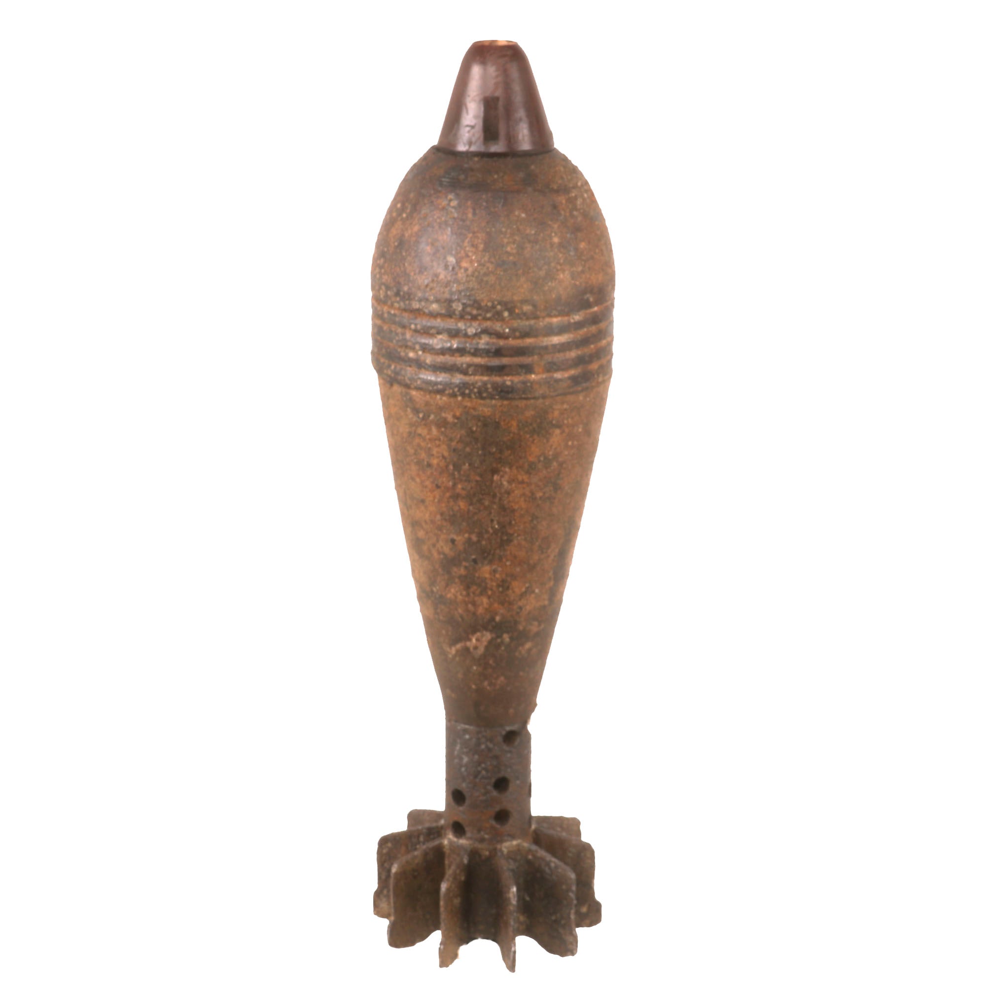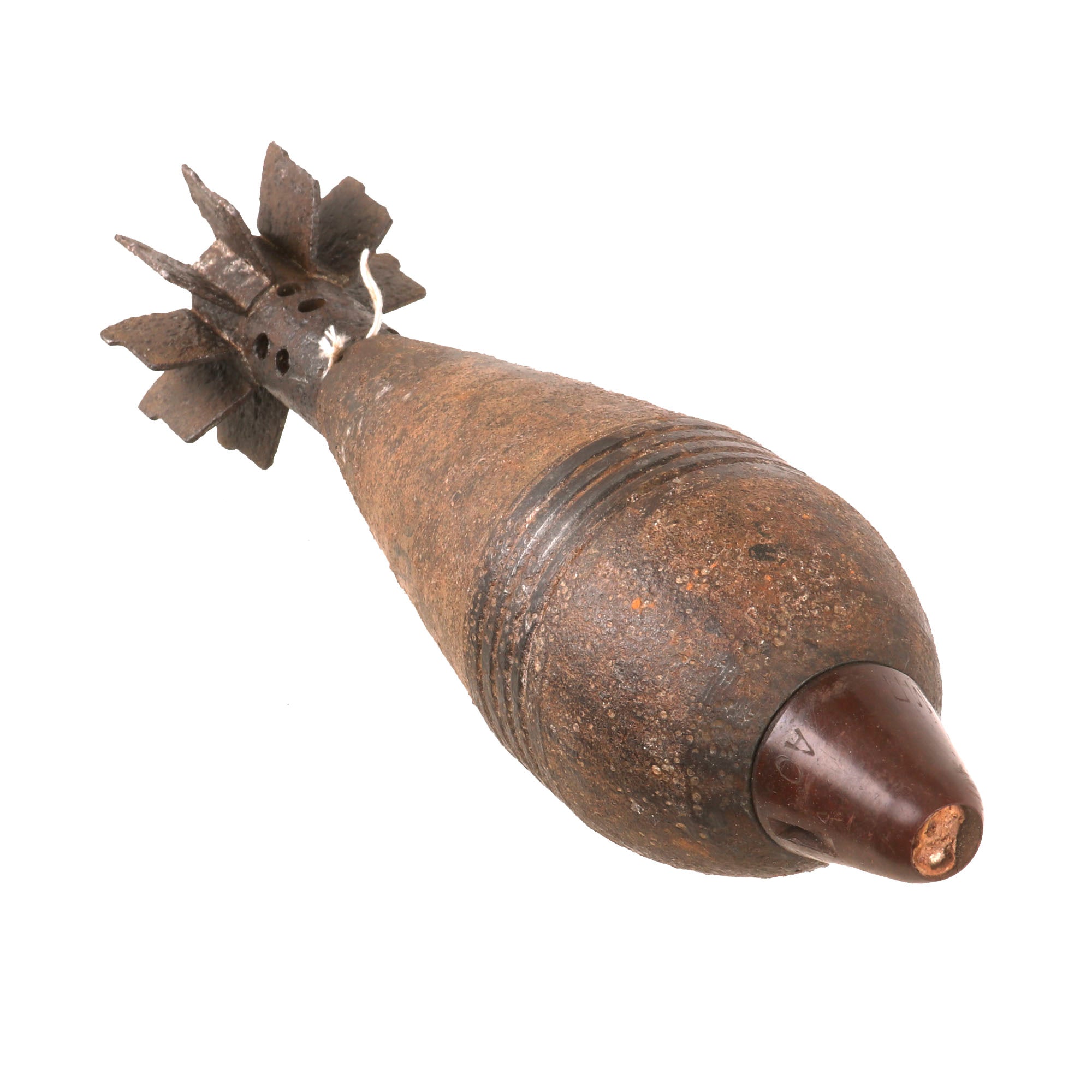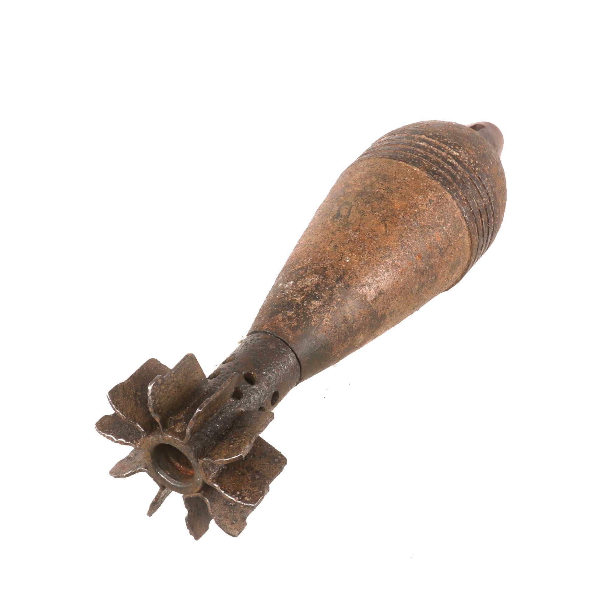There is rust and deterioration due to being left in the ground on the battlefield, but overall it is still in good shape. We have left the rust intact to preserve the authencity. The tail fin assembly is intact with its 5 sets of two fins, for 10 total. The mortar measures 12¾” long overall.