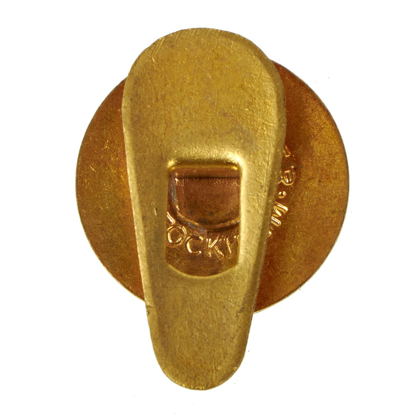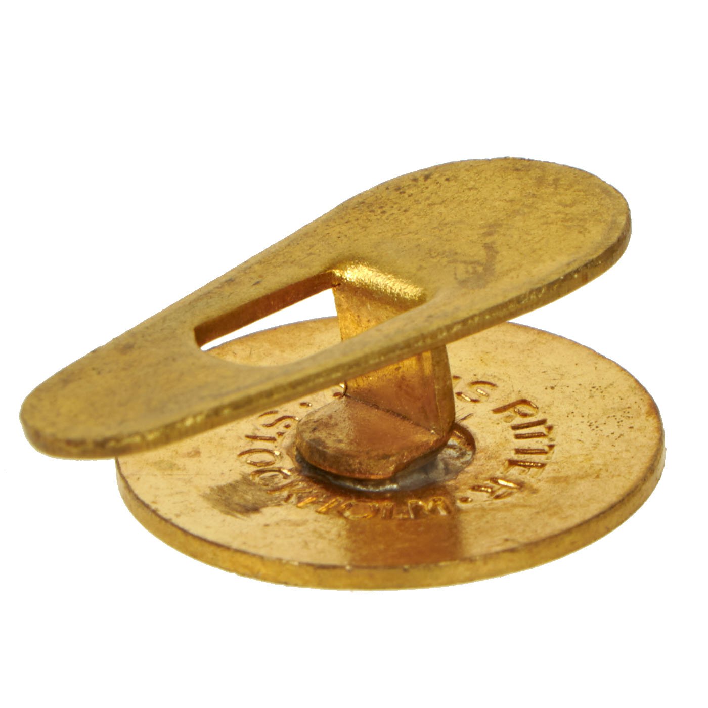 The back shows a very nice "button hole" style pin attachment, which could fit in pretty much any button hole on a jacket, shirt, and so forth. There is also maker mark ALOIS RITTER / STOCKHOLM on the back of the badge, partly hidden by the button hole retainer.