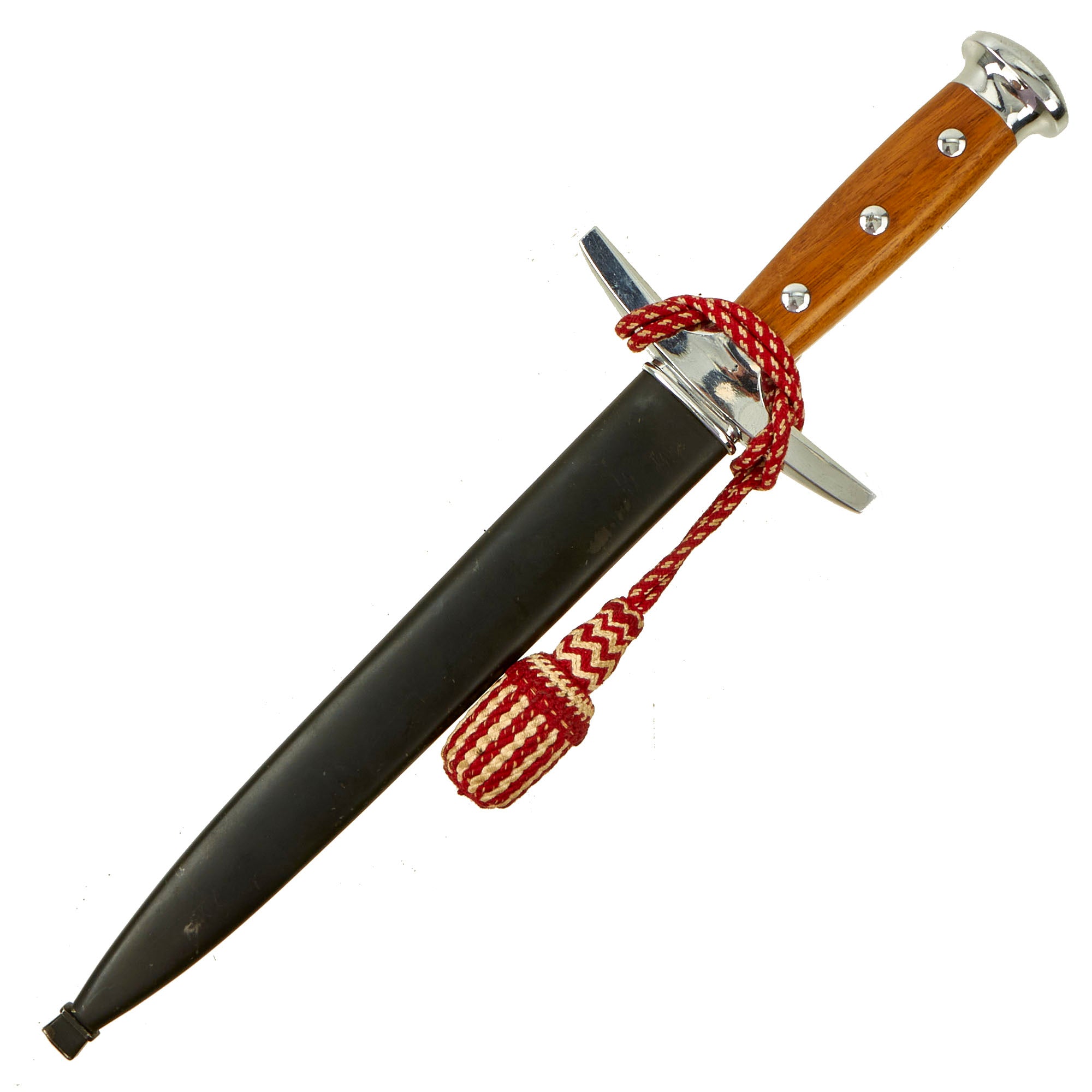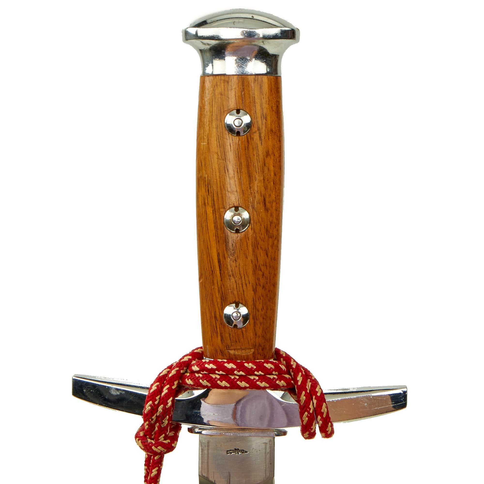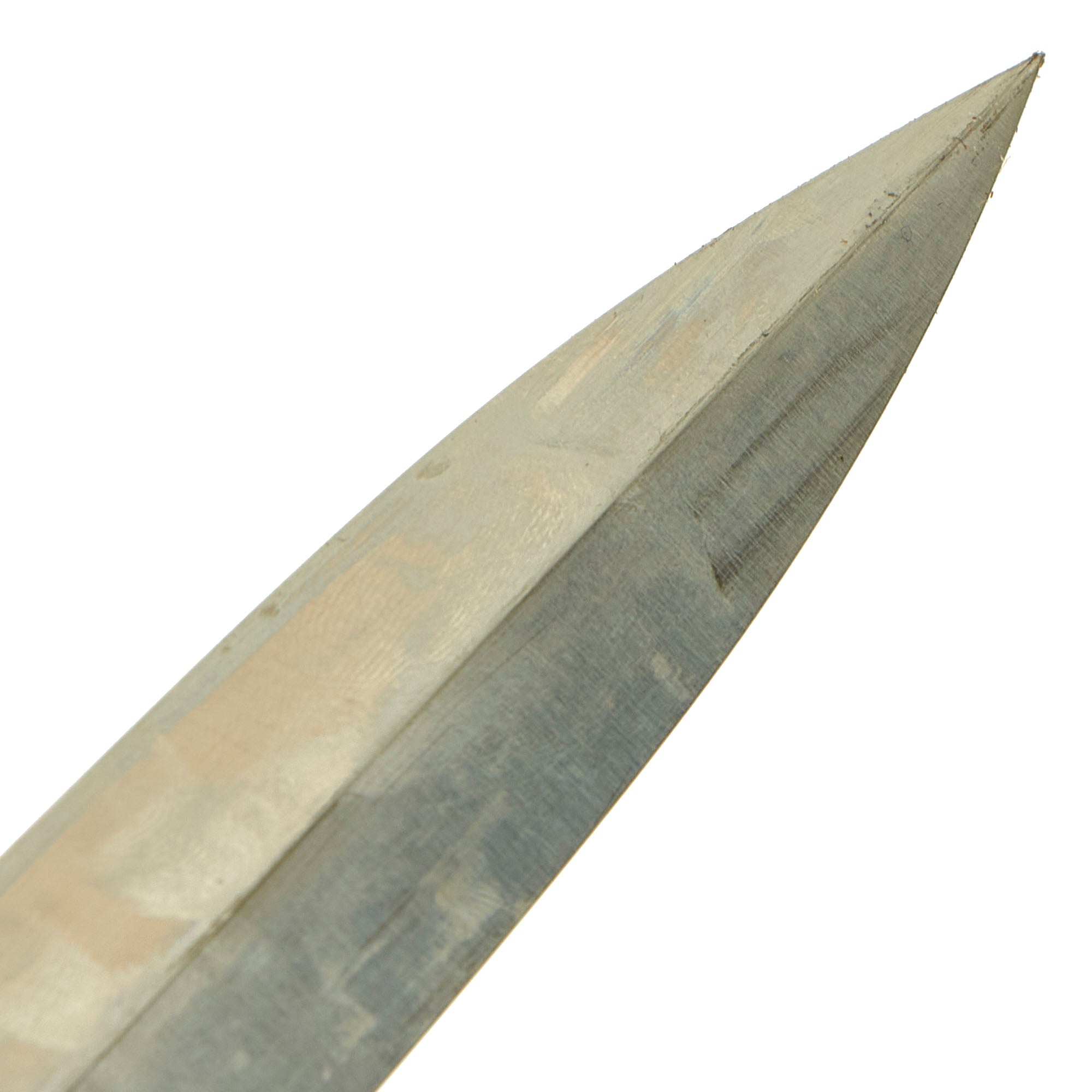 The dagger features a spear point double edged blade, with a "stiletto" dagger type profile showing a center ridge. This is attached to a nickel plated alloy handle with a wide crossguard, fitted with fruit wood grips secured by three bolts with split nuts. The pommel is secured by a keyed nut. The dagger is in excellent condition, showing only light wear from storage, and the blade still shows virtually all of the original factory final grind cross grain, very similar to those on German WWII daggers. The original edge is still present and sharp. With the total absence of rust, we believe the blade is most likely Stainless Steel, the material usually used to make these daggers.